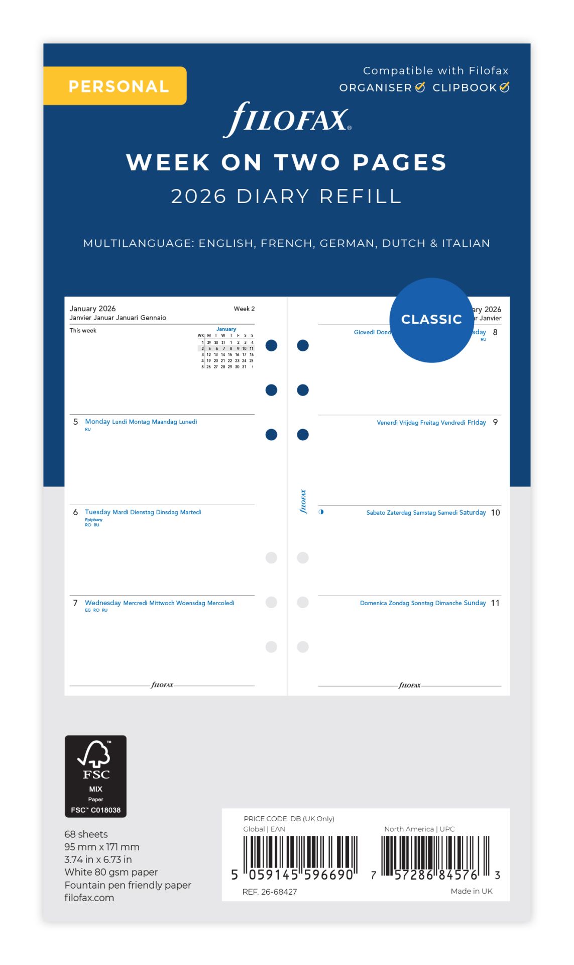 Filofax Agendavulling 2026 Personal 1week/2pag 9.5x17.1 cm