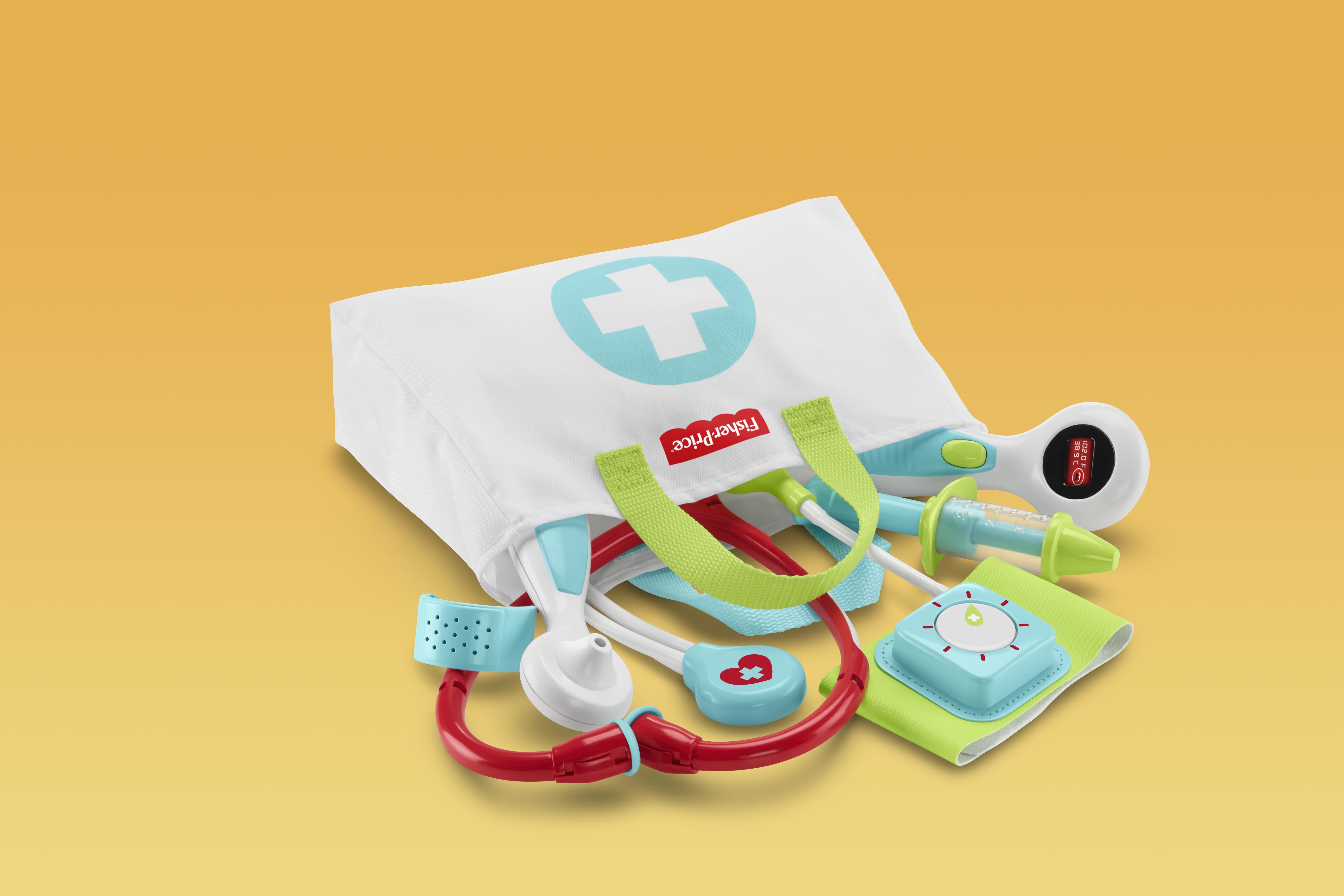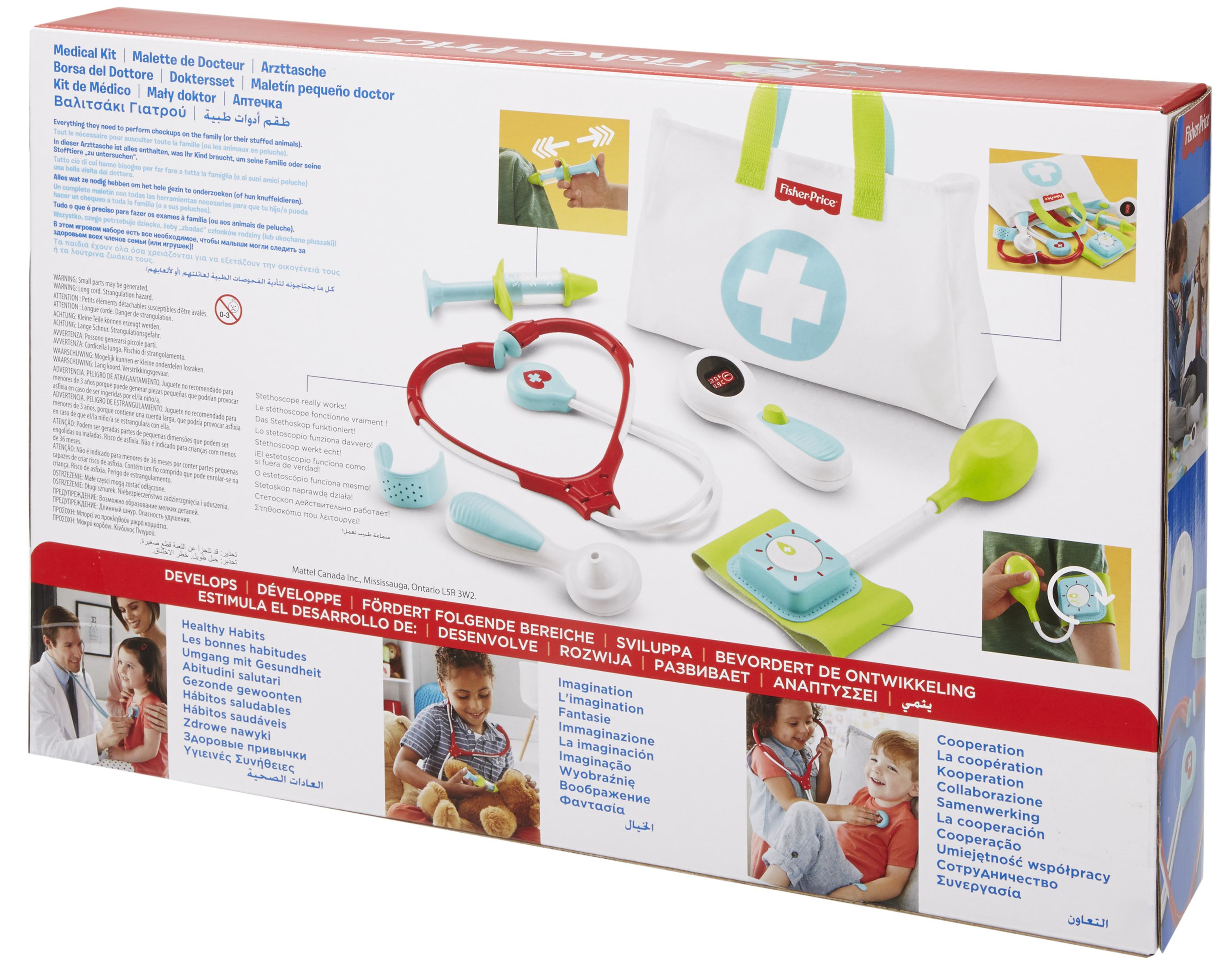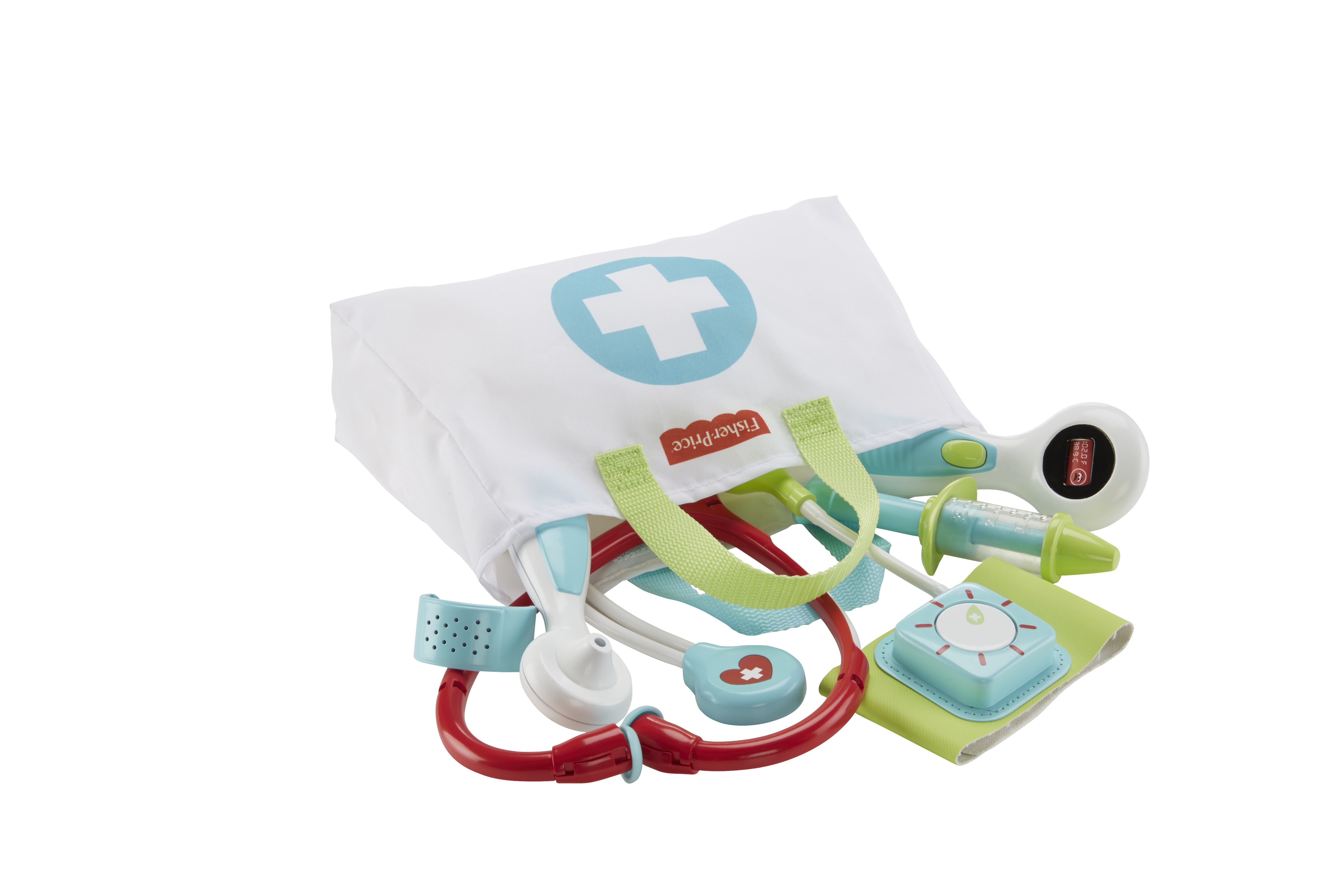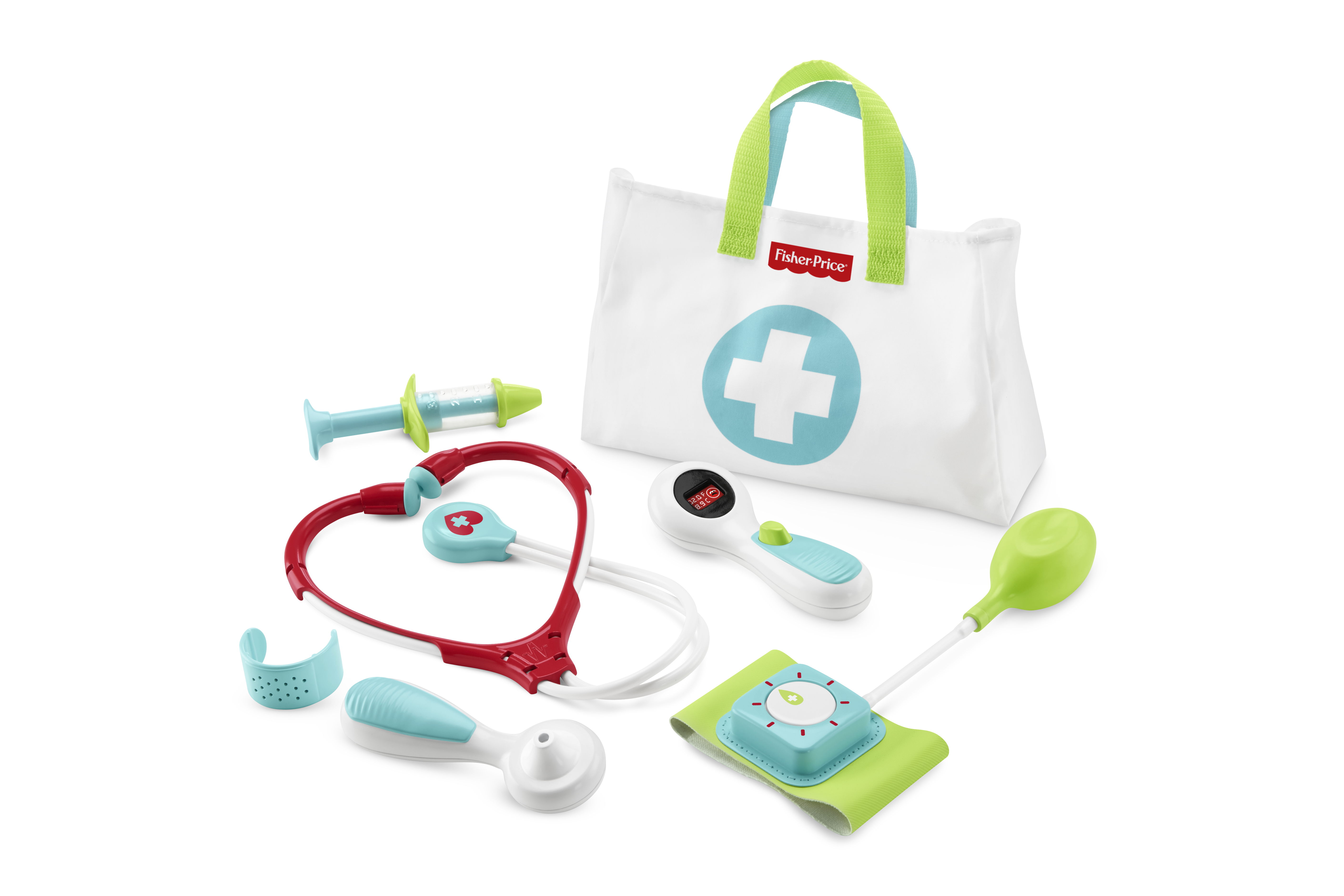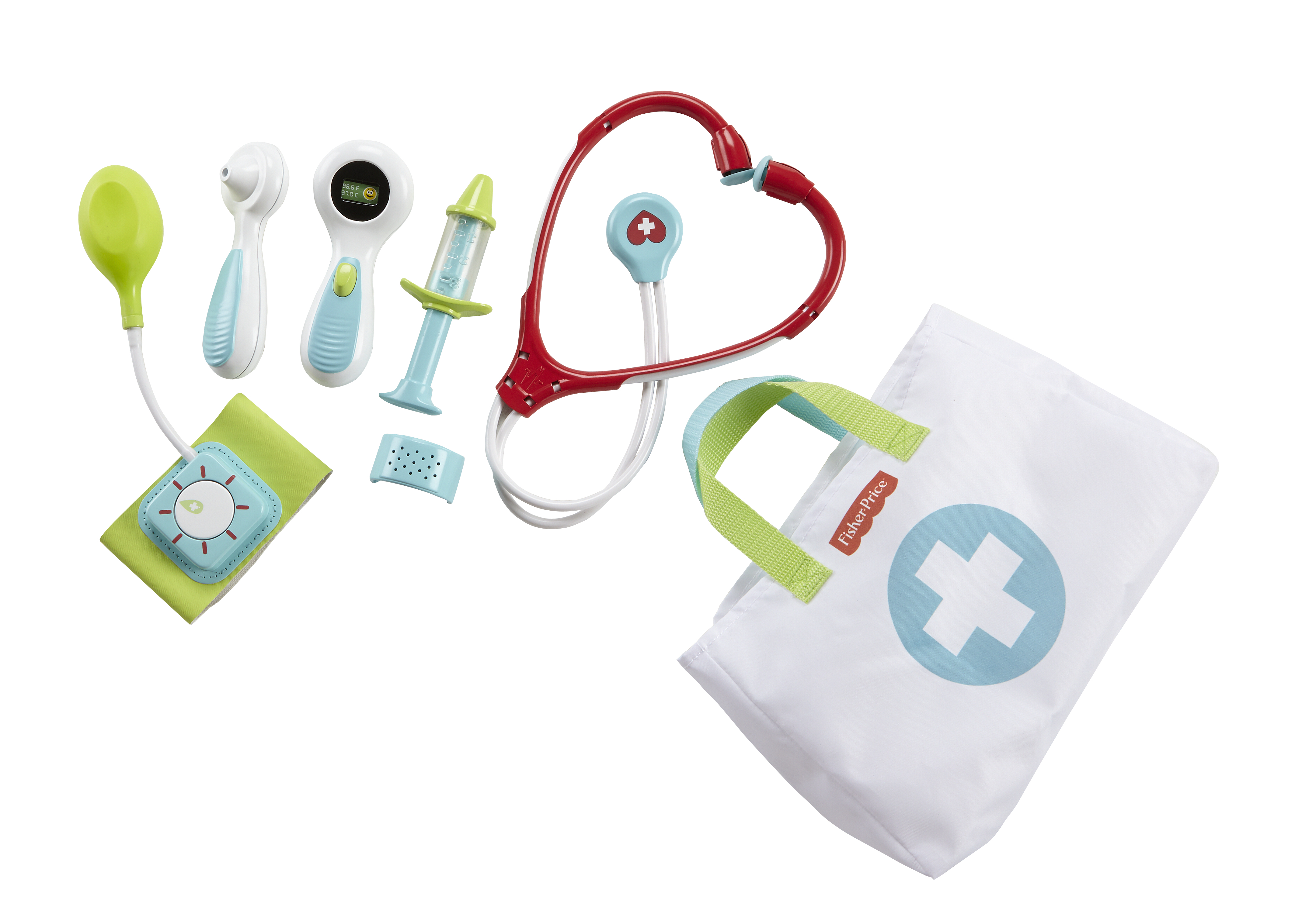 Met de Fisher-Price Doktersset kunnen kleuters hun witte jas aantrekken en meteen onderzoeken hoe leuk het is om een rollenspel als dokter te spelen. Kleine dokters kunnen met de stethoscoop naar het hart van een patiënt 'luisteren', hun temperatuur 'opnemen' met de thermometer (druk op het knopje om van 'ziek' naar 'beter' te gaan!), een kijkje in de oren van de patiënt nemen met de oorspiegel of de bloeddrukmeter oppompen en het wijzertje zien ronddraaien! Verbind de pijnlijke plek en je patiënt is weer helemaal beter. Met de speelgoedspuit is het ook helemaal niet erg om een prikje te krijgen.