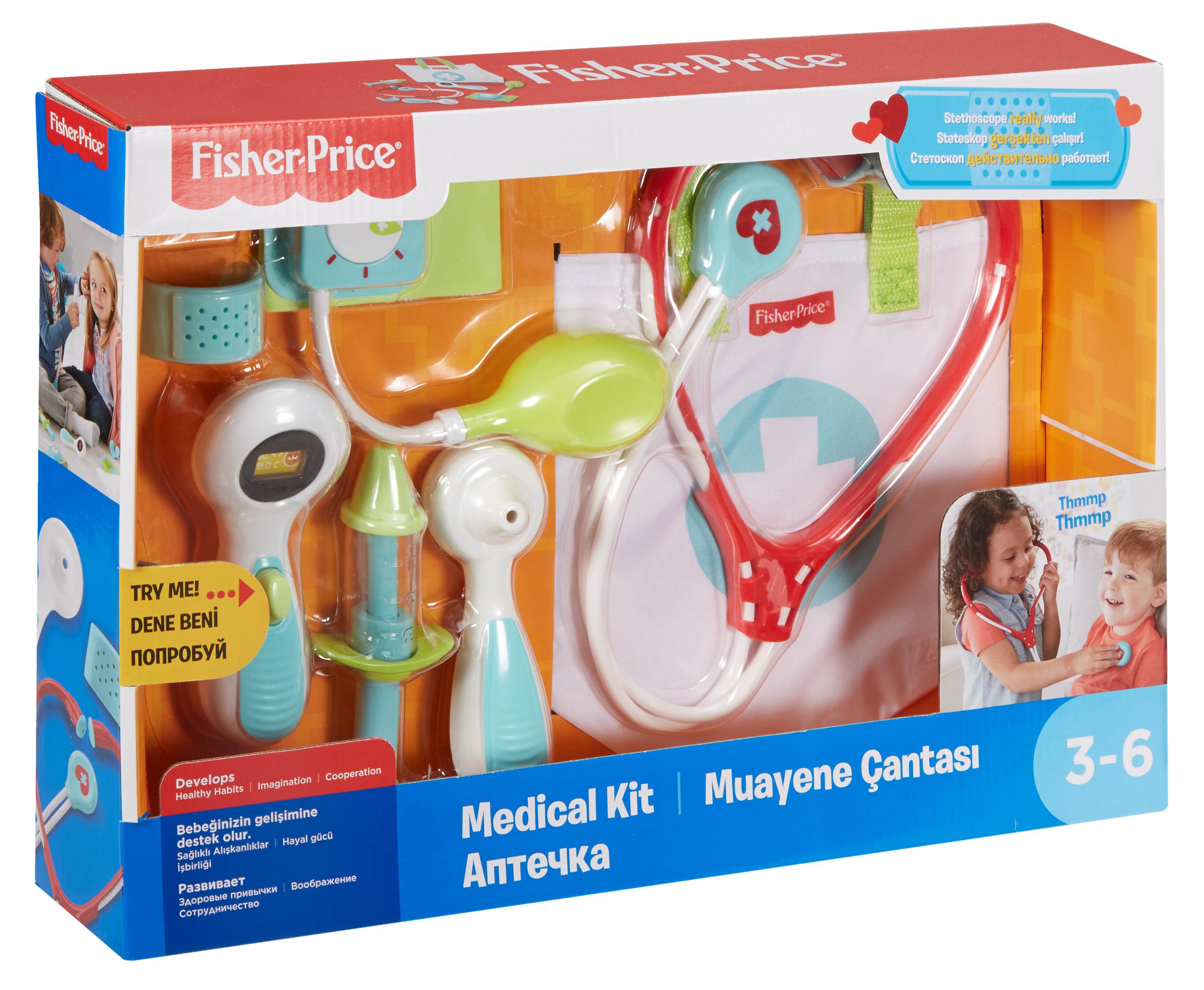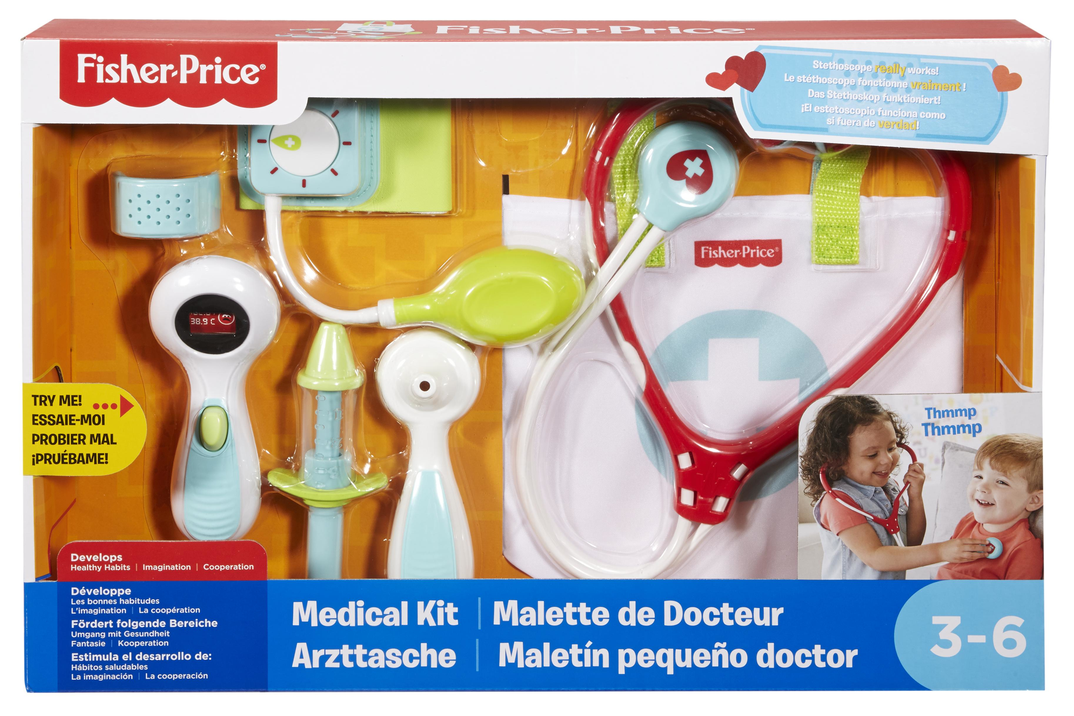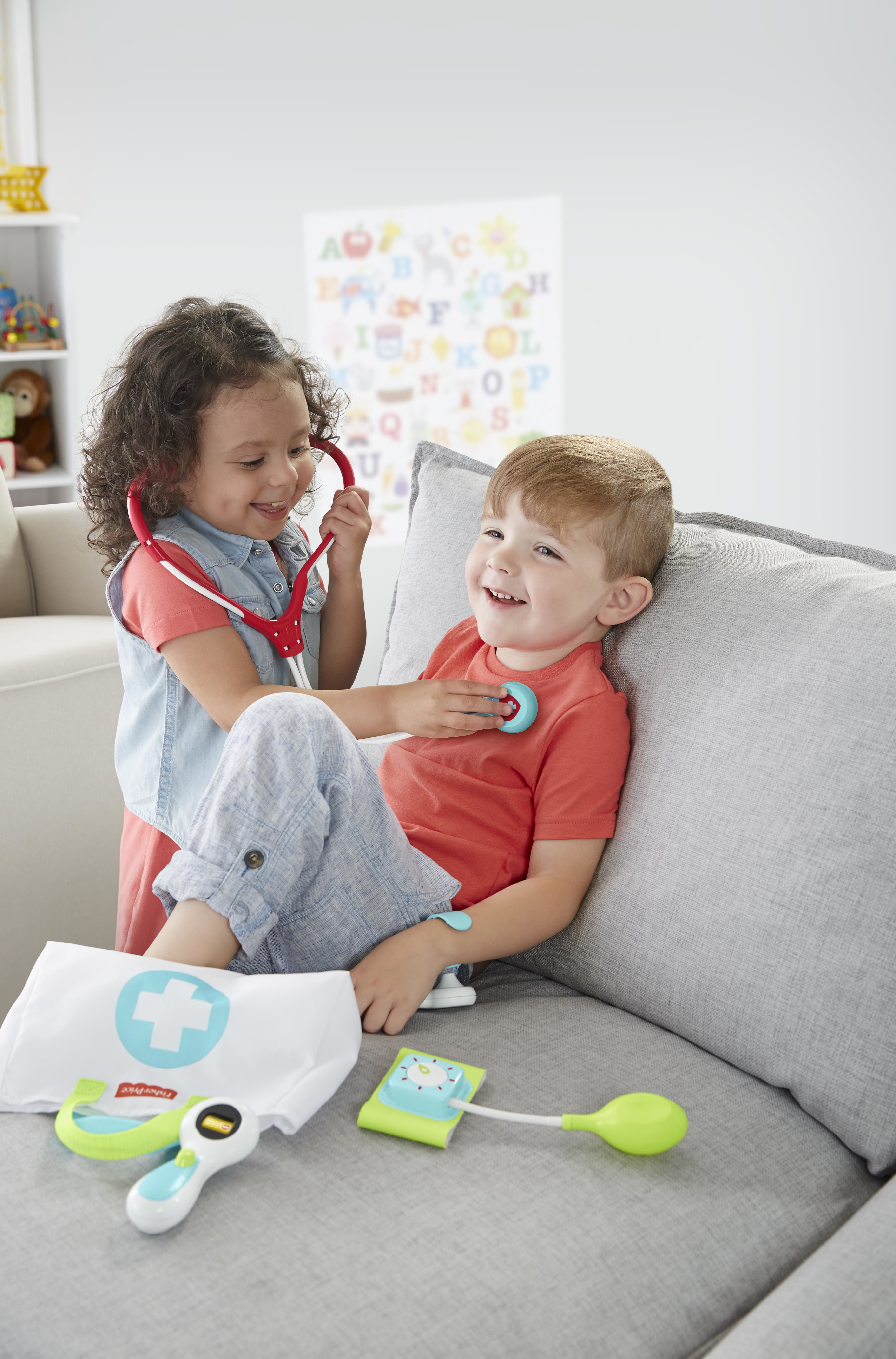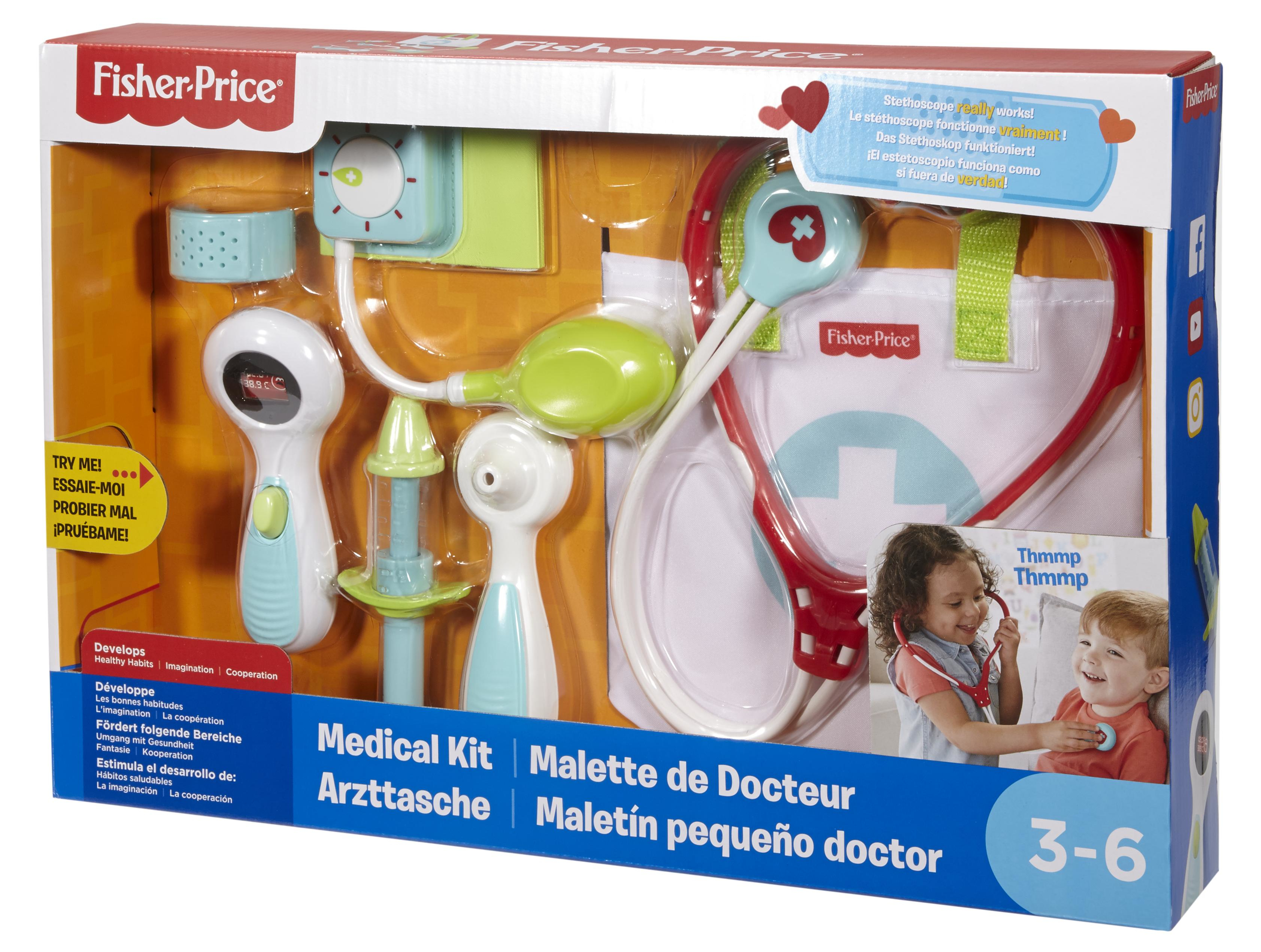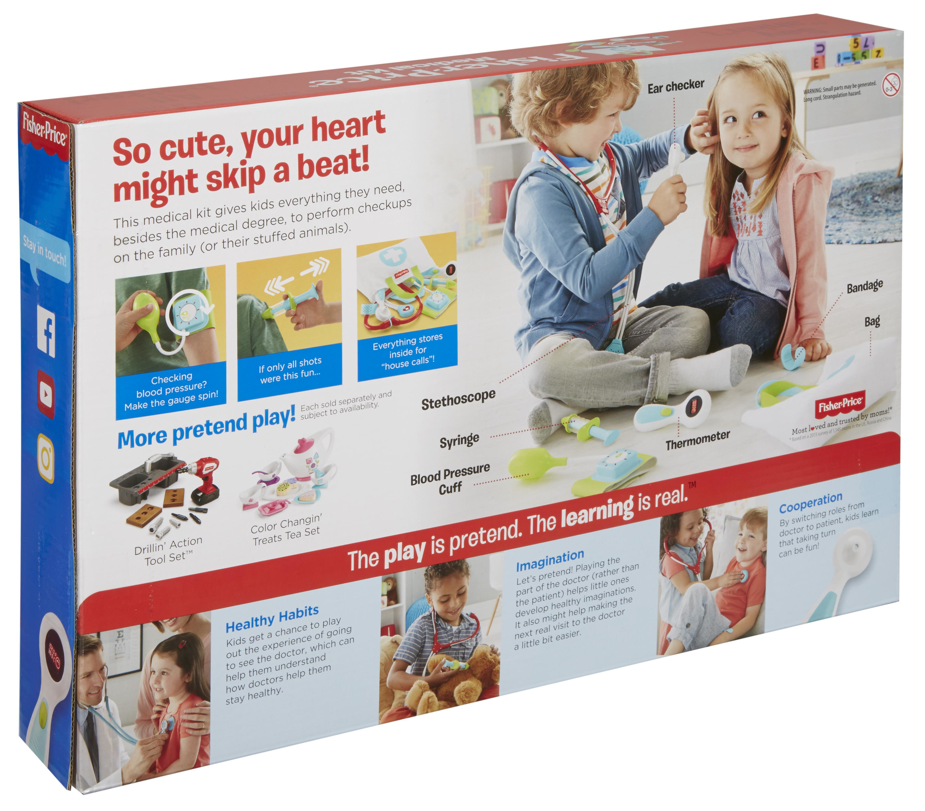 Met de Fisher-Price Doktersset kunnen kleuters hun witte jas aantrekken en meteen onderzoeken hoe leuk het is om een rollenspel als dokter te spelen. Kleine dokters kunnen met de stethoscoop naar het hart van een patiënt 'luisteren', hun temperatuur 'opnemen' met de thermometer (druk op het knopje om van 'ziek' naar 'beter' te gaan!), een kijkje in de oren van de patiënt nemen met de oorspiegel of de bloeddrukmeter oppompen en het wijzertje zien ronddraaien! Verbind de pijnlijke plek en je patiënt is weer helemaal beter. Met de speelgoedspuit is het ook helemaal niet erg om een prikje te krijgen.