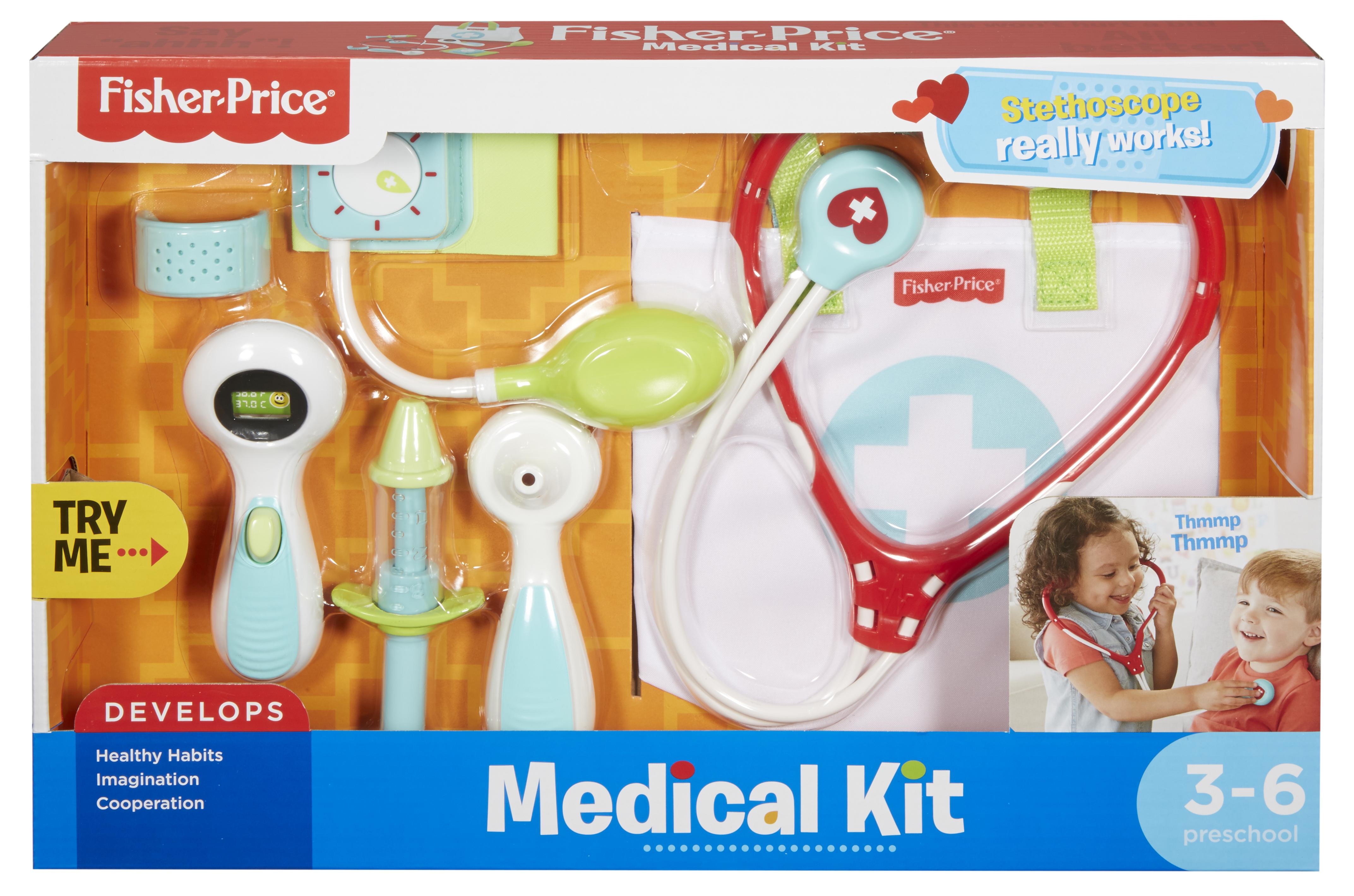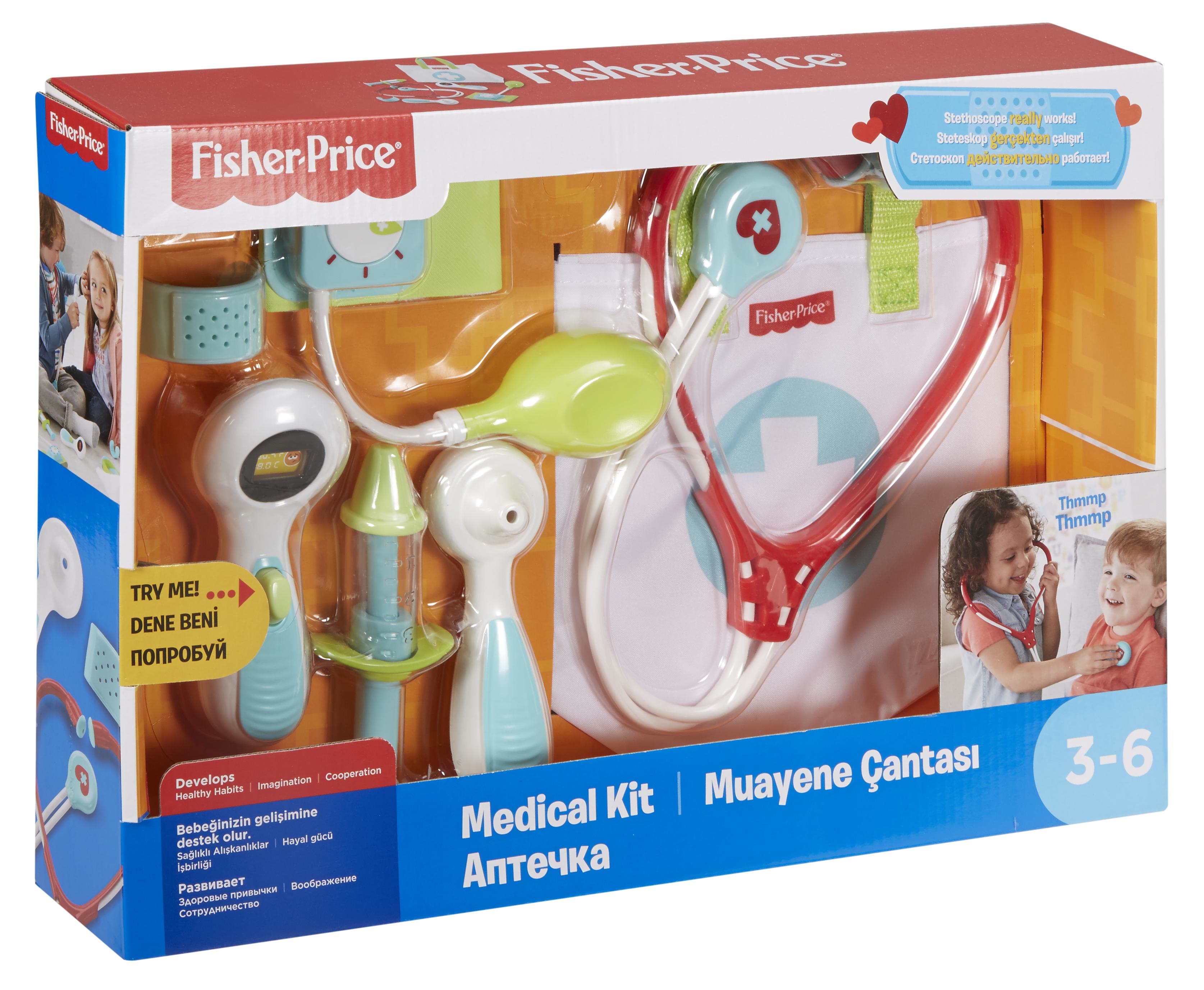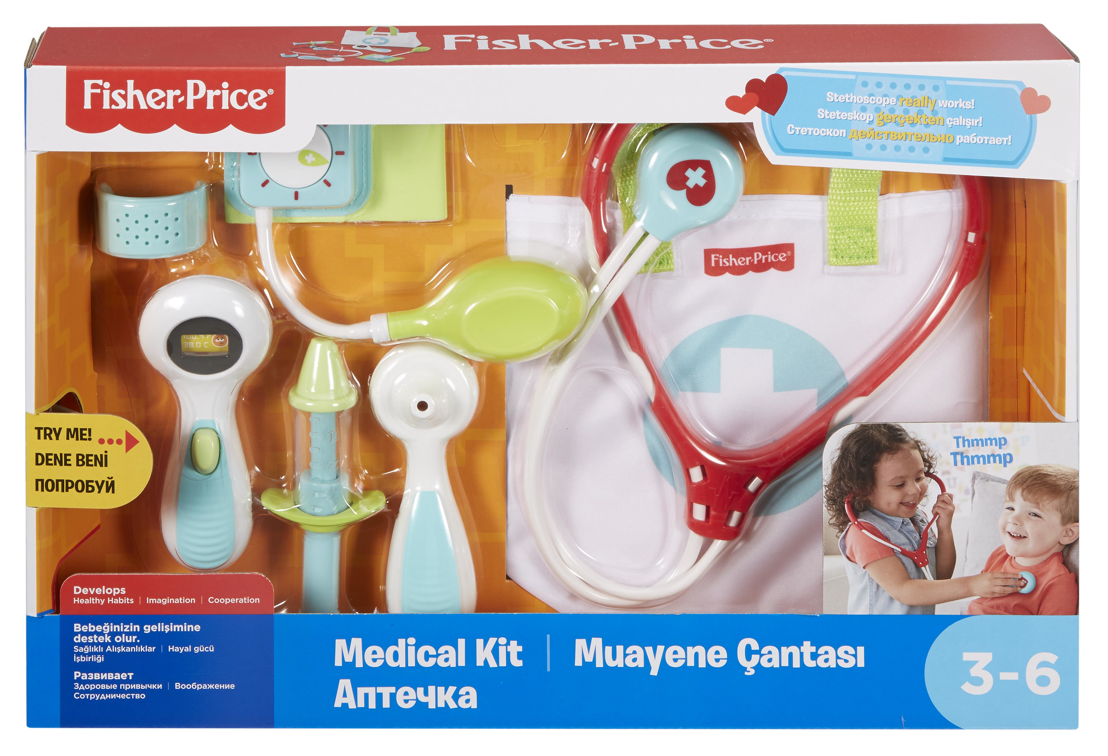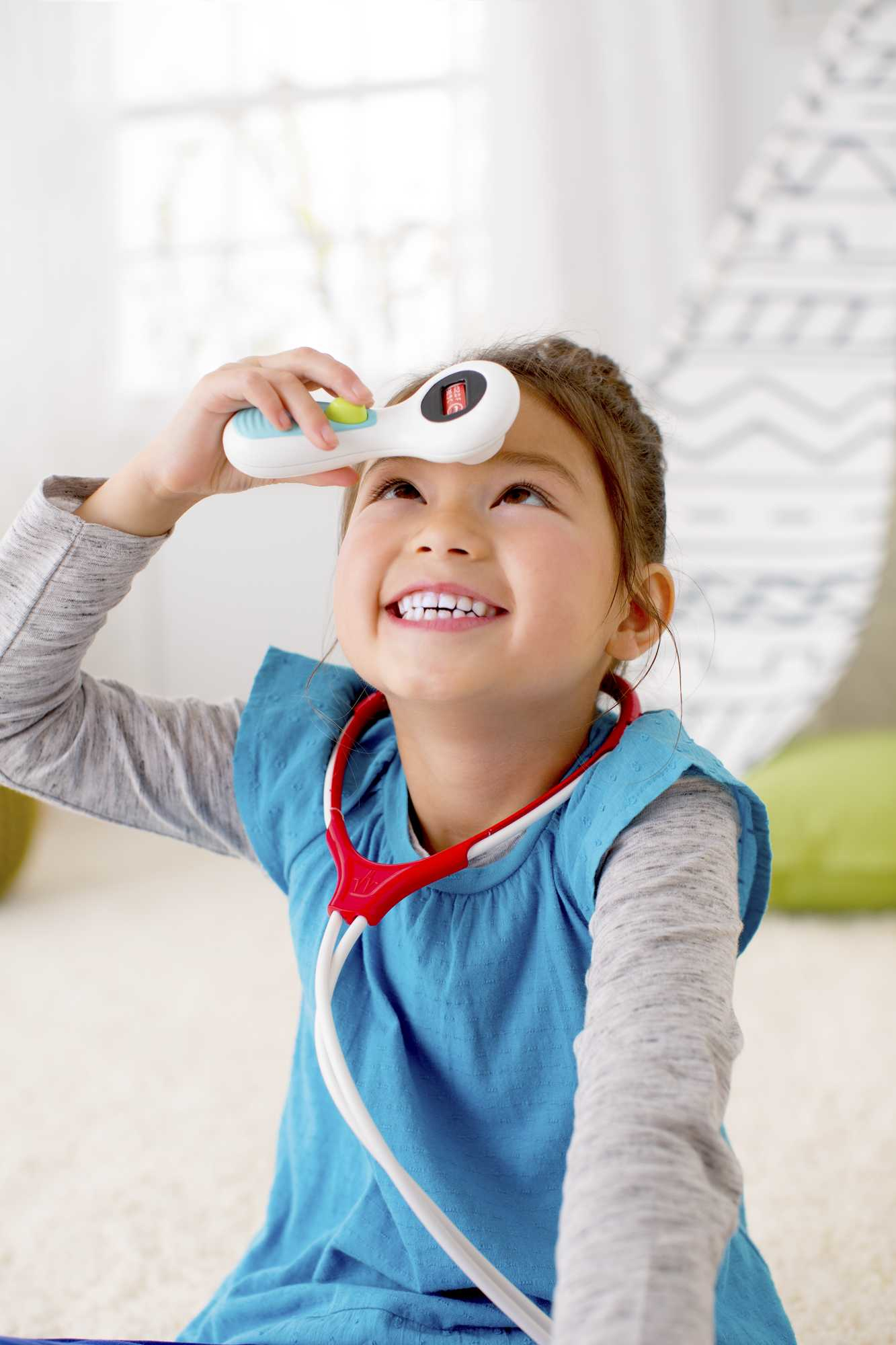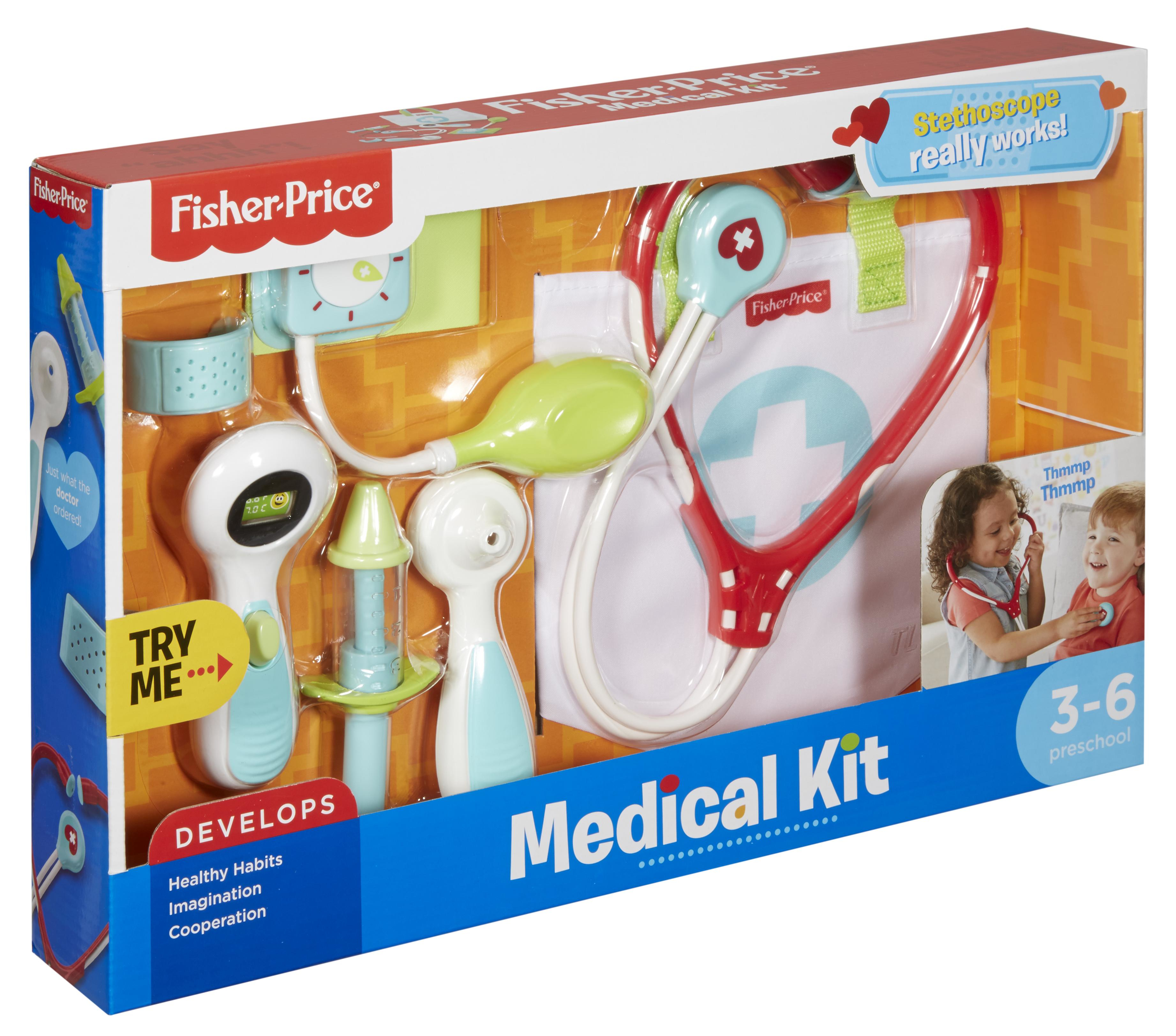Met de Fisher-Price Doktersset kunnen kleuters hun witte jas aantrekken en meteen onderzoeken hoe leuk het is om een rollenspel als dokter te spelen. Kleine dokters kunnen met de stethoscoop naar het hart van een patiënt 'luisteren', hun temperatuur 'opnemen' met de thermometer (druk op het knopje om van 'ziek' naar 'beter' te gaan!), een kijkje in de oren van de patiënt nemen met de oorspiegel of de bloeddrukmeter oppompen en het wijzertje zien ronddraaien! Verbind de pijnlijke plek en je patiënt is weer helemaal beter. Met de speelgoedspuit is het ook helemaal niet erg om een prikje te krijgen.