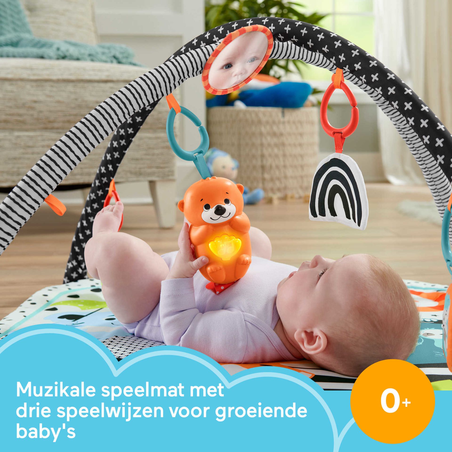 De speelmat bevat 5 activiteitenspeeltjes: een otter met een zachte staart, muziek en licht, een spiegel waarmee je baby zichzelf kan ontdekken, een egeltje dat zachtjes rammelt, een BPA-vrije bijtring in de vorm van een slak, en een dubbelzijdig, ritselend regenboogspeeltje
