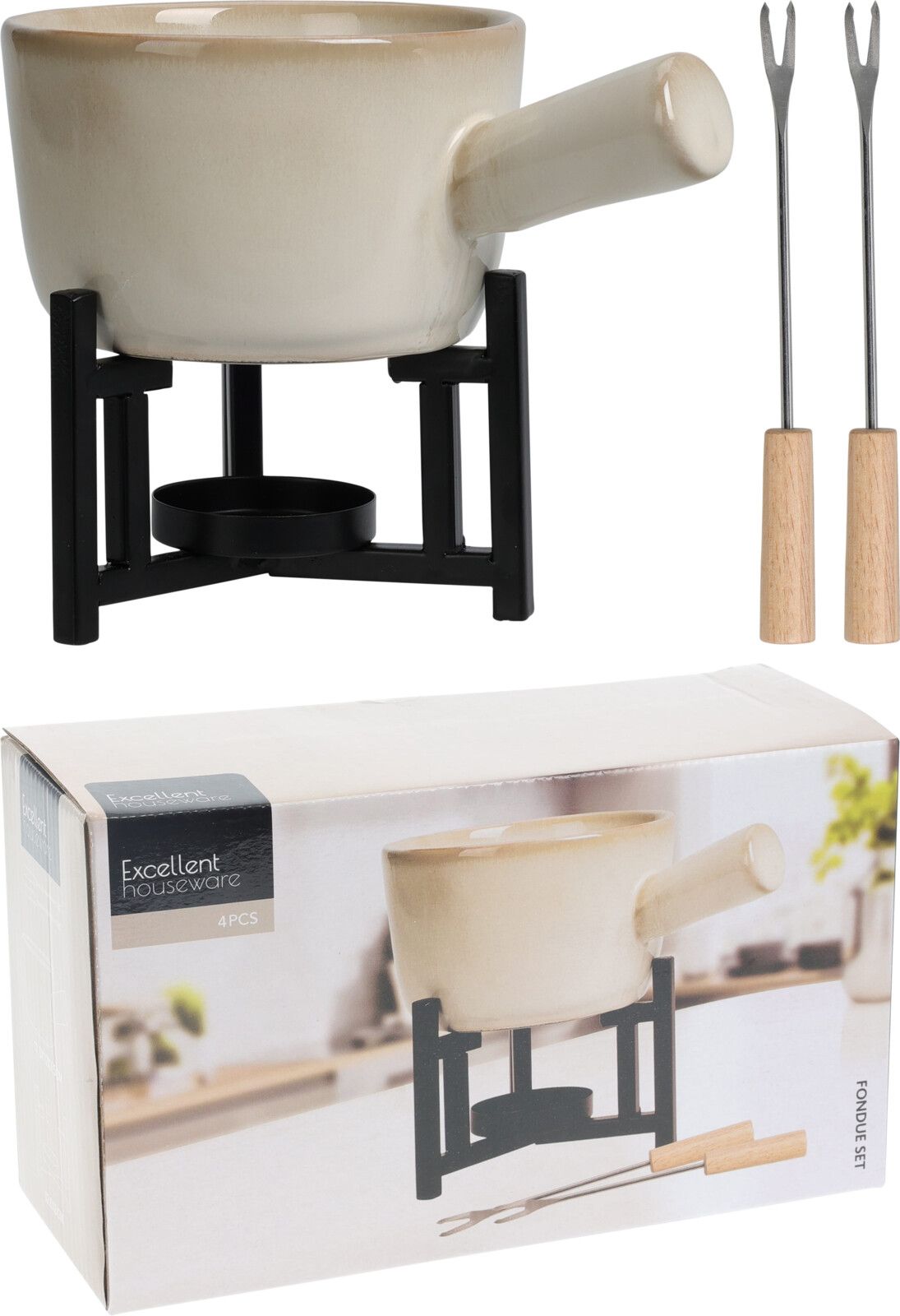 Fondueset 4-delig - Porselein/Metalen Stand - 8x17.6 cm - RVS - Porseleinen Pot/Metalen Onderstel/2 Fonduevorken