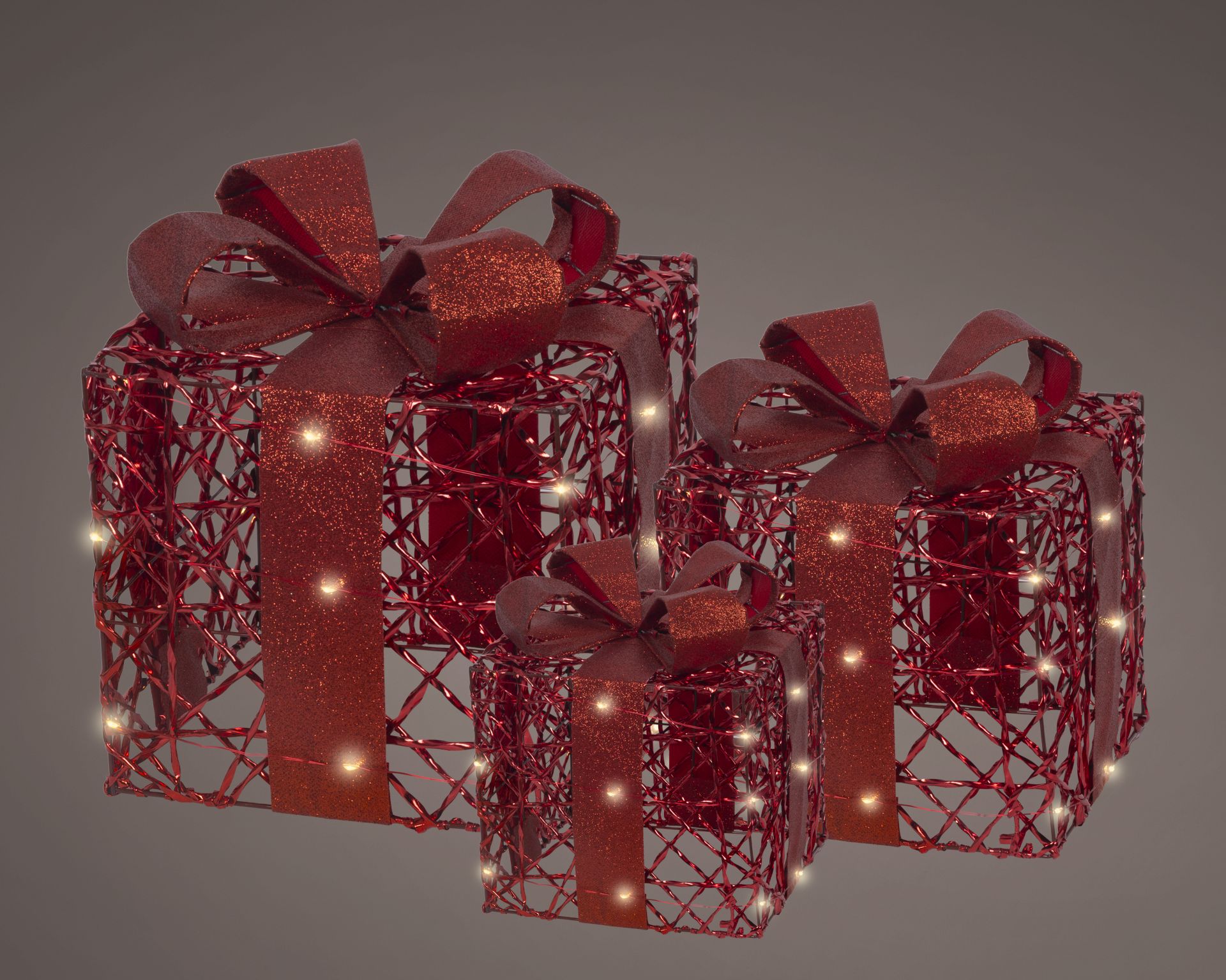 Geschenkdoos Rood Micro LED met Strik set 3 stuks - Warm Wit - 3 Groottes in Set - Metaal - Indoor