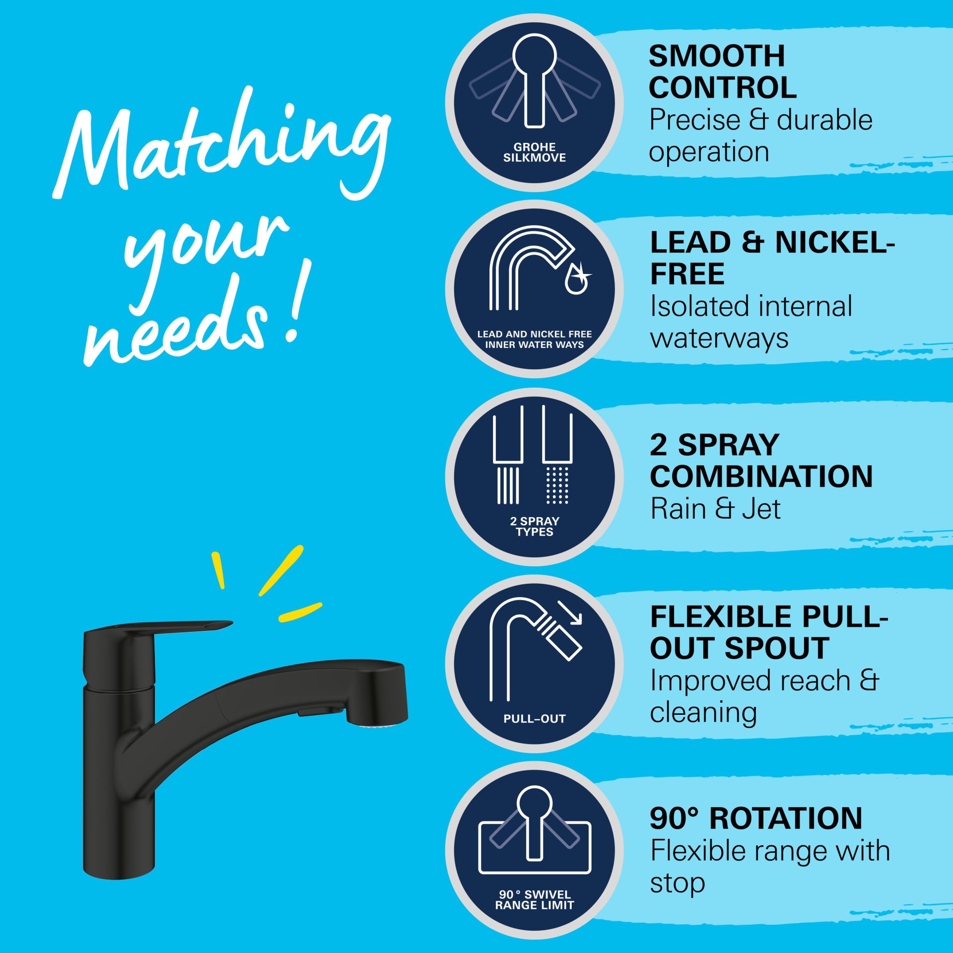 Met GROHE SpeedClean kun je de sproeikoppen met slechts een veeg van je vinger kalkvrij maken. De uitloop draait soepel 90˚ voor extra gemak in krappe ruimtes. De GROHE SilkMove cartouche technologie zorgt levenslang voor een soepele en nauwkeurige bediening. Geïsoleerde interne waterwegen zorgen ervoor dat het water in de kraan lood- en nikkelvrij is. Een instelbare debietbegrenzer bespaart water, terwijl een geïntegreerde temperatuurbegrenzer energie bespaart.