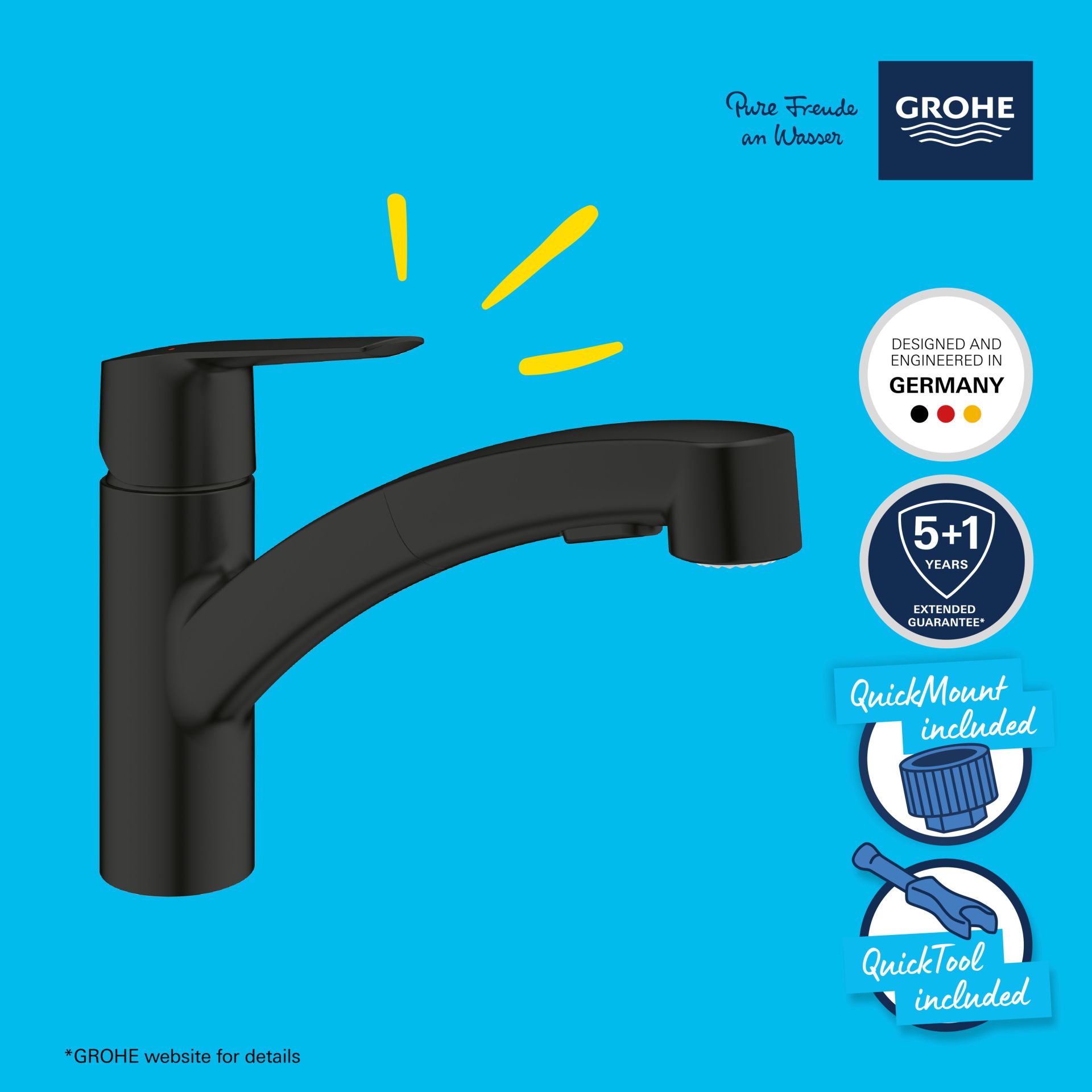 De GROHE Long-Life Shine afwerking is slijtvast voor een oogverblindend oppervlak dat lang meegaat. De kraan is ontworpen voor eengatsinstallatie en kan met behulp van de QuickGuide, de QuickVideo via QR-code en het GROHE QuickMount-systeem in een handomdraai worden gemonteerd. Voor deze kraan wordt een minimale druk van 1,0 bar aanbevolen.