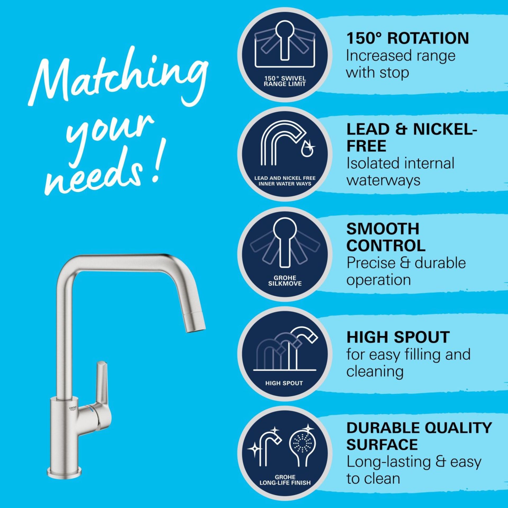 De GROHE Start eengreeps keukenkraan met hoge U-uitloop helpt om je keuken weer up-to-date te maken dankzij de geweldige prestaties en slimme functies in een slank, moderner silhouet. Deze designklassieker is aangepast om te voldoen aan de eisen van moderne keukens en heeft een slank, modern profiel en een 35% hogere uitloop voor meer gebruikscomfort.