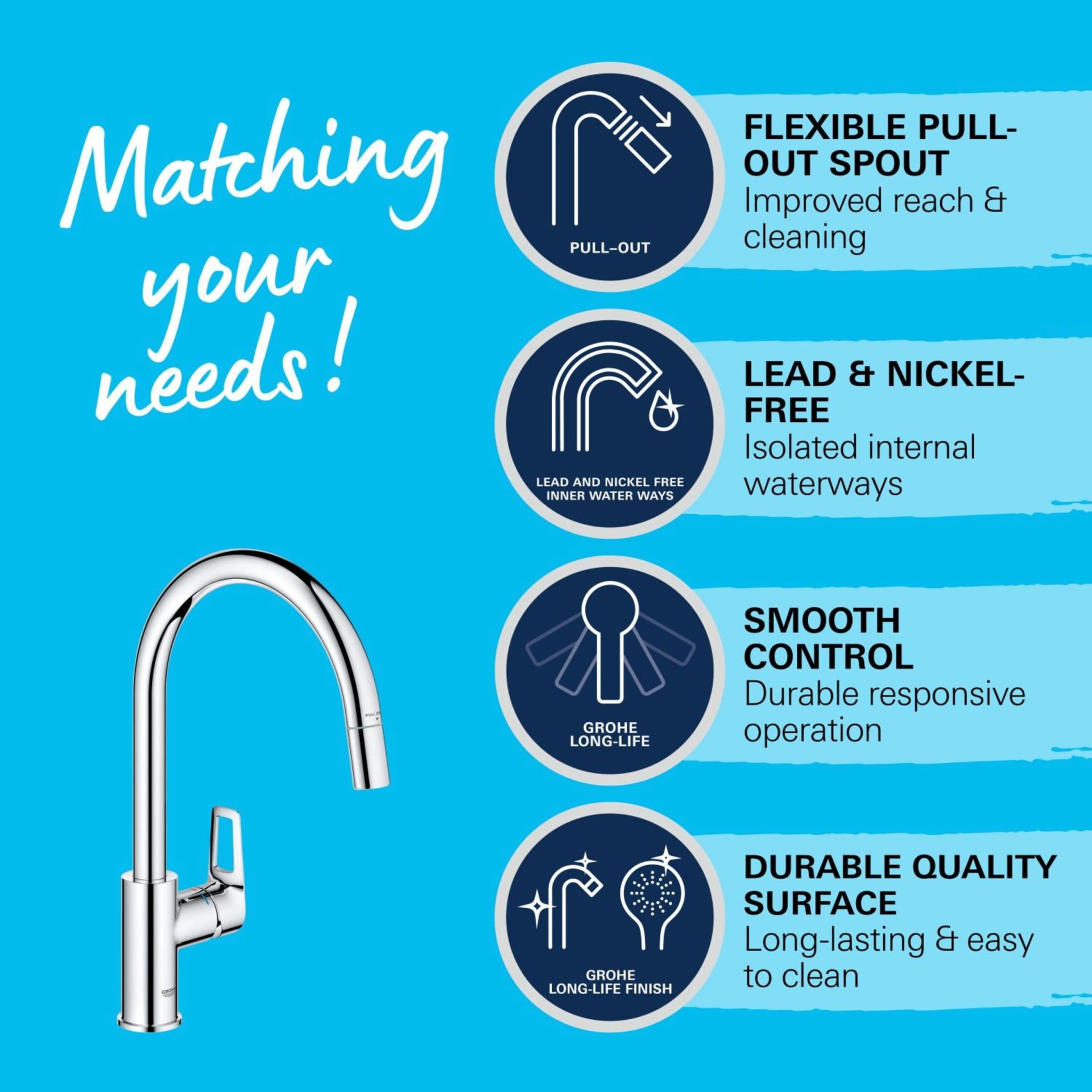 GROHE Long-Life 28 mm kardoes met keramische schijveninterne kanalen, waardoor het water niet met de legering in contact komtpull-out mousseur straalinstelbare doorstroombegrenzerdraaibare buisuitloopzwenkbereik 360°beveiligd tegen terugstromingflexibele aansluitslangen 3/8"GROHE FastFixation Plus 2.0GROHE QuickMount 2.0