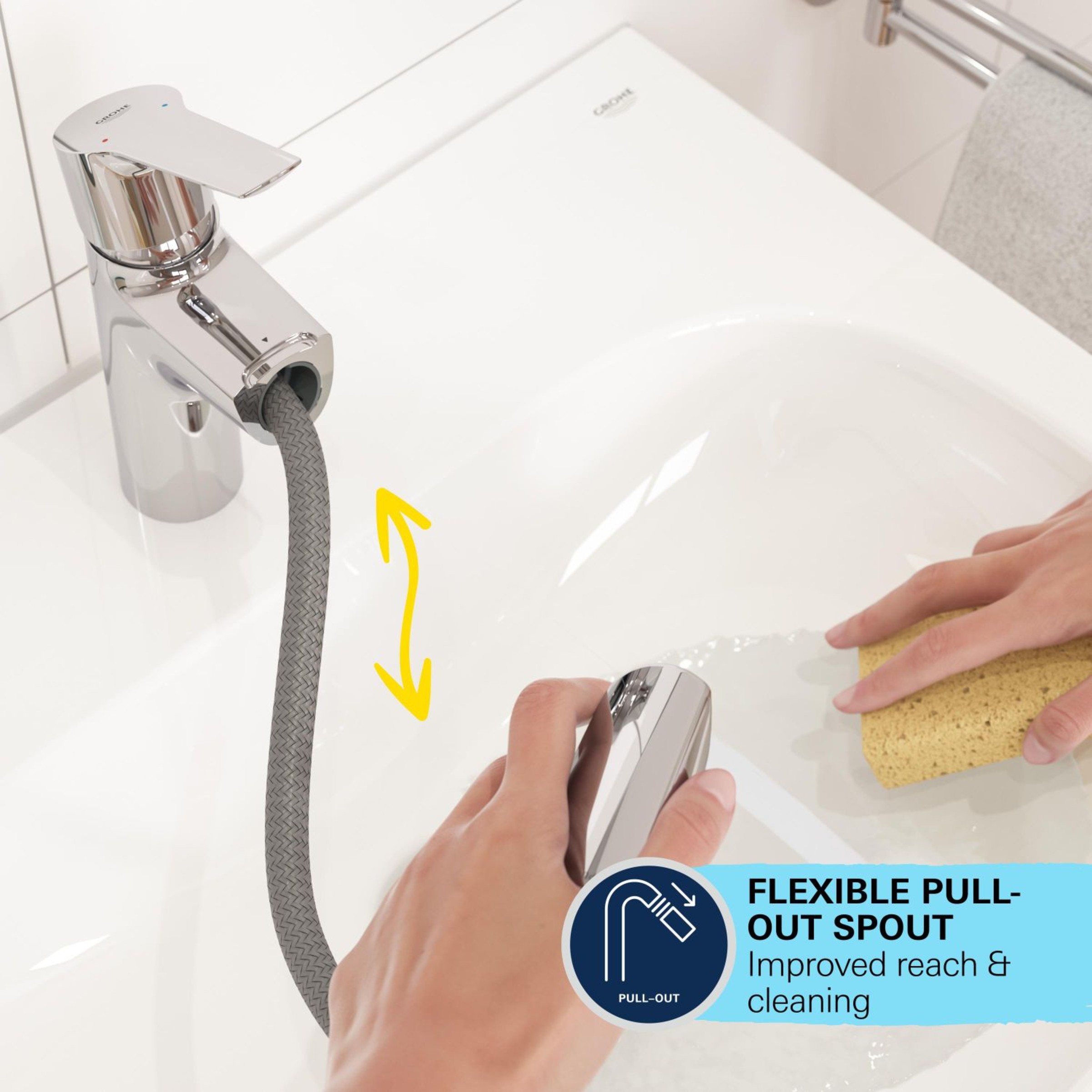 Met de waterbesparende GROHE Start wastafelkraan maak je jouw moderne badkamer helemaal up-to-date. Deze vernieuwde eengreeps wastafelkraan met handige pop-up waste is ontworpen voor een 1-gatsinstallatie en heeft een hogere uitloop, die tevens uittrekbaar is voor extra gebruiksgemak. Het wassen van je haren gaat voortaan moeiteloos onder de kraan en ook de wastafel maak je met de mousseur tot in de puntjes eenvoudig hygiënisch schoon. Na gebruik gaat de uittrekbare mousseur vanzelf weer terug op zijn plaats dankzij het GROHE Magnetic Docking systeem. Superhandig! Binnenin de kraan zorgt de GROHE SilkMove cartouche voor een soepele bediening van de solide metalen hendel, zodat je zonder haperen het watervolume en de temperatuur kunt regelen.