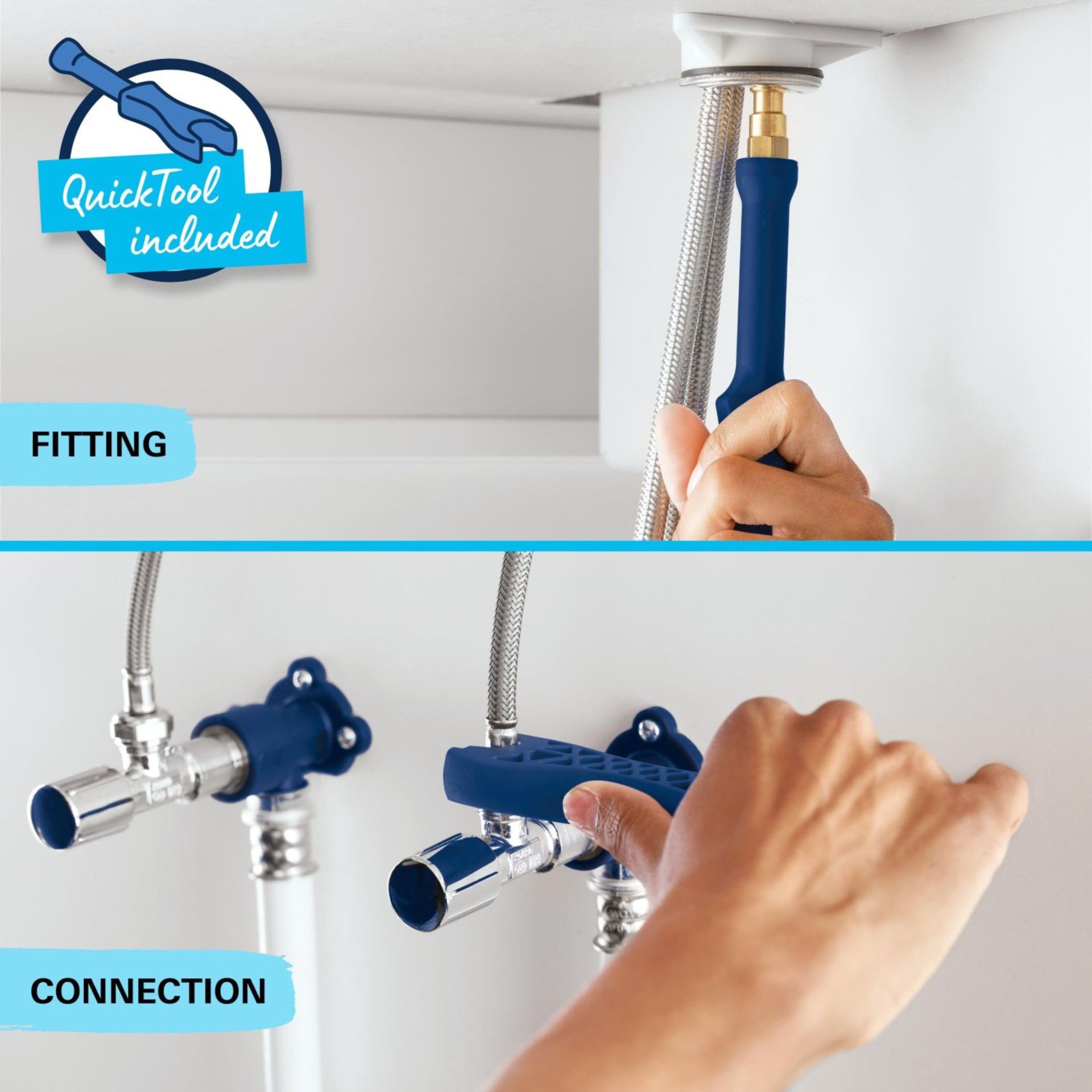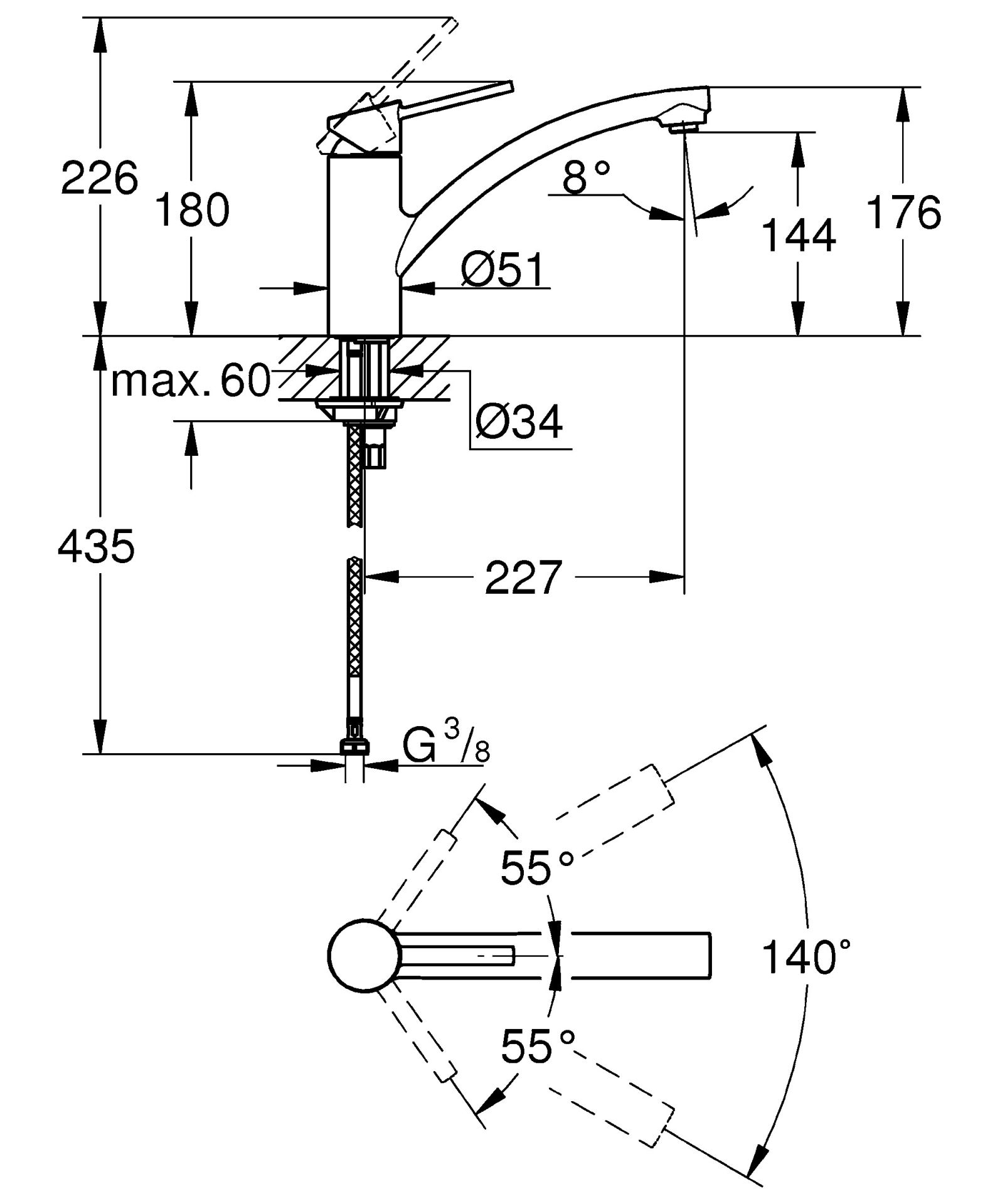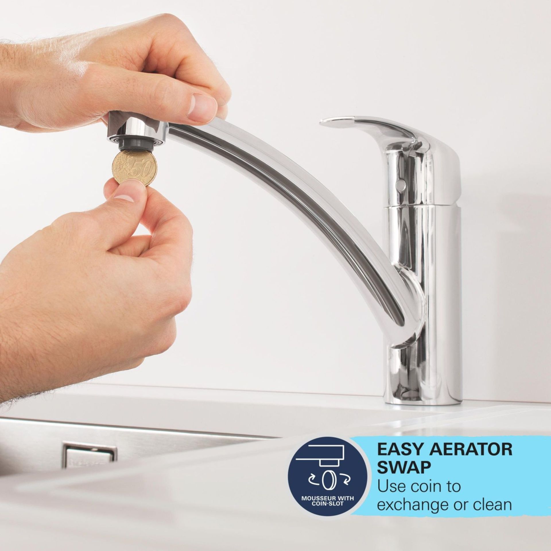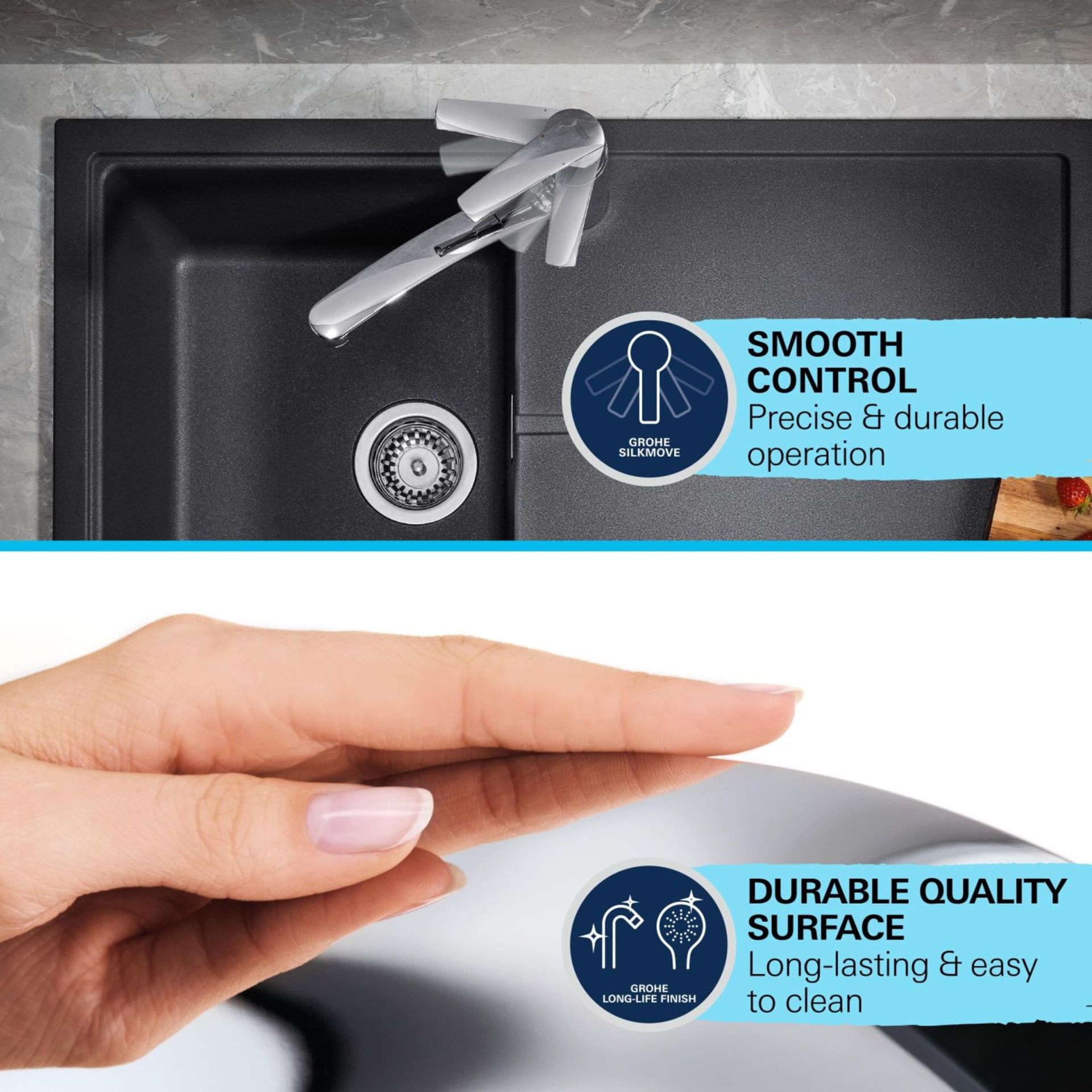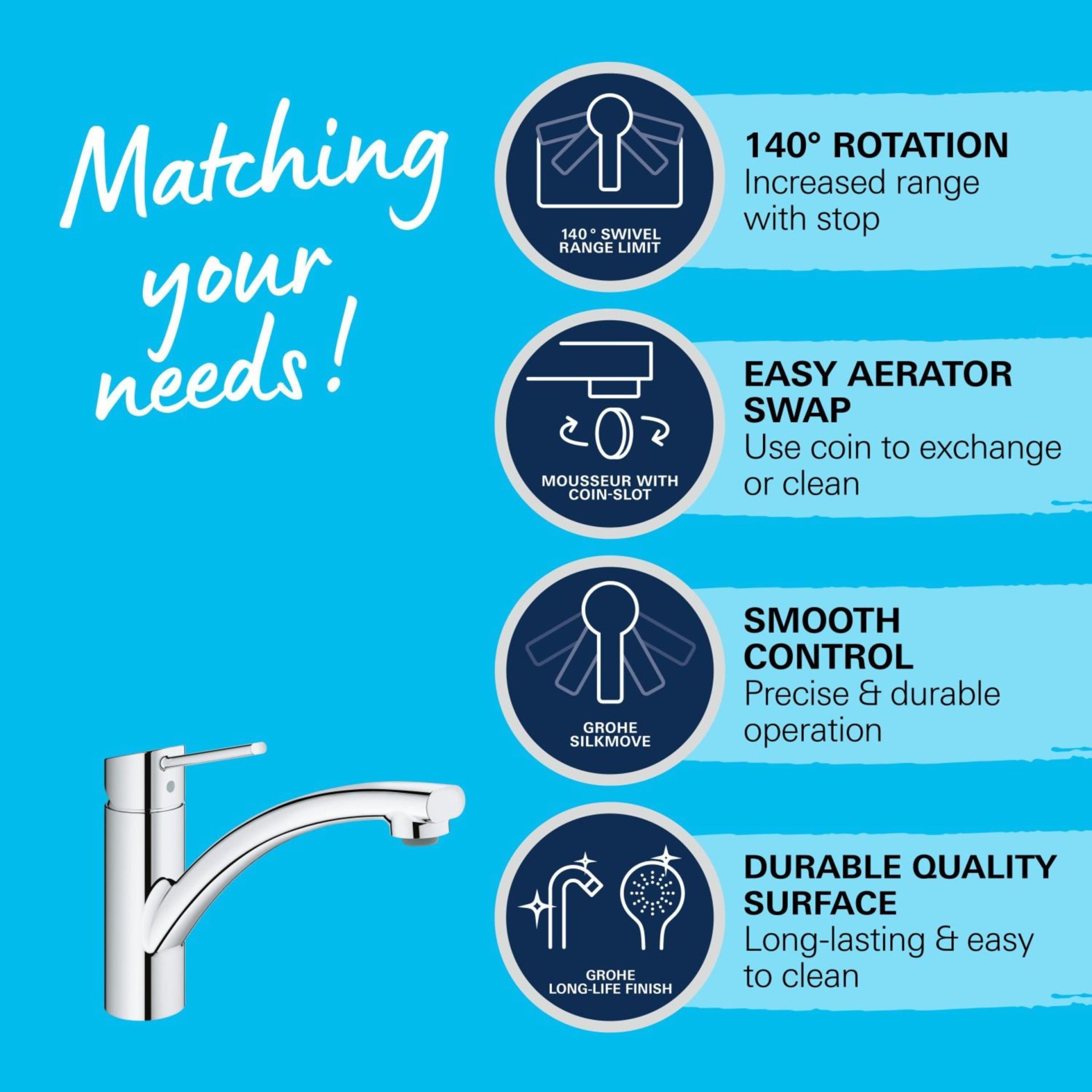 De GROHE Swift kraan bewijst dat goede kwaliteit niet altijd veel hoeft te kosten. Het bevat alle slimme technologie en precieze vervaardiging waardoor je ervan uit kan gaan dat je ultiem gebruiksgemak krijgt voor een aantrekkelijke prijs. De uitloop van de keukenmengkraan zwenkt soepel 140˚ voor comfort en gemak, ideaal voor keukens waar de ruimte beperkt is.De bediening van de hendel is intuïtief terwijl het keramische patroon van de GROHE SilkMove zorgt voor een nauwkeurige regeling van het volume en de temperatuur om jarenlang zonder problemen van te genieten. De geïntegreerde temperatuurbegrenzer en instelbare debietbegrenzer zijn slimme milieuvriendelijke functies. De Easy Exchange Aerator van de uitloop is eenvoudig los te schroeven voor onderhoud of vervanging. De discrete GROHE Zero afzonderlijke binnenwaterwegen zorgen ervoor dat je drinkwater altijd lood- en nikkelvrij is. Dankzij het gemakkelijk te installeren systeem met flexibele verbindingsslangen heb je de kraan in een mum van tijd geïnstalleerd. De prachtige, duurzame GROHE StarLight chromen afwerking zorgt ervoor dat deze keukenkraan er jarenlang perfect uit zal blijven zien.