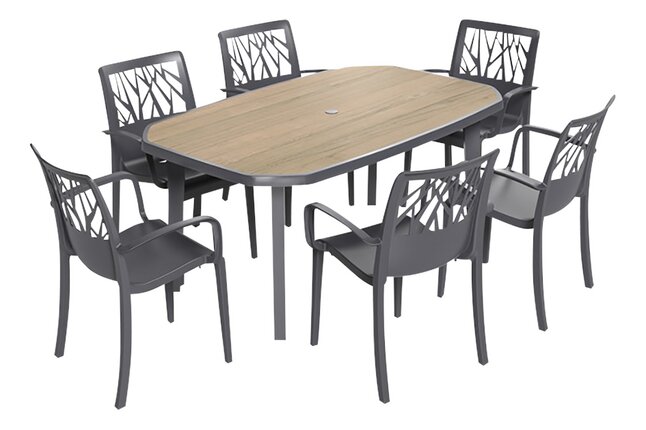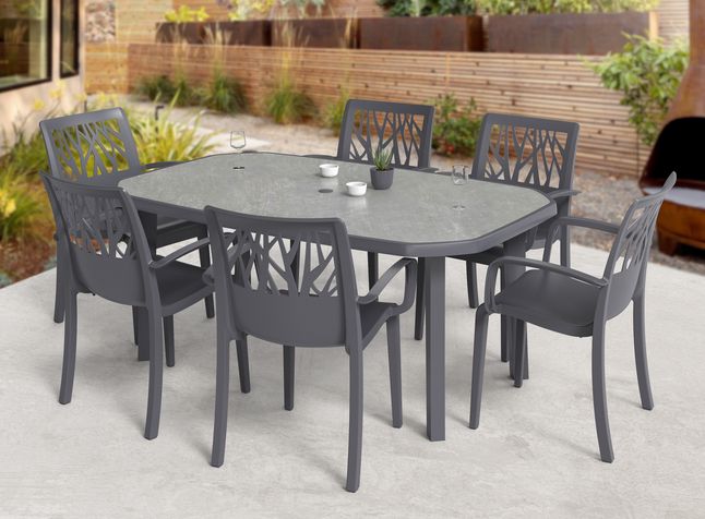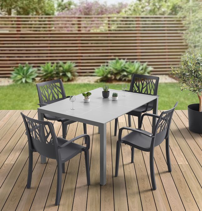 De Vegetal tuinstapelstoel van Grosfillex in PVC is een tuinstoel die een eigentijdse stijl uitstraalt met zijn op planten geïnspireerde rugleuning: een elegante afbeelding die de tuin viert door inspiratie te putten uit verstrengelde takken. . Het is ook zeer comfortabel dankzij de hoge en omhullende rugleuning.