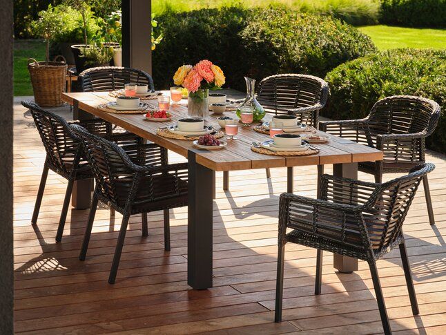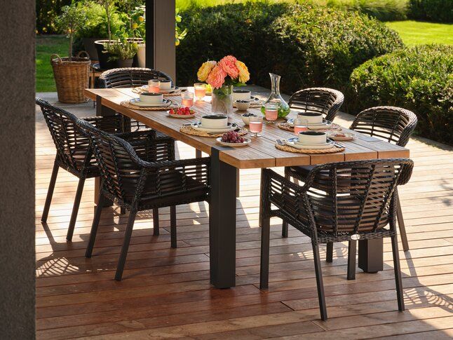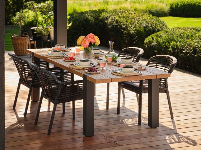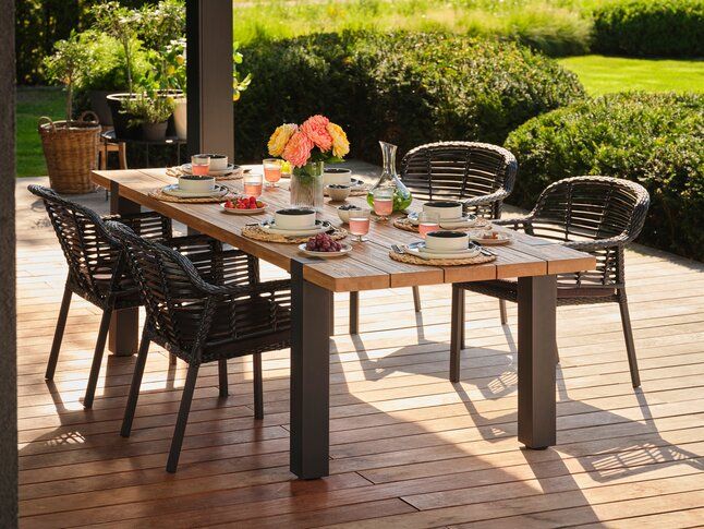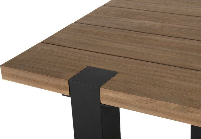 De Esmee tuintafel tafel nodigt je uit! Of het nu is voor ontbijt, lunch of diner... met de Esmee tuintafel zit je altijd goed. De Esmee heeft een robuuste en stoere uitstraling door de combinatie van teakhouten en aluminium poten. De tafel is ook gemakkelijk met vele tuinstoelen te combineren door haar natuurlijke uitstraling. De tafel kun je gerust het hele jaar door buiten laten staan.