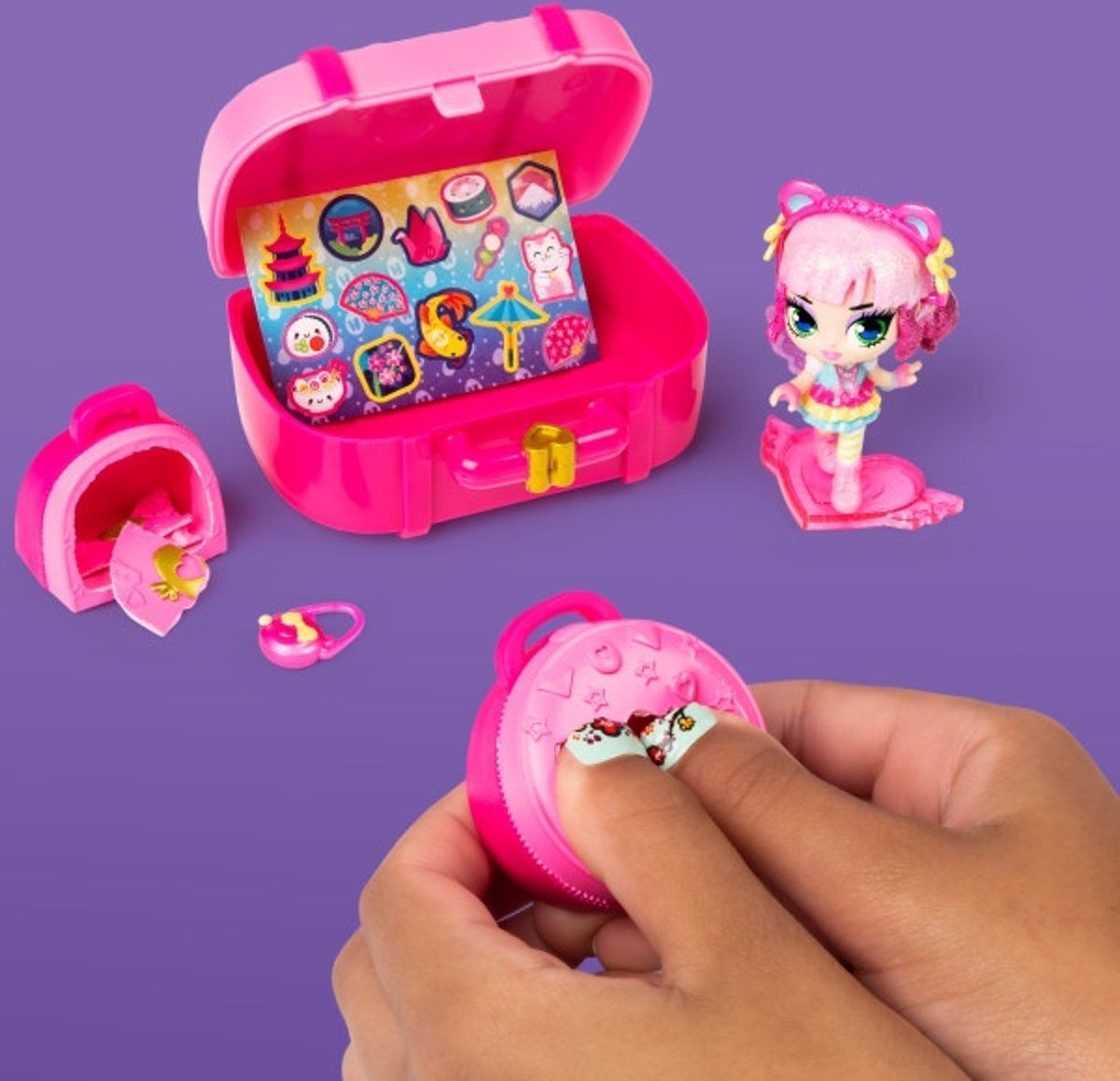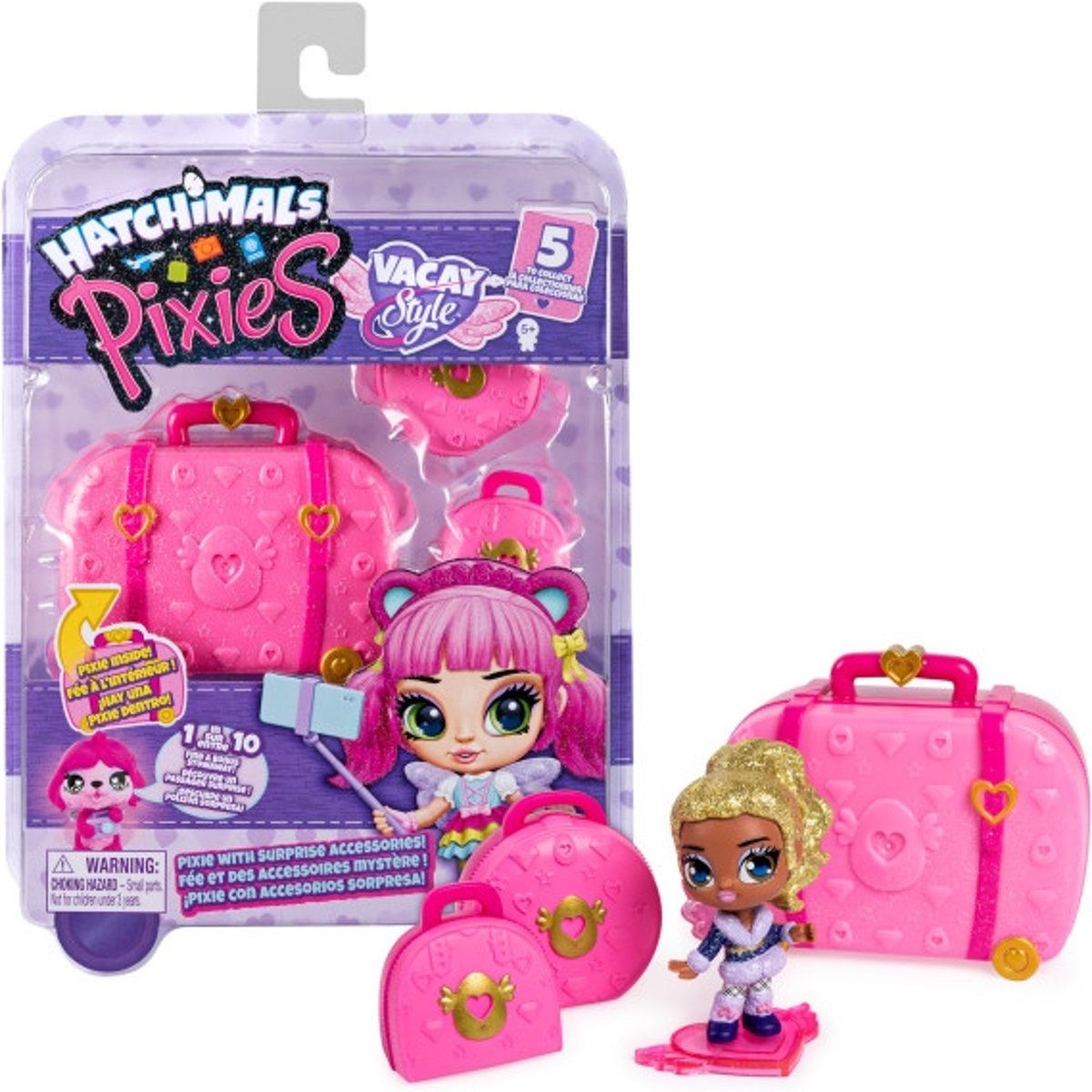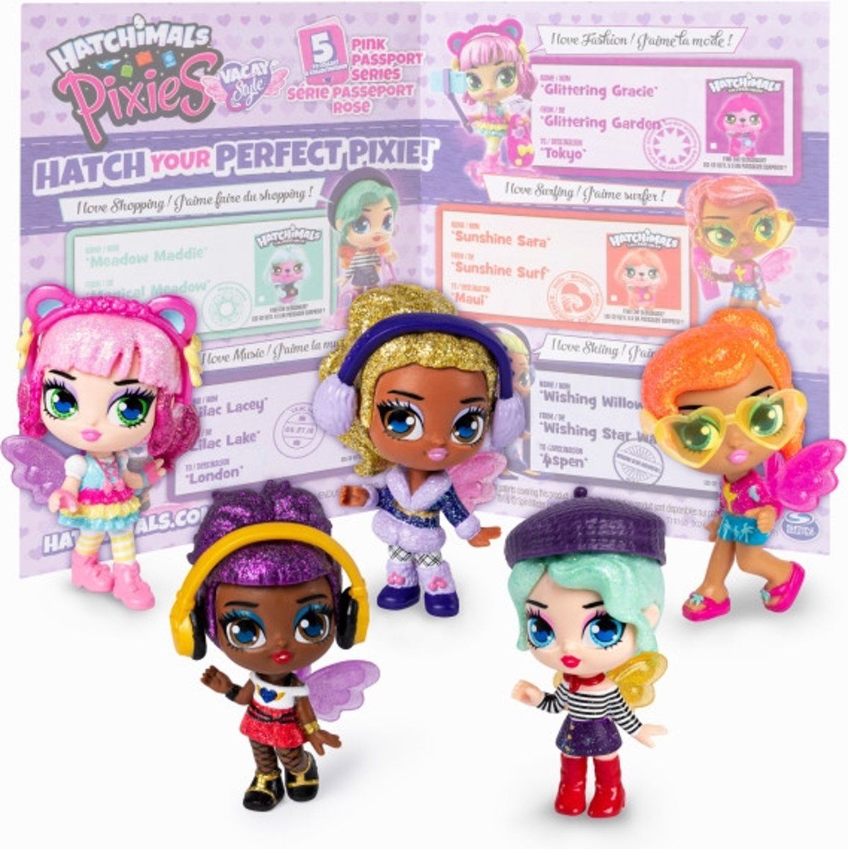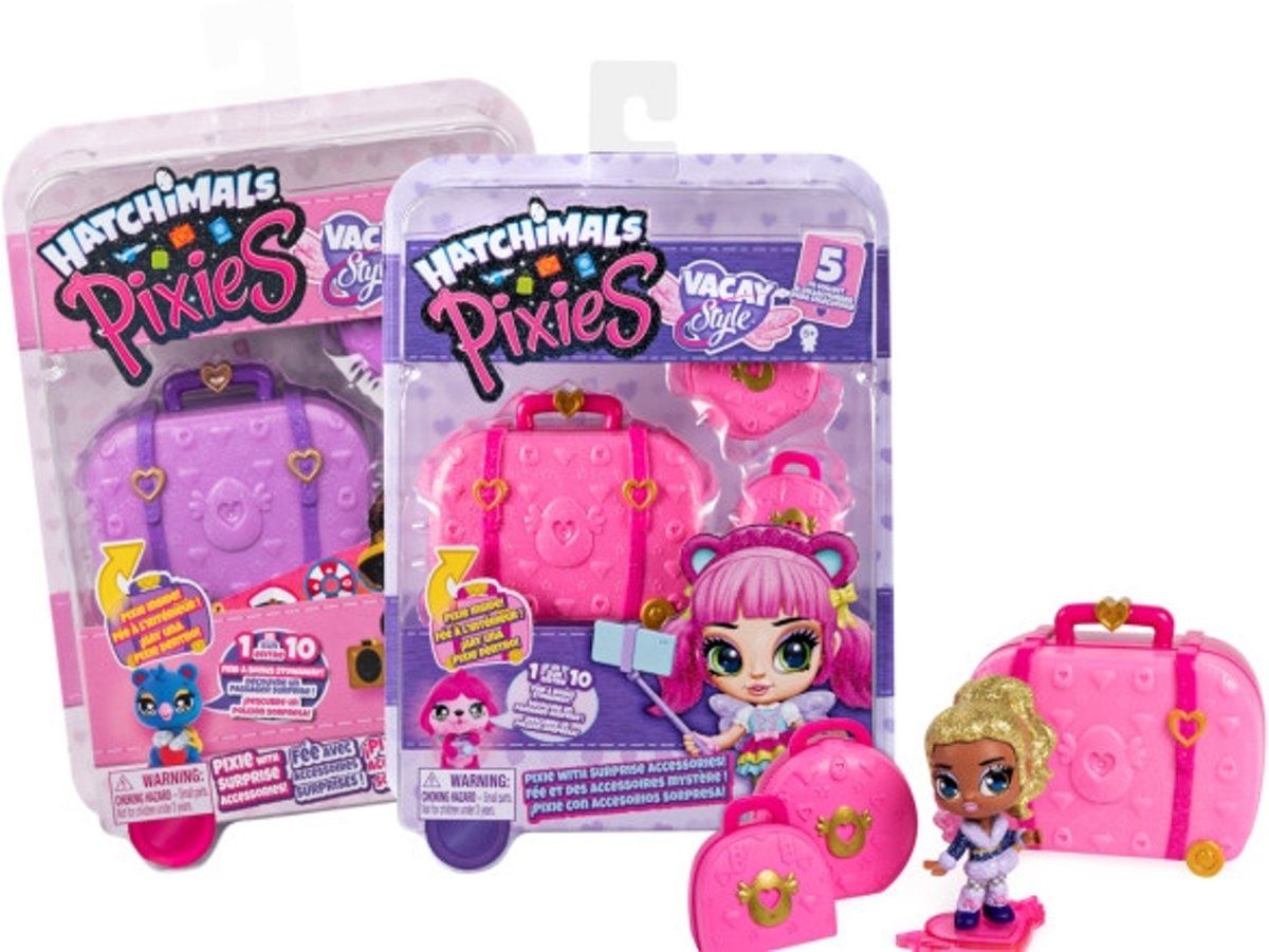 Vacay Style Pixies zijn een geweldig cadeau voor kinderen vanaf 5 jaar. Je kunt 5 poppen uit de roze paspoort-serie en 5 uit de paarse paspoort-serie verzamelen. Voeg ze alle 10 toe aan je verzameling (elk afzonderlijk verkocht). Bovendien is er een kans van 1 op 10 dat je een exclusieve snoezige Hatchimal-verstekeling vindt.