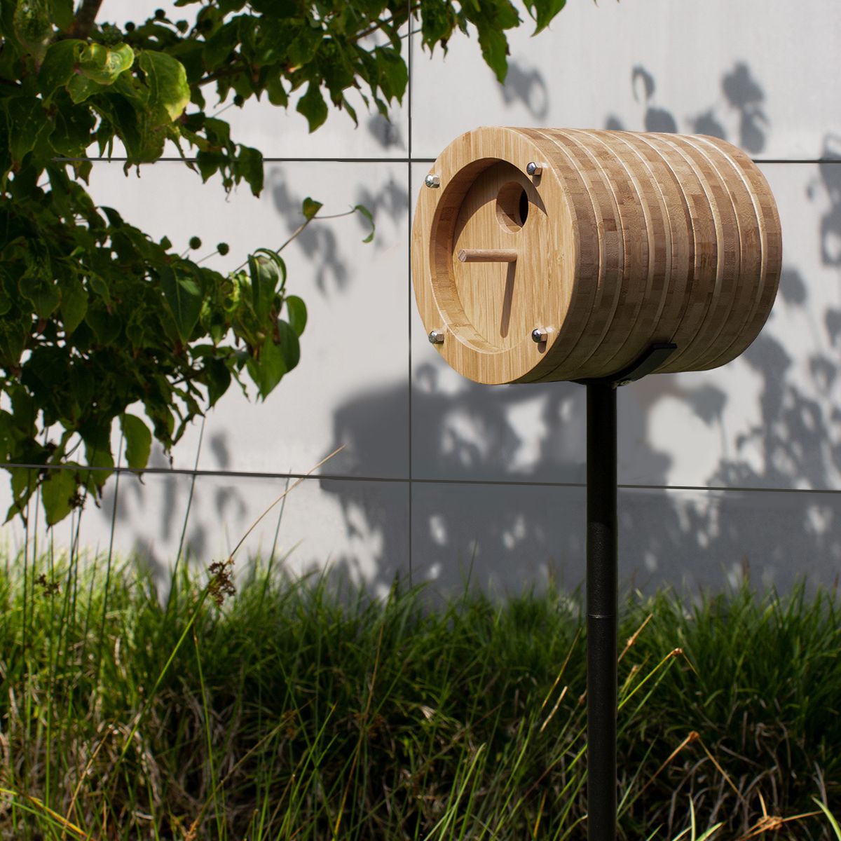 Met het bamboe vogelhuisje Fly Inn helpen we de vogels die in ons verstedelijkt gebied moeite hebben met het vinden van een nestplaats. Je zet het in een handomdraai in de tuinaarde of in een flinke bloempot op je balkon. Door de natuurlijke uitstraling past het in elke tuin.