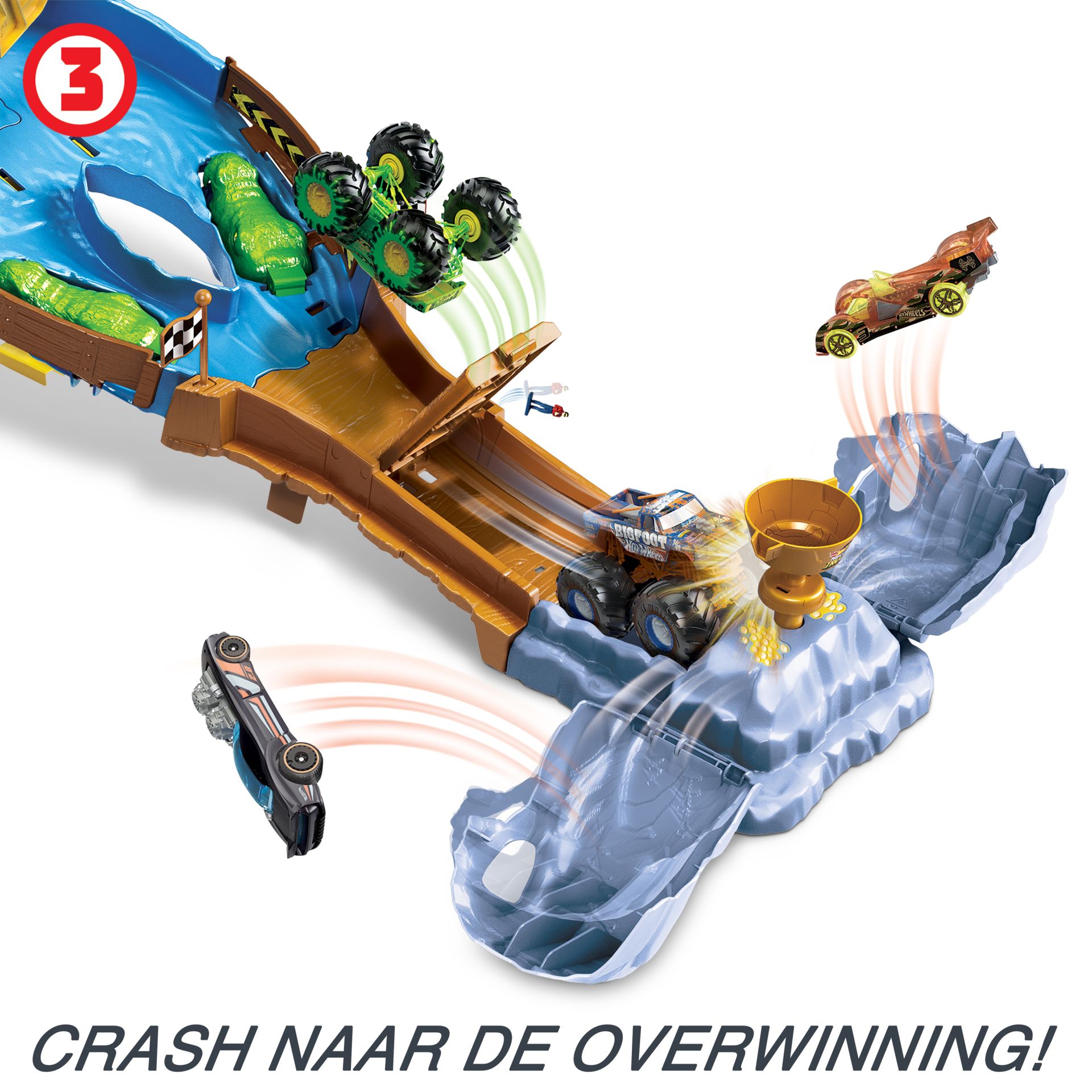 Ontdek wie de snelste en stoerste Monstertruck is in het Hot Wheels Monstertrucks Slopend Circuit! Bigfoot en Gunkster zijn geïnspireerd op de epische races van de YouTube-serie 'Tournament of Titans' en racen van de berg af, vermorzelen auto's en breken door obstakels om door de grot te scheuren en de begeerde Titan Cup te winnen. De eerste truck die over de brug rijdt, activeert een 'explosie', die de nummer twee - en de commentator - vliegles geeft. De set kan worden ingeklapt zodat je hem overal met je mee kunt nemen en makkelijk kunt opbergen. Afwijkende kleuren en versieringen mogelijk.