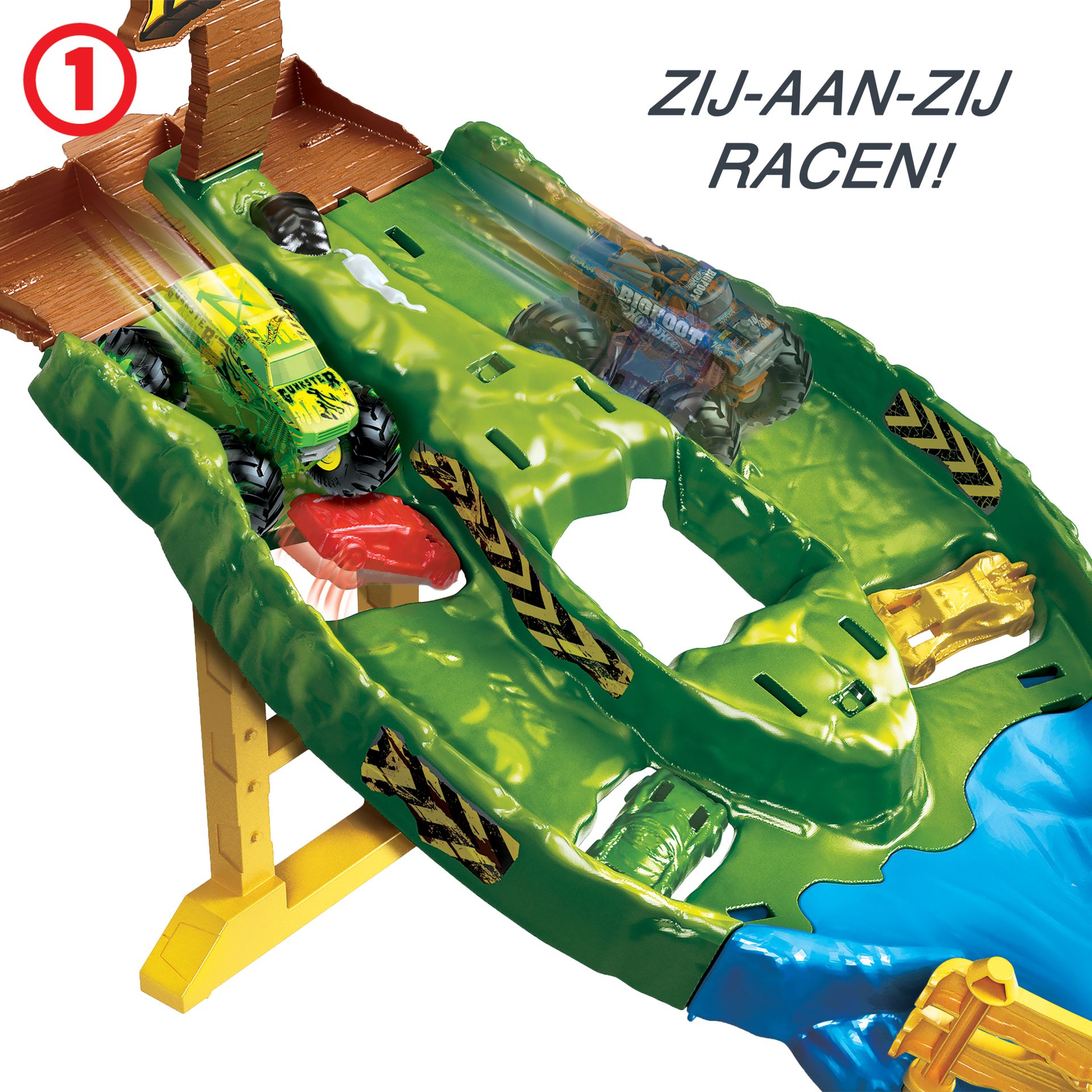 De set bestaat uit 2 Hot Wheels Monstertrucks Bigfoot en Gunkster om de wedstrijd af te trappen.