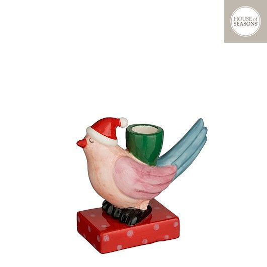 House of Seasons Kandelaar Vogel met Kerstmuts - 13x5.5x12 cm