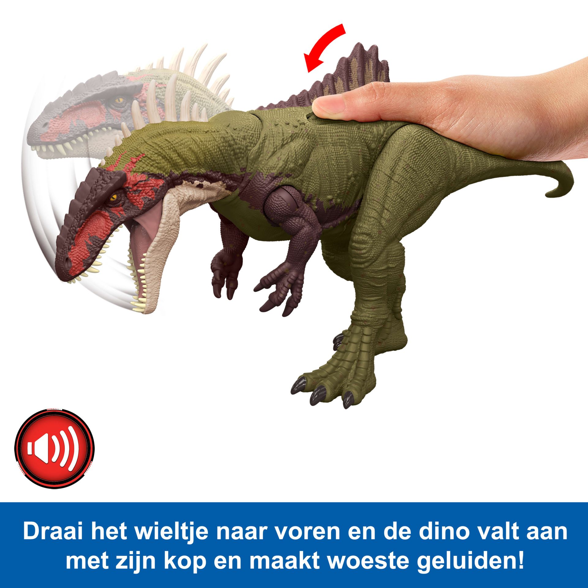 Geëvolueerd om te vechten! Beweeg het draaiwiel naar achteren en laat de kop brullend naar achteren zwaaien, terwijl de staartstekels tegelijkertijd 'geëvolueerd worden om te vechten': ze worden extra lang voor extra kracht.