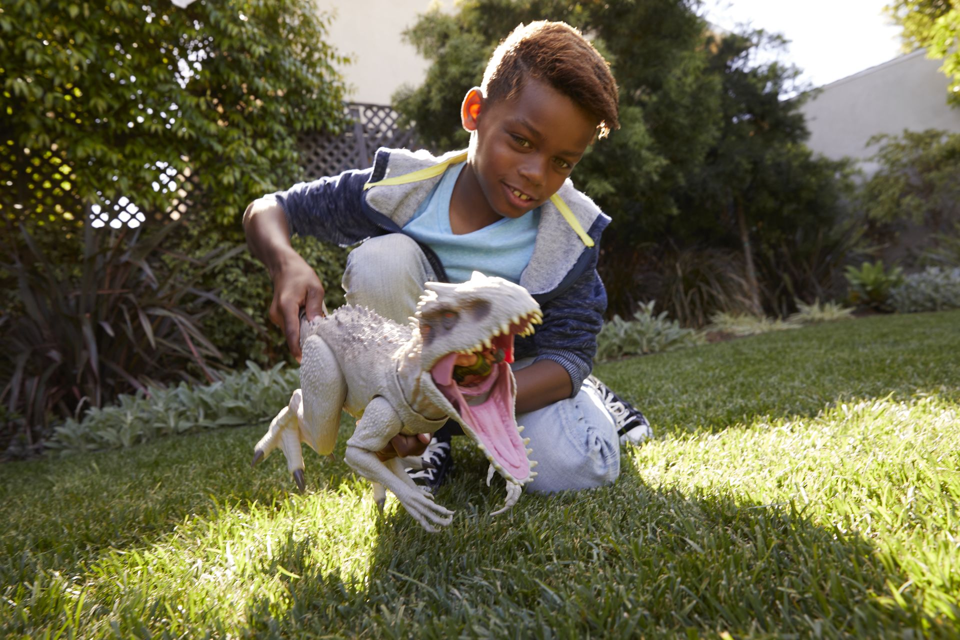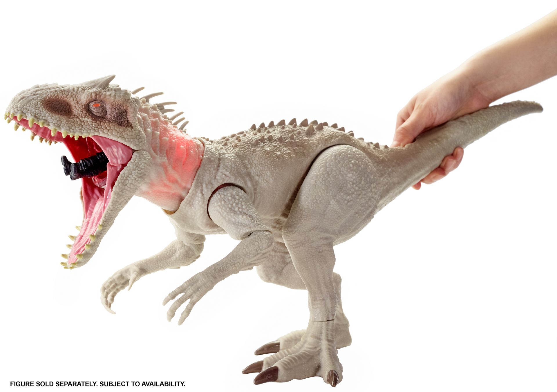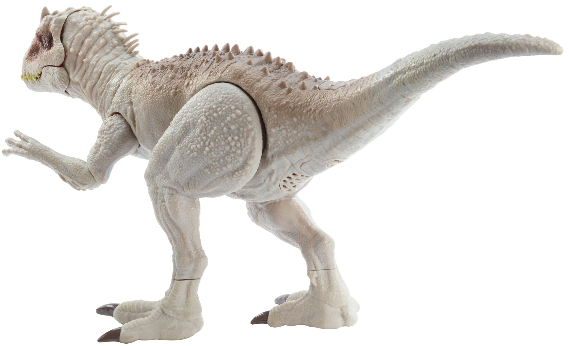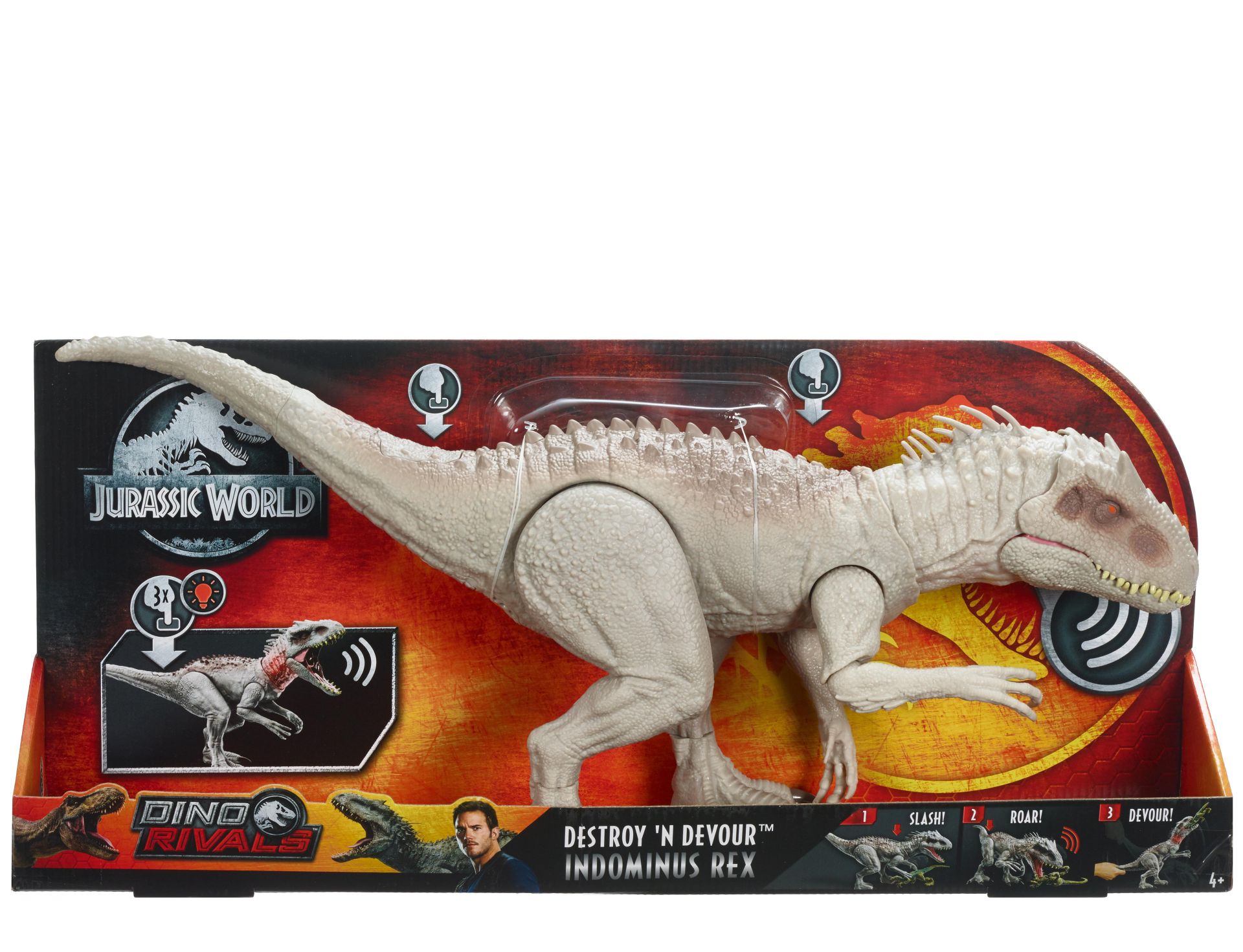 Zijn onheilspellende uiterlijk: spookachtig witte schubben, boosaardige tanden en lange, agressieve voorpoten. Je bedient de beweging en het geluid van Indominus Rex met twee knoppen: druk op de knop midden op zijn rug om zijn armen te laten bewegen en levensechte hakgeluiden te horen; druk op de knop aan het begin van de staart om zijn kaken te laten smakken en hem te laten brullen!
