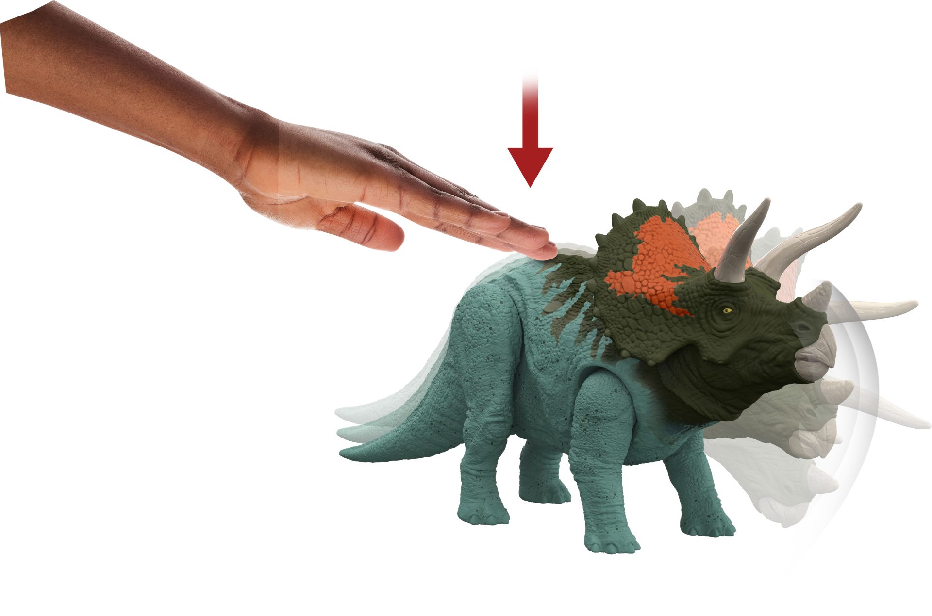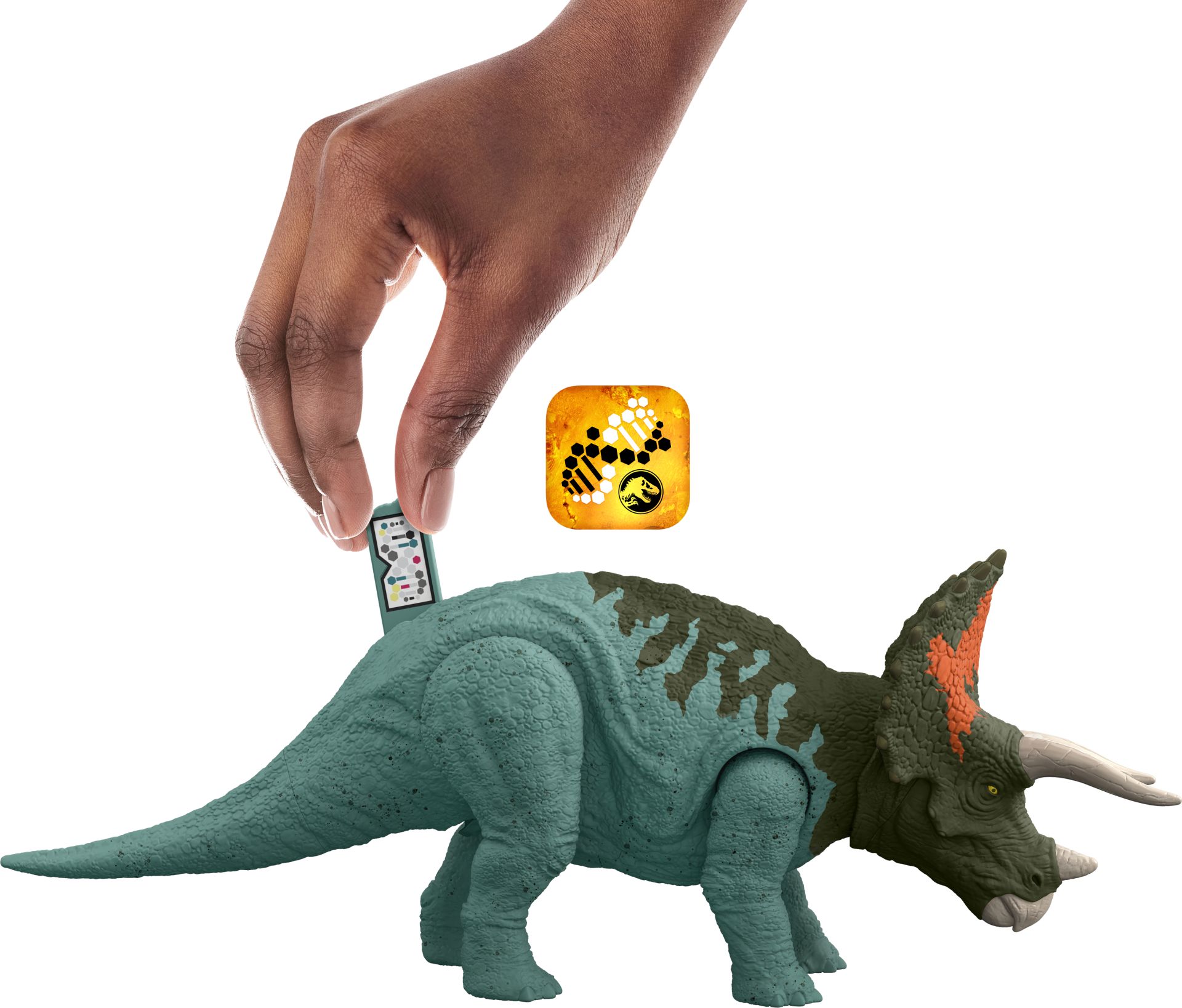 Bereid je voor op spanning en avontuur met deze dinosaurus die is geïnspireerd op Jurassic World Dominion. Deze middelgrote dinosaurusfiguur van Brullende Roofdieren is de Triceratops, voor veel fans de favoriete planteneter. Deze dino maakt niet alleen een echt BRULLEND geluid, maar gaat ook precies zo beukend in de aanval als andere dinosaurussen van deze soort! Geluid en beweging activeer je door het heupgedeelte omlaag te duwen. De Triceratops ziet er echt uit en heeft beweegbare gewrichten, een authentieke vormgeving en realistische kleuren en texturen. Zet de dino in stoere houdingen of verzin je eigen avonturen vol actie. Breng deze dinosaurus TOT LEVEN en speel ook digitaal met augmented reality (AR)! Durf te zien hoe ECHT het spel van de dinosaurussen kan worden! Scan de verborgen DNA-code met elk slim apparaat om de AR-ervaringen te ontgrendelen in de gratis Jurassic World Facts app. Geweldig voor fans van dinosaurussen en actiespellen; geschikt voor 4 jaar en ouder. Slim apparaat niet inbegrepen. Afwijkende kleuren, afmetingen en versieringen mogelijk.