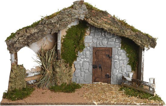 Kerststal Berk Naturel met Mos en Stro - 63x30x40 cm - FSC Mix 70%