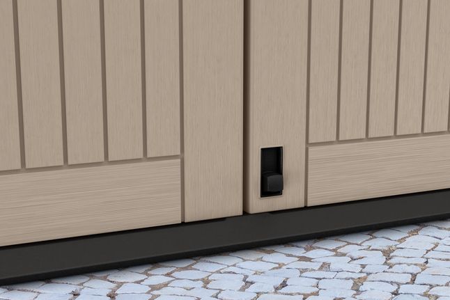 De Store it Out Midi heeft ingebouwde plankdragers waar je planken op kan leggen als je het wil gebruiken om je tuinaccessoires georganiseerd op te bergen. De planken zelf zijn niet inbegrepen. De vloer loopt bij de deuren licht af wat het makkelijk maakt je containers, grasmaaier of barbecue naar binnen te rijden. Er zit op het deurpaneel ook een knopje waarmee je de deuren van het slot kan halen met je voet.