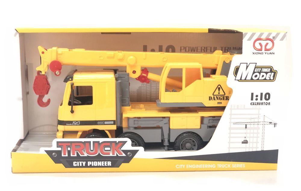Kraanwagen 38 cm met 4 assen, geel, frictiemotor, uitschuifbare kraan