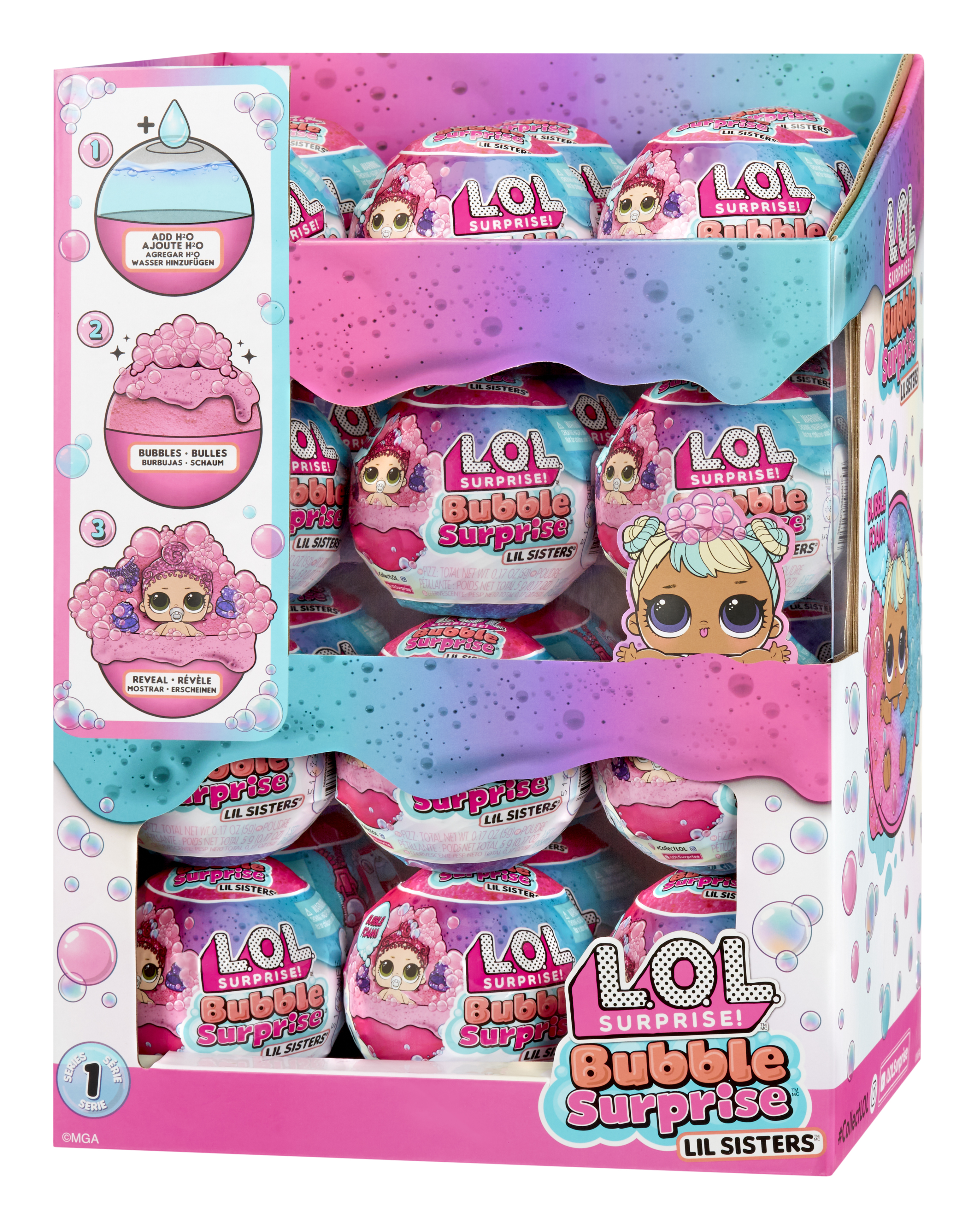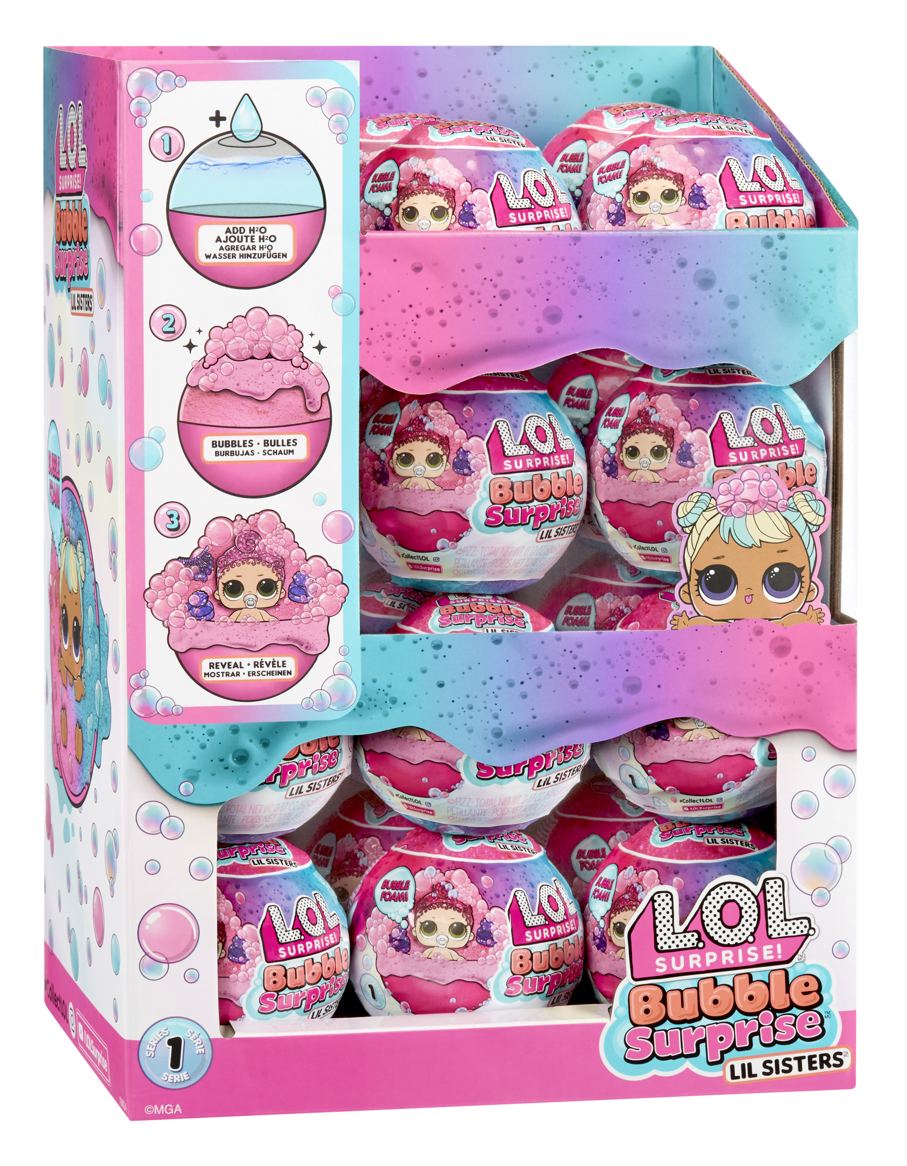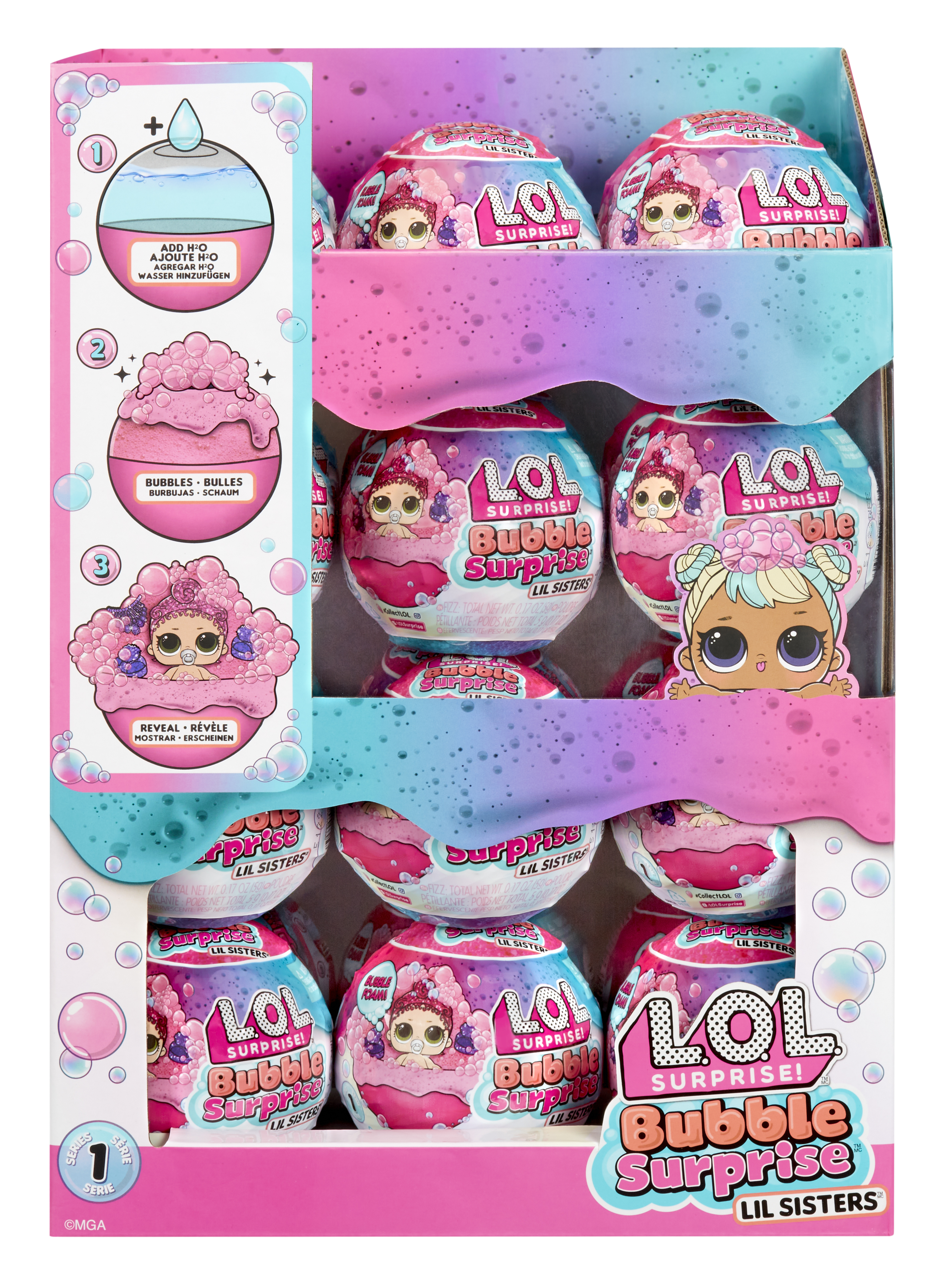 Maak kennis met L.O.L. Surprise Bubble Surprise Lil Sisters! Deze babyzusjes staan te trappelen om in een zee van kleurrijk schuim te zwemmen dat JIJ creëert! Giet water in de bovenkant van je L.O.L. Surprise-bol en kijk hoe het bruisende schuim van kleur verandert en je eigen Lil Sister-verzamelpop en verrassingen onthult! Deze babyzusjes hebben dikke pret in het glitterschuim en daarbuiten. Ontdek alle verschillende kleuren bollen en schuim, waaronder de zeldzame roze-gouden bol! Verzamel alle 12 L.O.L. Surprise Bubble Surprise Lil Sisters voor de ultieme schuimparty! Maak je Bubble Surprise-familie compleet met de L.O.L. Surprise! Bubble Surprise-poppen, -diertjes en Deluxe! Deze LOL Surprise-verzamelpoppen met stijlvol haar, superleuke outfits om aan te trekken en veel accessoires met allerlei details zijn het perfecte speelgoed of de perfecte speelset voor meisjes en jongens van 4 tot 7 jaar en ouder om fantasierijk te spelen! Superleuke poppen als verjaardagscadeau of cadeau voor een speciale gelegenheid met urenlang speelplezier voor broers en zussen, vriendjes of vriendinnetjes! Van MGA Entertainment, de makers van de LOL Surprise-modepoppen en -verzamelpoppen, Rainbow High-modepoppen, Na Na Na Surprise-poppen, Bratz-modepoppen, MGA's Dream Ella-modepoppen, MGA's Glitter Babyz-babypoppen, Lalaloopsy, Poopsie Surprise-meisjespoppen, Baby Born Surprise-babypoppen en verzamelitems, Little Tikes-kinderspeelgoed en nog veel meer favoriete merken.