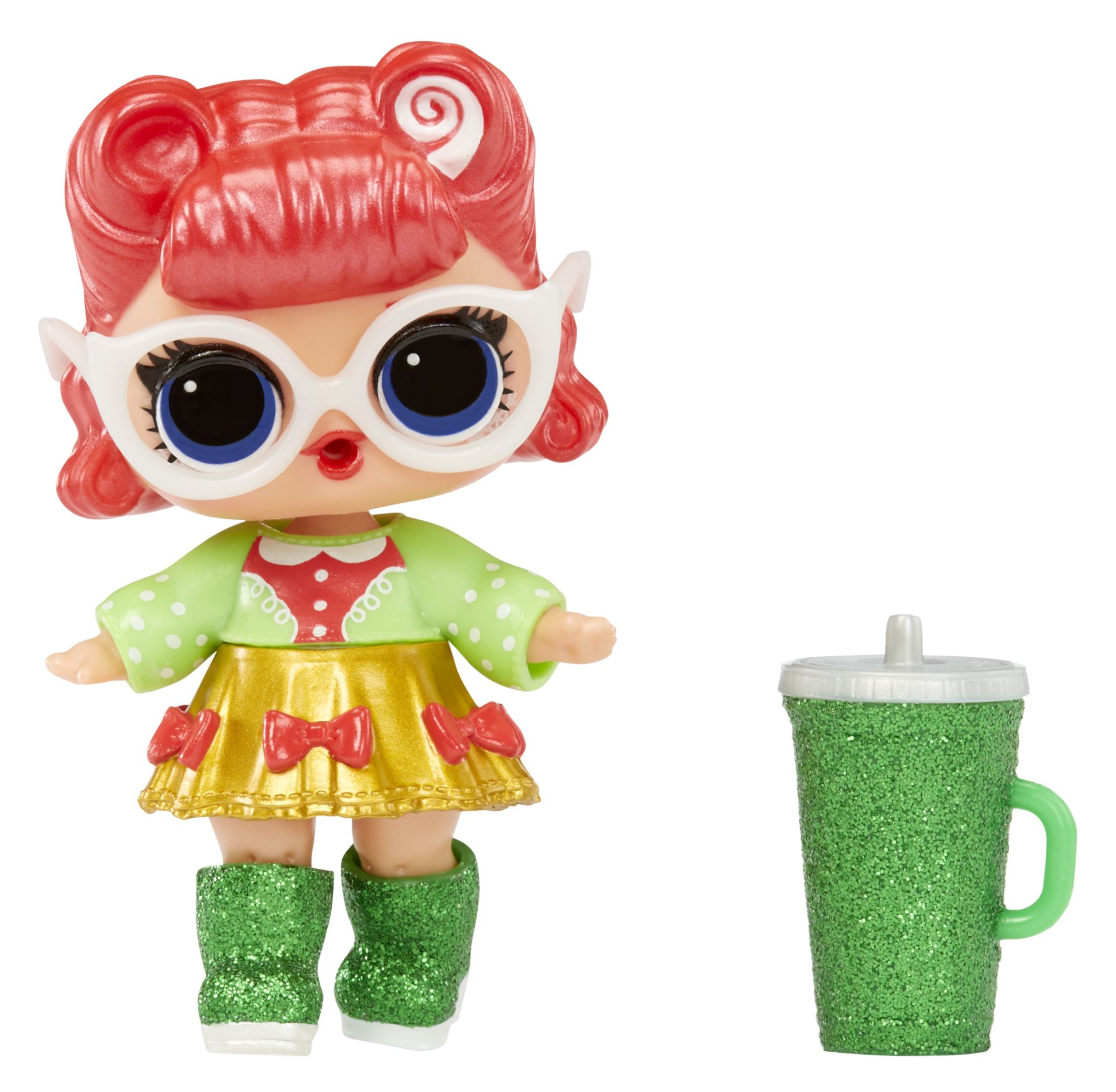 8 VERRASSINGEN: inhoud: (1) limited edition L.O.L. Surprise! Holiday Present Surprise™-pop, (2) outfit, (3) schoenen, (4) drinkbeker, (5) accessoire, (6) sticker (7) geheim bericht, (8) decoratieve bol