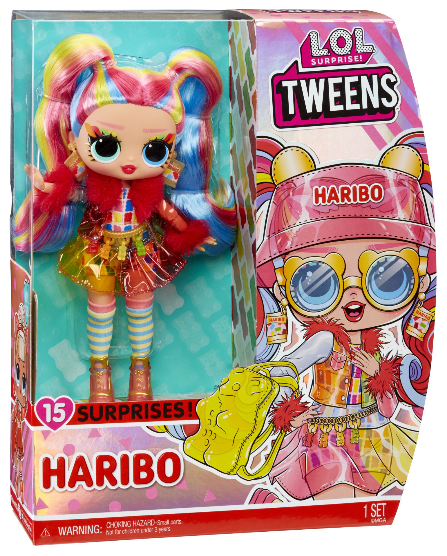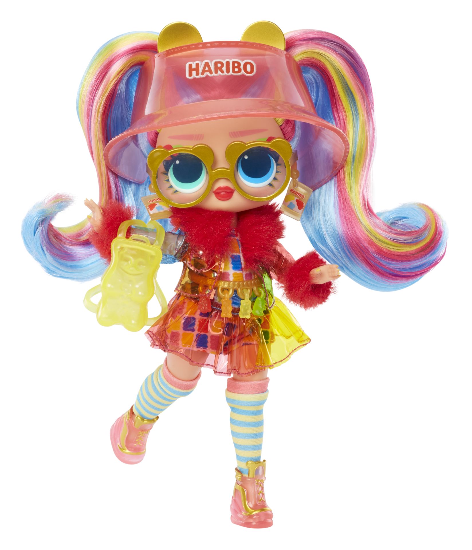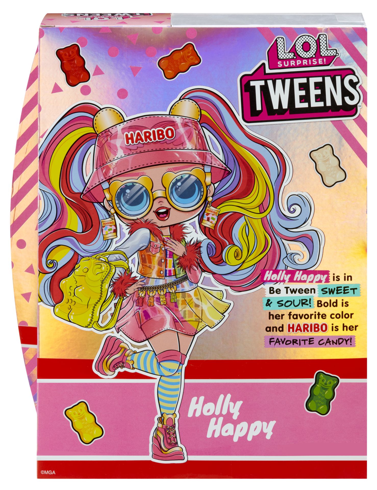Maak kennis met de limited edition L.O.L. Surprise Tweens Haribo-modepop Holly Happy, de grote zus van de minipop Rosy Bear! Pak 15 verrassingen uit en bewonder de vrolijke en brutale mode met snoepthema van Holly Happy! Holly Happy is grappig, aardig en dol op dansen. Iedereen vindt haar altijd superleuk, omdat ze net zo zoet is als het snoep waar ze van houdt! Haar mode en accessoires zijn geïnspireerd op de goudberen van Haribo met een vrolijke, snoepkleurige rok, jack afgezet met nepbont over een bodysuit met goudberen-print, gestreepte kniekousen en accessoires, zoals een gele goudberen-boekentas, een kettingriem met lief klein goudbeertje eraan, roze en gele sneakers met sleehak, schattige zonnebril in de vorm van een beer, een nostalgische roze bucket hat met oren en de schattigste goudberen-oorbellen die je ooit hebt gezien! Haar look is sprankelend en vrolijk met lange, regenboogkleurige staartjes en snoepkleurige mode en make-up. Bovendien heeft ze beweegbare ledematen voor heel veel houdingen. Elke doos is inclusief een L.O.L. Surprise Tweens-modepop, Holly Happy, unieke mode, schoenen, accessoires, oorbellen, een goudberen-rugzak, haarborstel en poppenstandaard. Verzamel de hele L.O.L. Surprise Haribo-verzameling!