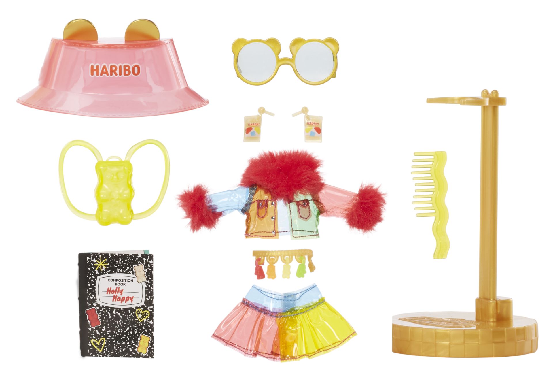 UNIEKE MODE: trek Holly Happy haar unieke mode aan en gebruik de accessoires om haar snoepkleurige stijl te laten zien, zoals haar vrolijke, snoepkleurige rok, jack afgezet met nepbont over een bodysuit met goudberen-print, gestreepte kniekousen en accessoires, zoals een gele goudberen-boekentas, een kettingriem met lieve, kleine goudbeertjes eraan, roze en gele sneakers met sleehak, schattige zonnebril in de vorm van een beer, een nostalgische roze bucket hat met oren en de schattigste goudberen-oorbellen die je ooit hebt gezien! Tip voor pro's: de handen zijn verwijderbaar, zodat je de pop makkelijk kunt aankleden