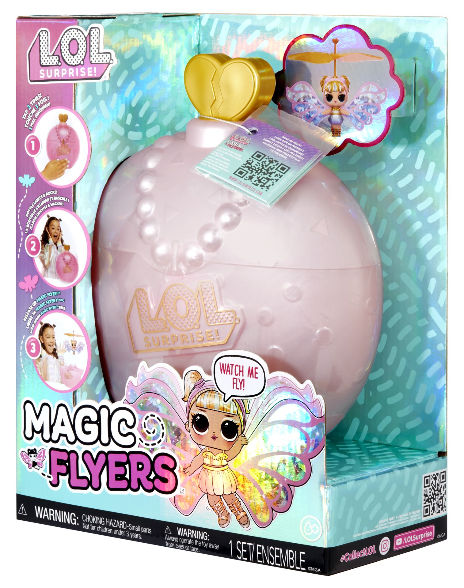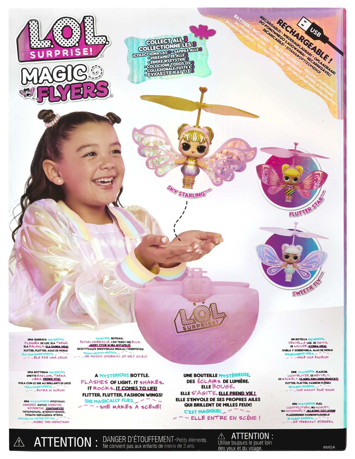 De L.O.L. Magic Flyers zijn een feestje in een flesje! De mysterieuze fles geeft licht, schudt en rammelt… en komt tot leven! Fladder fladder, een magische gevleugelde pop komt tevoorschijnt en schopt een hele scene! Er zijn 3 verzamelbare popjes (Wonder Wings, Flutter Star en Sweetie Fly) en elke Magic Flyer is herlaadbaar via USB-kabel. Oplaadbare batterijen zijn inbegrepen. Geschikt voor kinderen van 6 jaar en ouder.