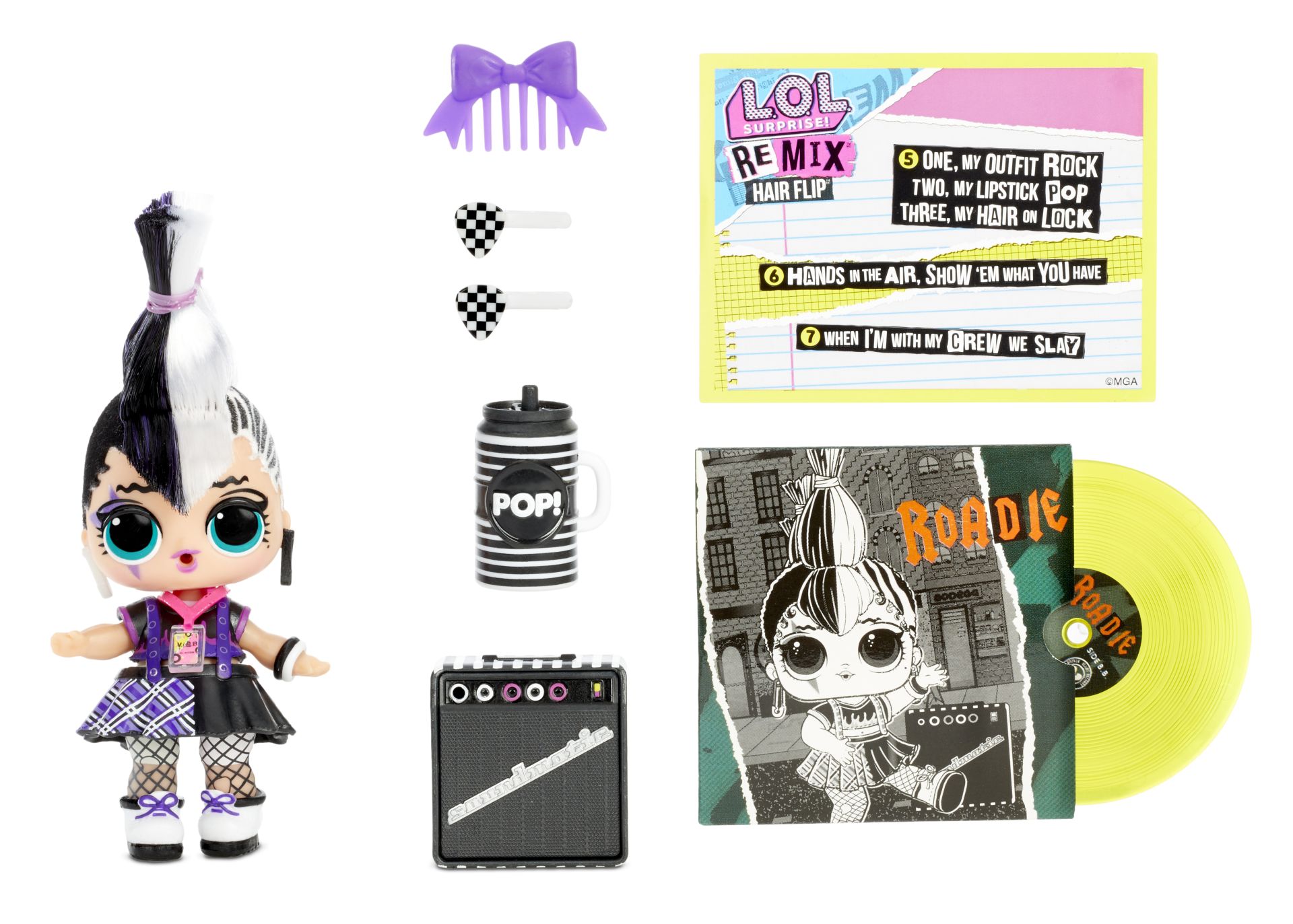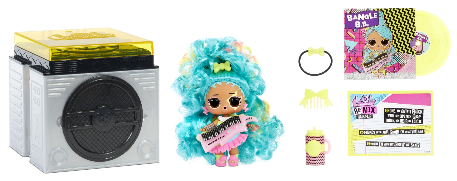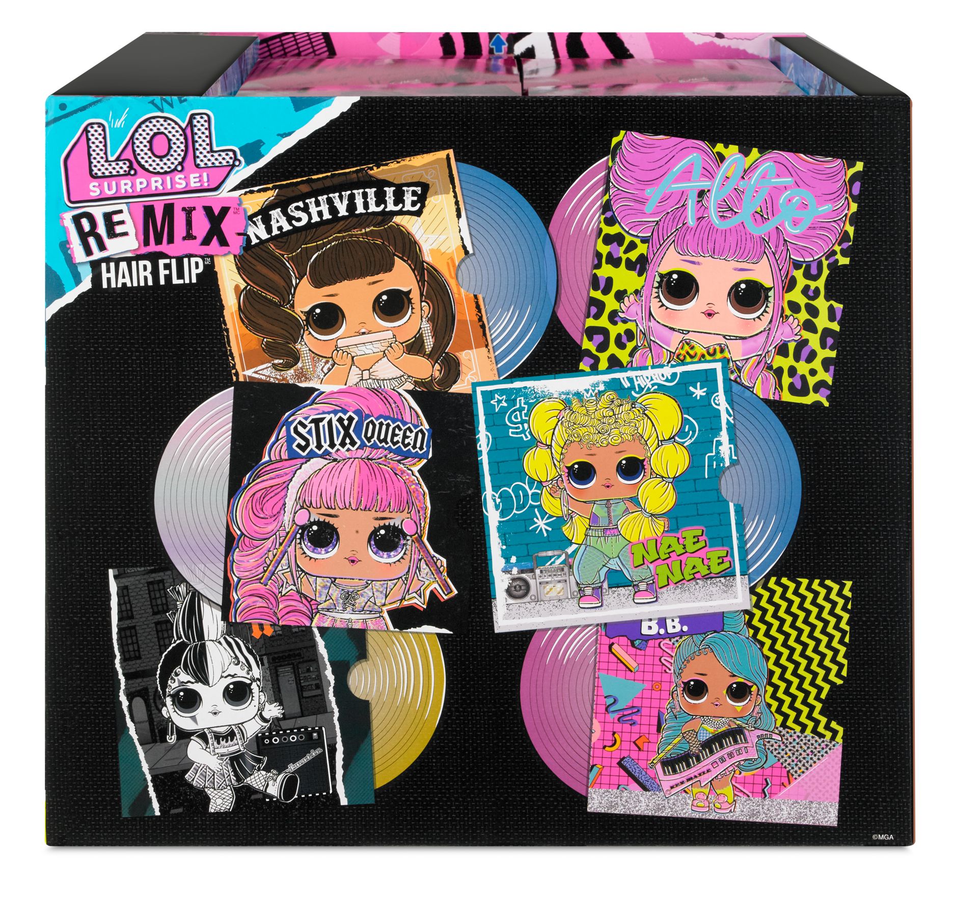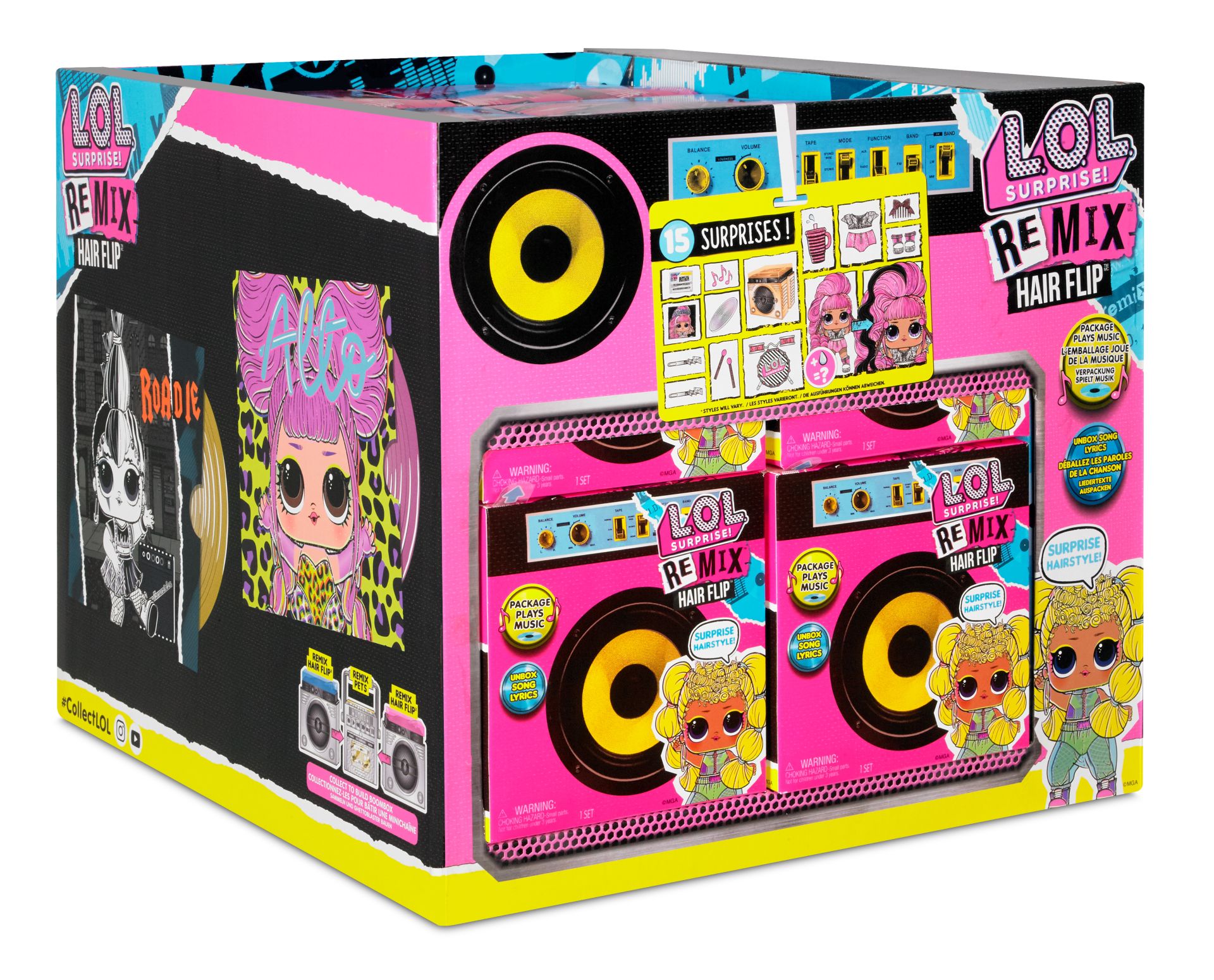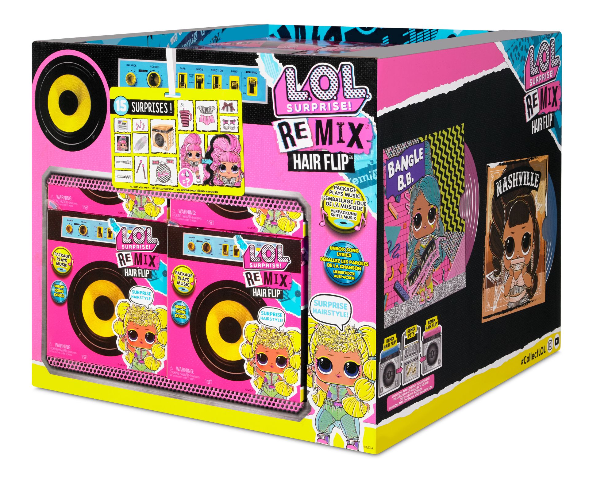 Verzamel alle 12 de L.O.L. Surprise! Remix Hair Flip-poppen. Verzamel om een boombox te bouwen door de verpakkingen van 2 L.O.L. Surprise! Hair Flip-poppen en 1 L.O.L. Surprise Remix Pets met elkaar te verbinden. Verzamel muziek en songteksten van de hele L.O.L. Surprise! Remix-lijn om de song compleet te krijgen. Of mix en match songteksten om je eigen remix te creëren.