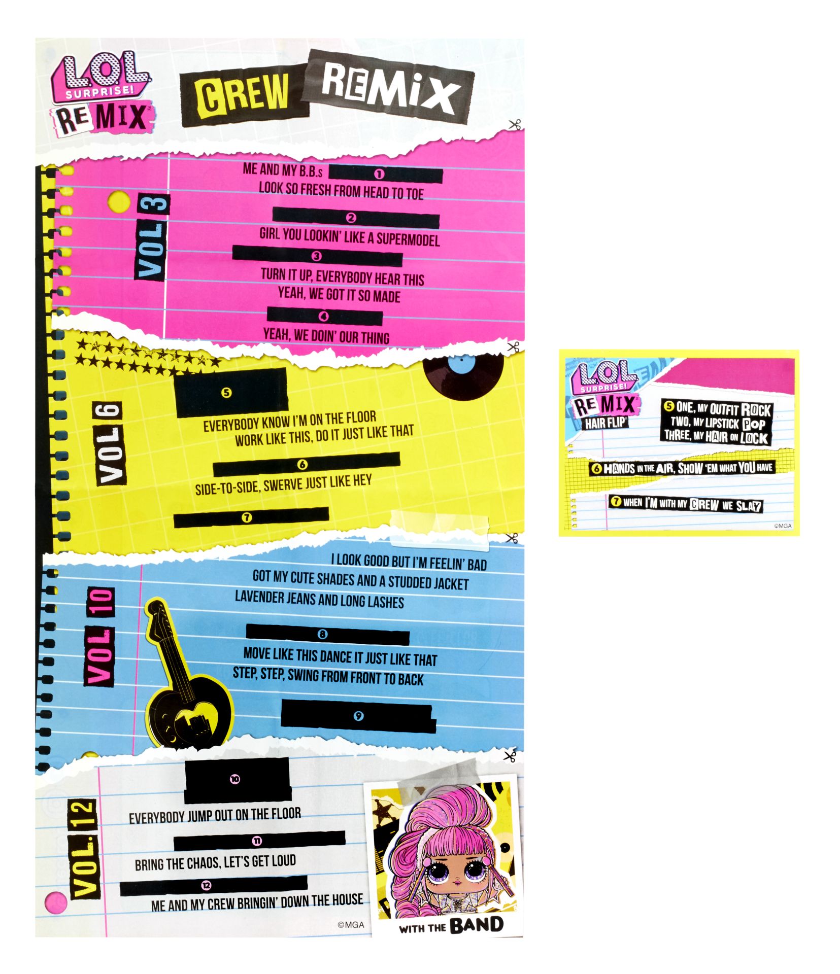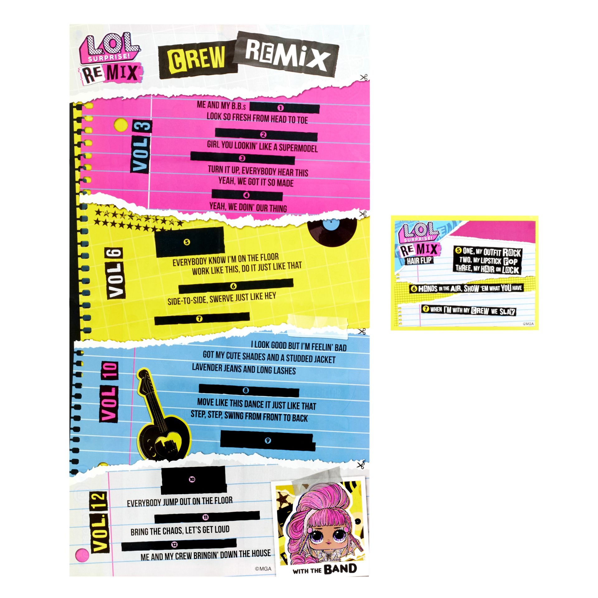 Pak de fantastische mode en muziekaccessoires van elke pop uit, zodat ze klaar is om te rocken. Help ze dan om de songtekst af te maken! Elke pop wordt geleverd met tekststickers. Combineer de sticker met het nummer op het tekstblad om de songtekst af te maken. Verzamel alle songtekstbladen van de hele L.O.L. Surprise! Remixlijn om het hele nummer te onthullen. Of mix en match songteksten om je eigen remix te maken.Heb jij de songtekst van jouw pop gevonden? Of andere songteksten die je nog niet hebt gehoord?
