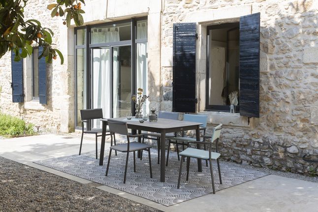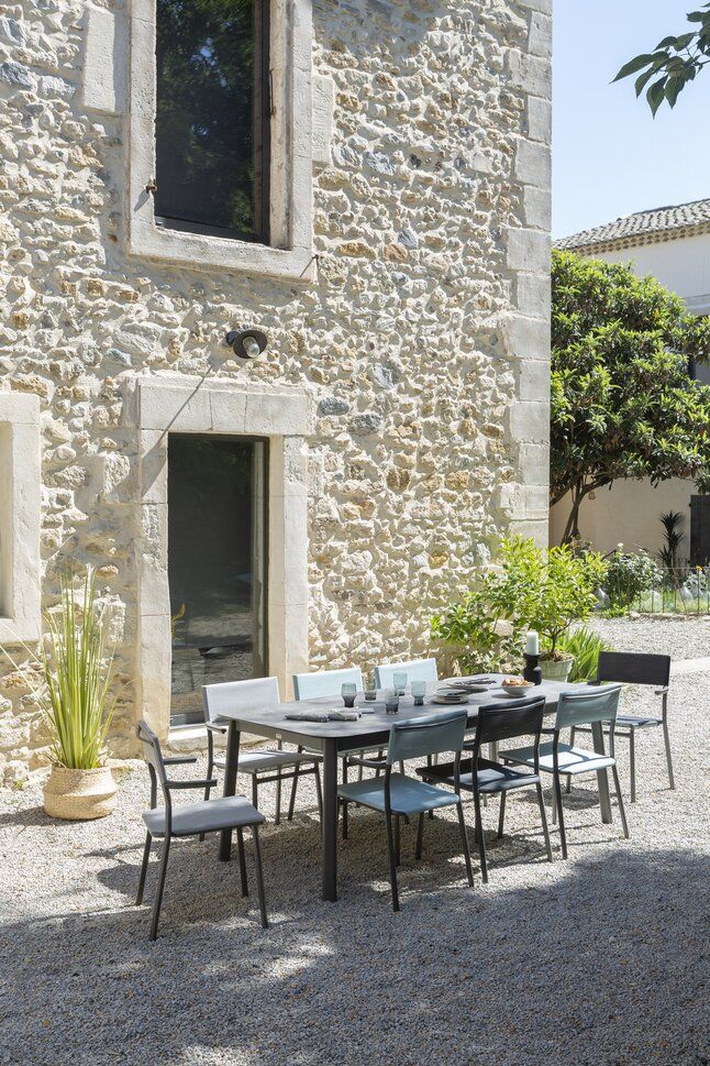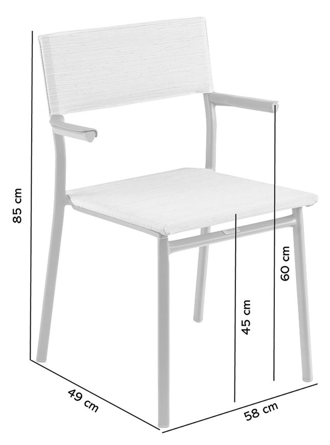 Stapelbare eetkamerstoel, licht en ultrabestendig tegen corrosie, ultrabestendige aluminium armleuningen waardoor de stoel aan de tafel kan worden opgehangen. Stapelbare eetkamerstoel, drielobbige aluminium structuur van 30 mm. Het is licht en ultrabestendig tegen corrosie. De toegang tot de stoel wordt vergemakkelijkt dankzij de middellange armleuningen.