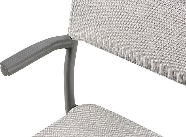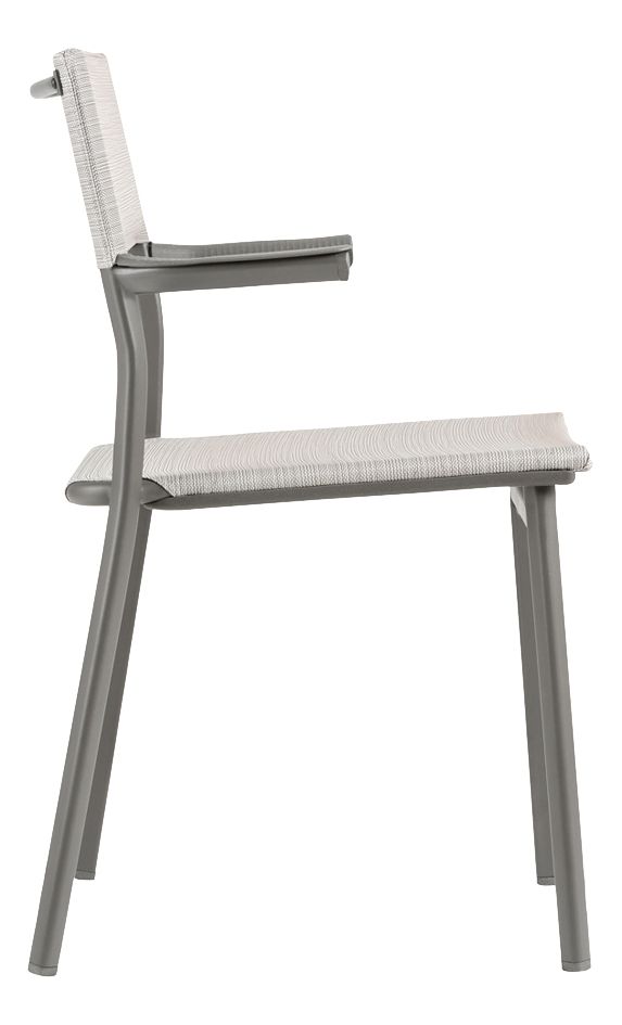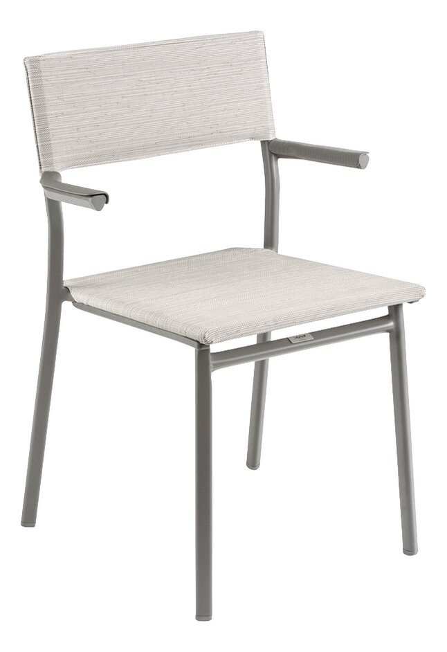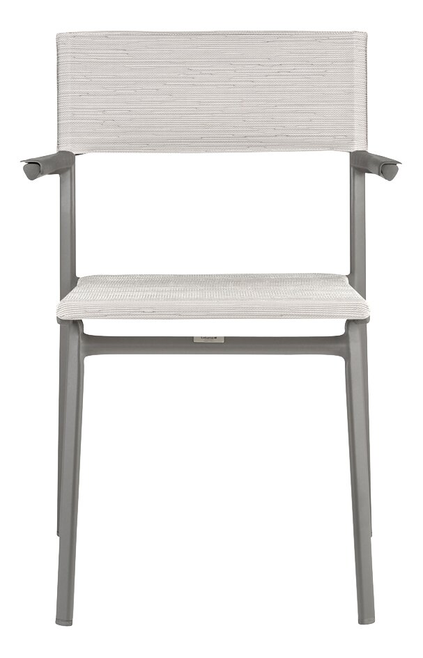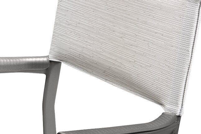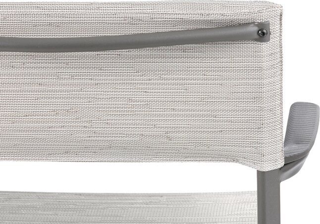 De armleuningen zijn gemaakt van aluminium en ultrabestendig met een gespikkelde polymeerbekleding en een golvend effect waardoor de stoel aan de tafel kan worden opgehangen voor eenvoudig opbergen of vloeronderhoud. Aan de bovenkant van de rugleuning bevindt zich een dwarsstuk om het hanteren te vergemakkelijken, de canvasconstructie is gepatenteerd voor een betere scheurweerstand.