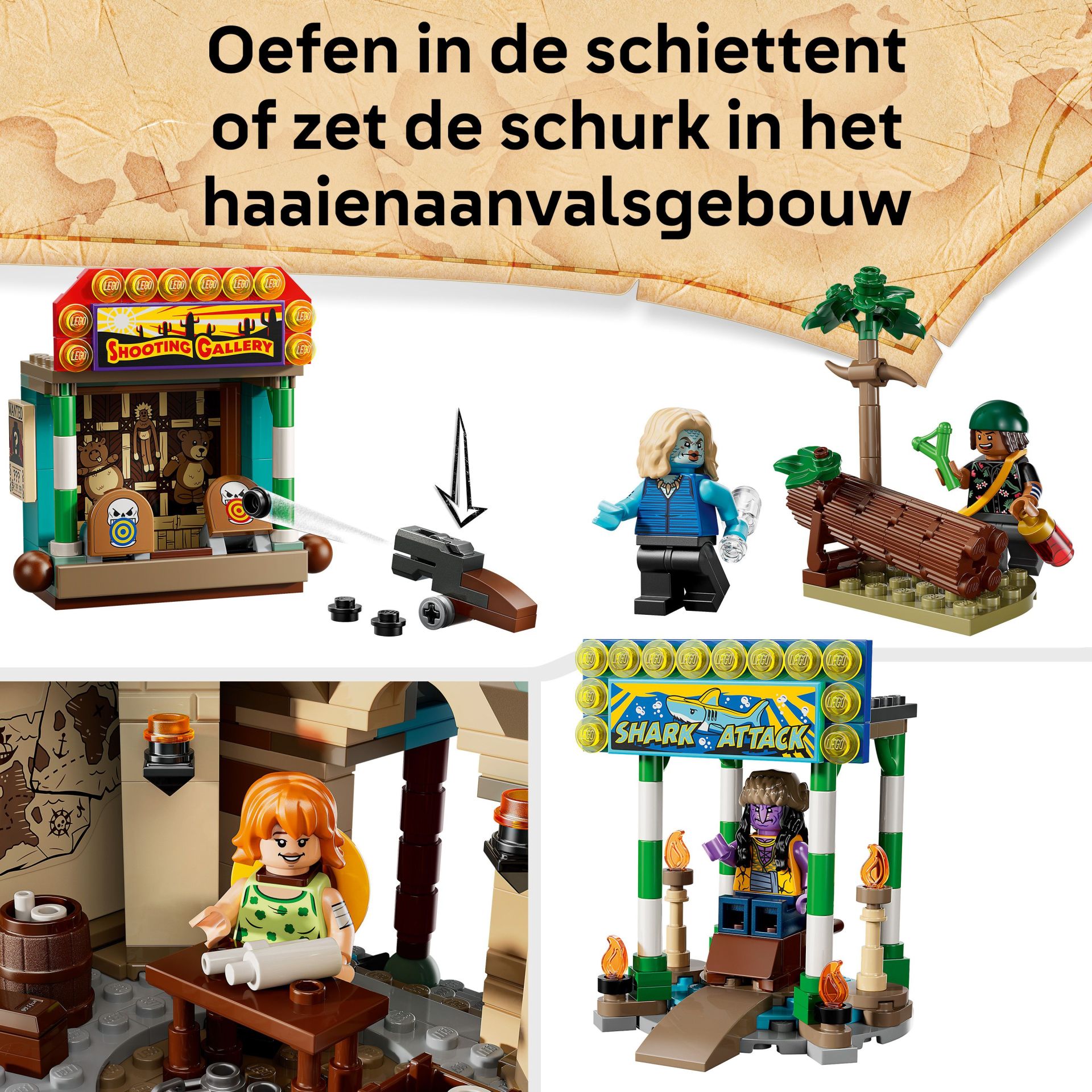 LEGO® piratenspeelgoed boordevol actie – kinderen kunnen op de bovenkant van de pagode duwen om deze te laten 'ontploffen', oefenen met richten in de schiettent, de schurk in het haaiengebouw plaatsen en nog veel meer