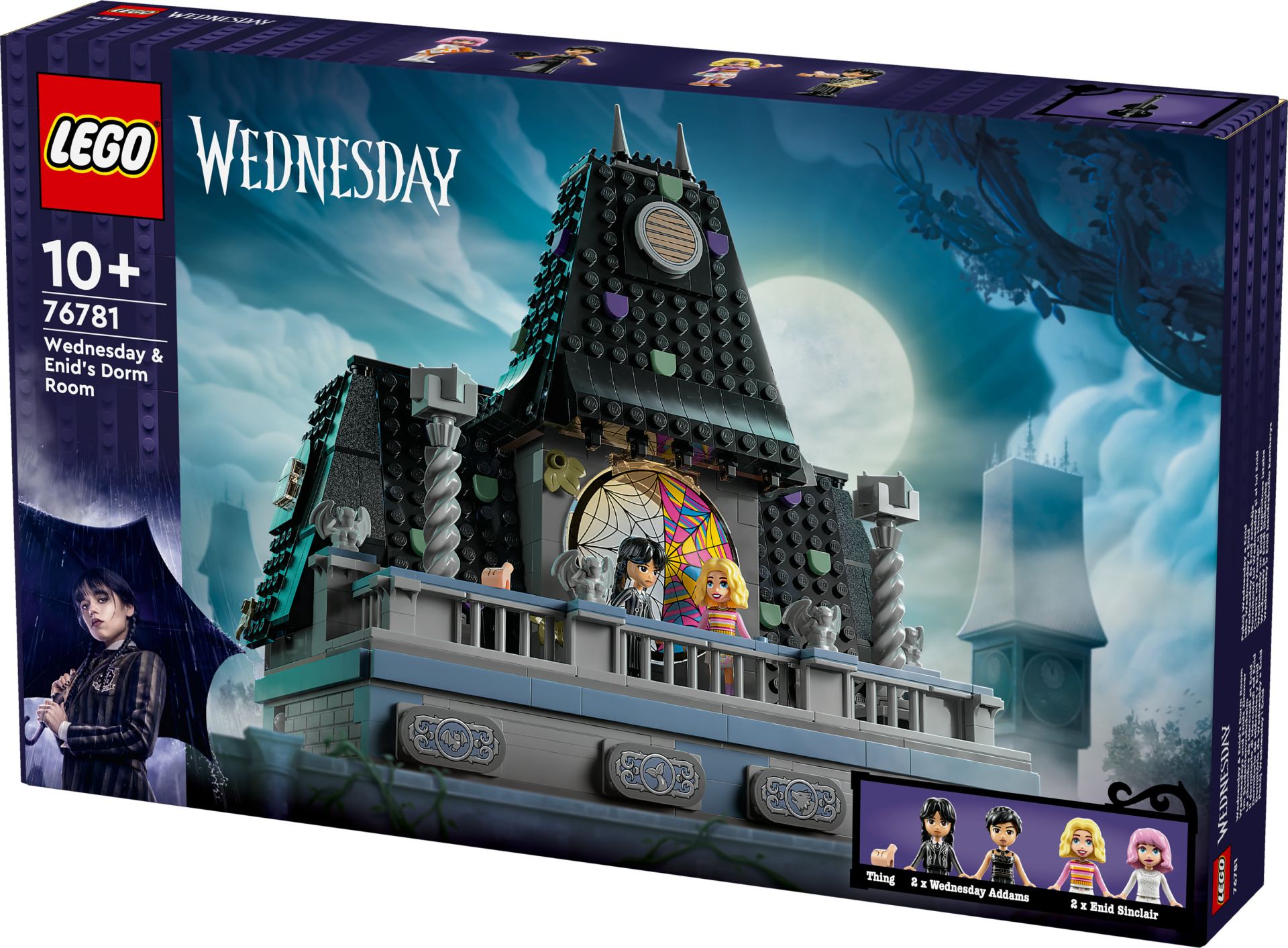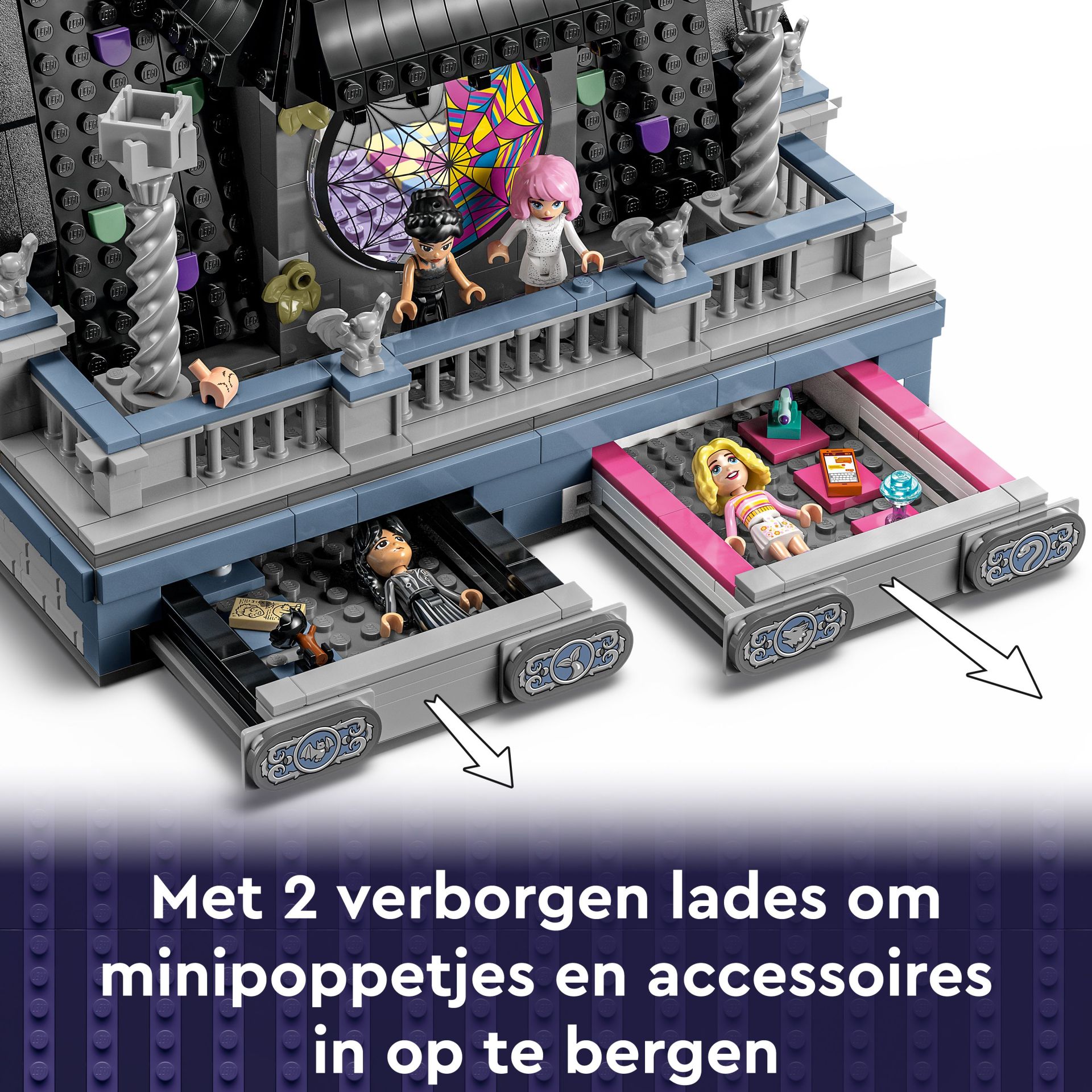 • Nevermore Academy set – de schoolspeelset bevat een bouwbare kamer met een spinnenwebraam dat open kan, een basis met knoppen die geheime lades openen en een balkon met 4 waterspuwers