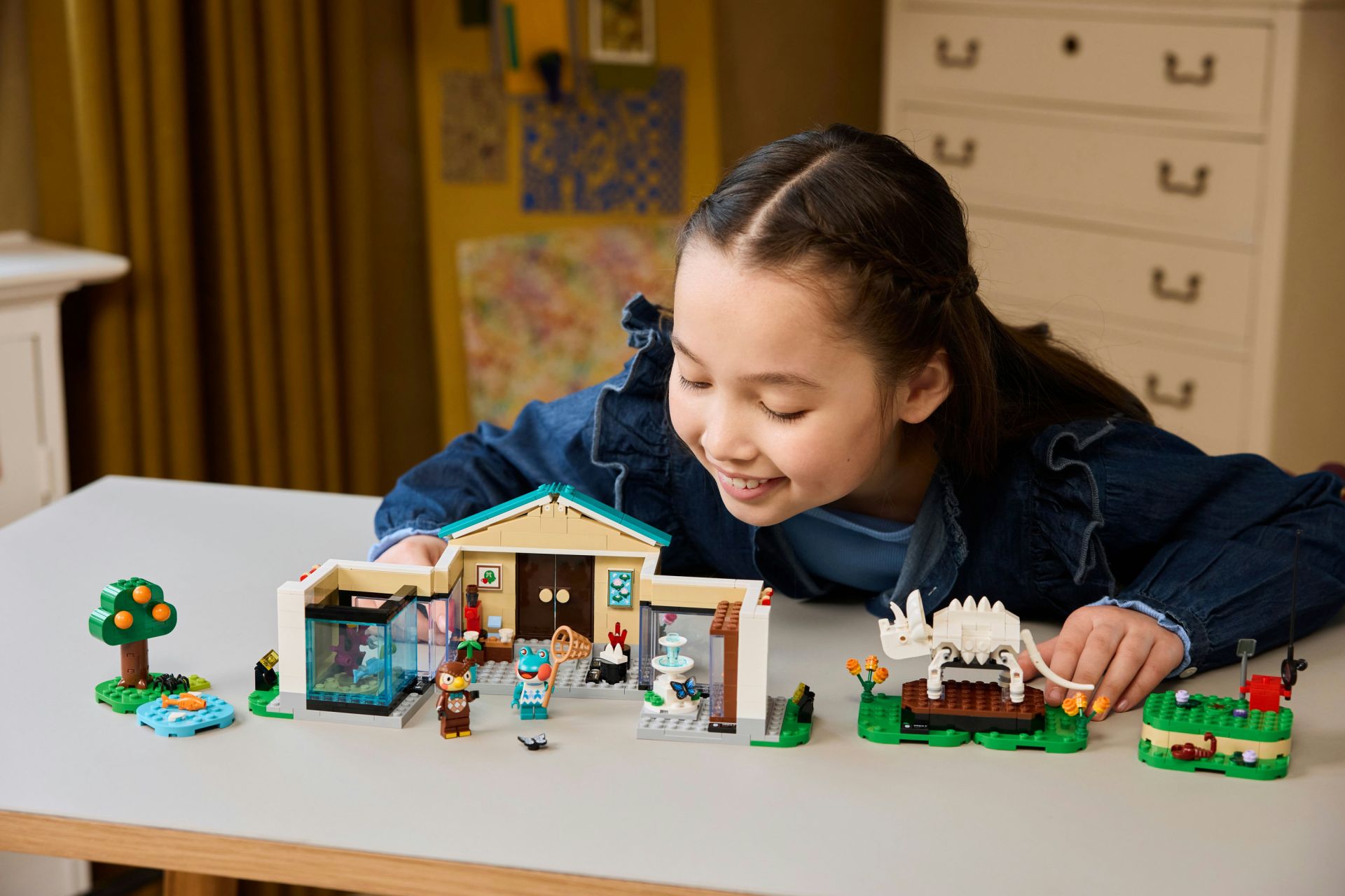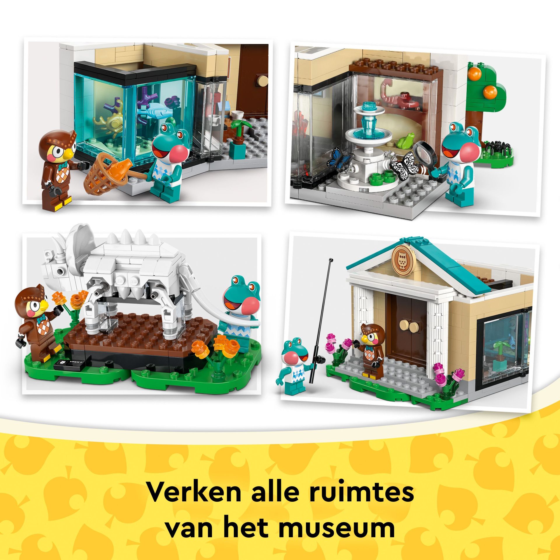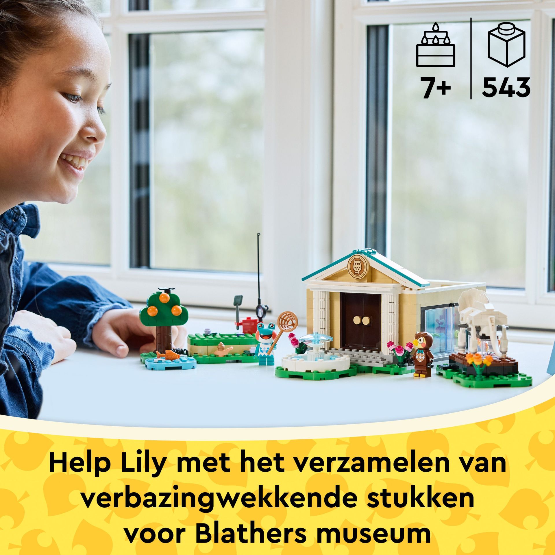 Dit bouwspeelgoed is een LEGO® versie van het museum uit de Animal Crossing games. Kinderen kunnen de tentoonstellingsruimtes aanpassen met hun vondsten. Ze kunnen een schop gebruiken om het ontbrekende staartbeen van de Triceratops op te graven, vissen binnenhalen voor het aquarium en vlinders en griezelige beestjes vangen met een net. De set is aanpasbaar dankzij de scharnierende wanden en verplaatsbare elementen. Er is ook een fontein en het café The Roost, waar kinderen kunnen relaxen met de minifiguren van Blathers en Lily voor ze aan hun volgende avontuur beginnen. Jonge bouwers kunnen genieten van digitaal bouwplezier met de LEGO Builder app, waar ze kunnen inzoomen en modellen in 3D kunnen draaien. De set bevat 543 onderdelen.