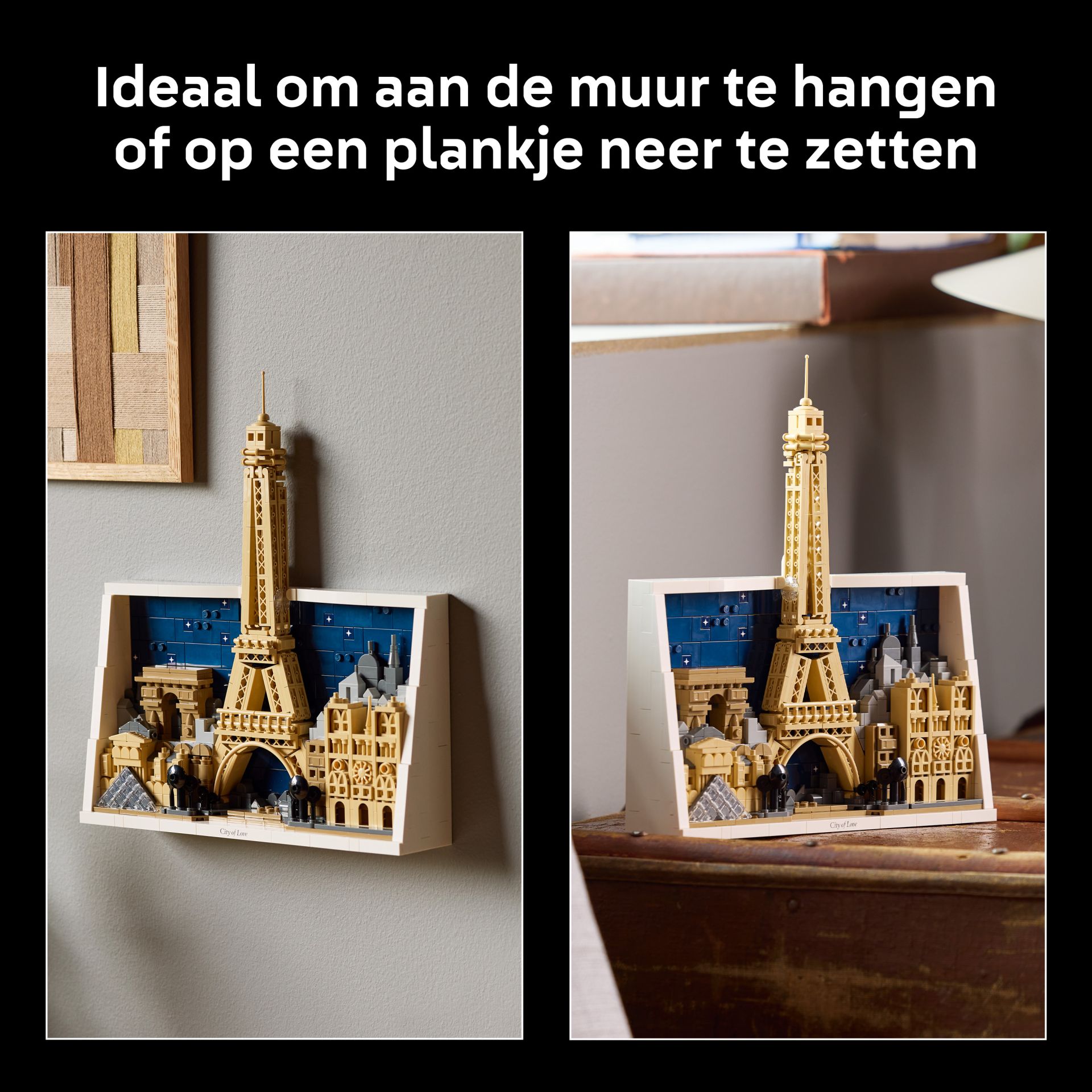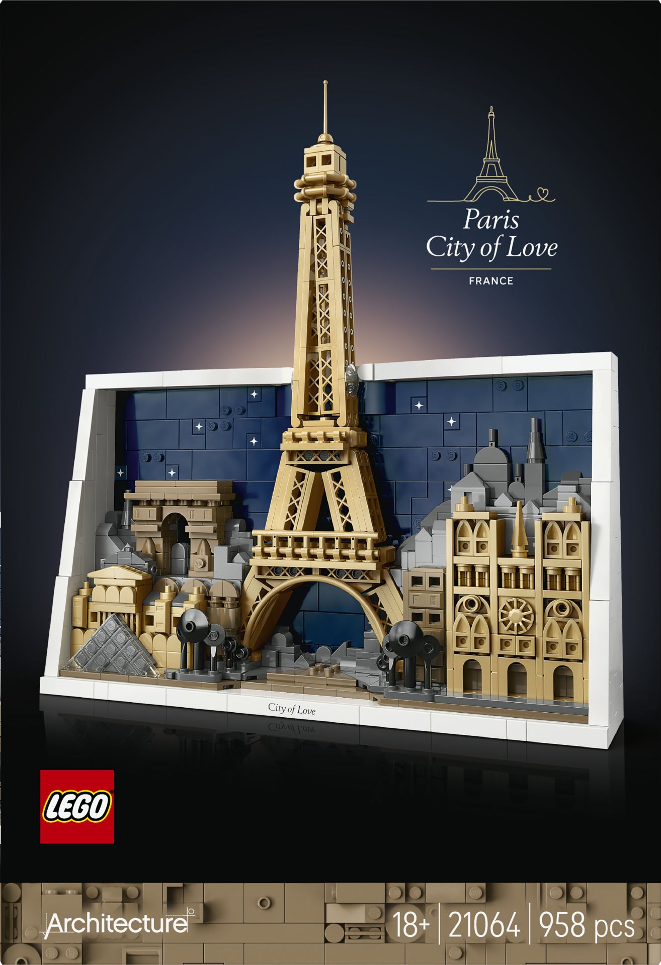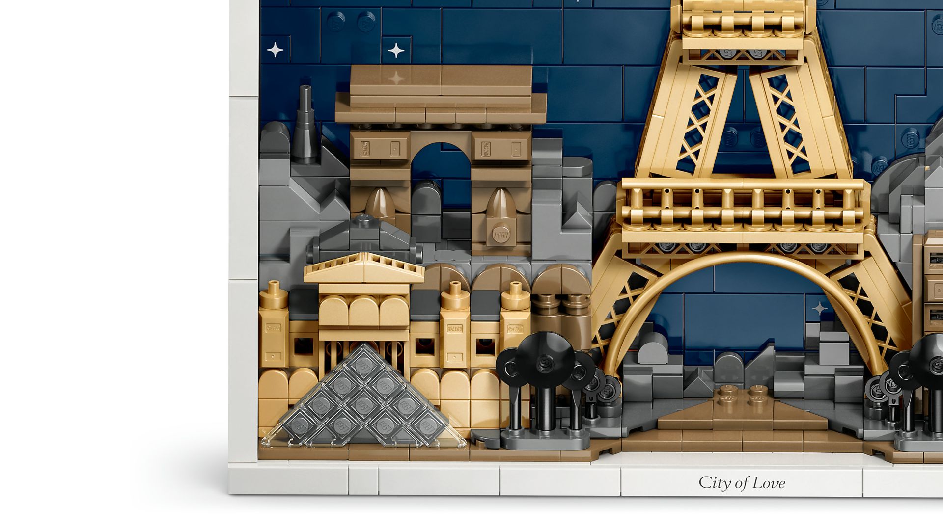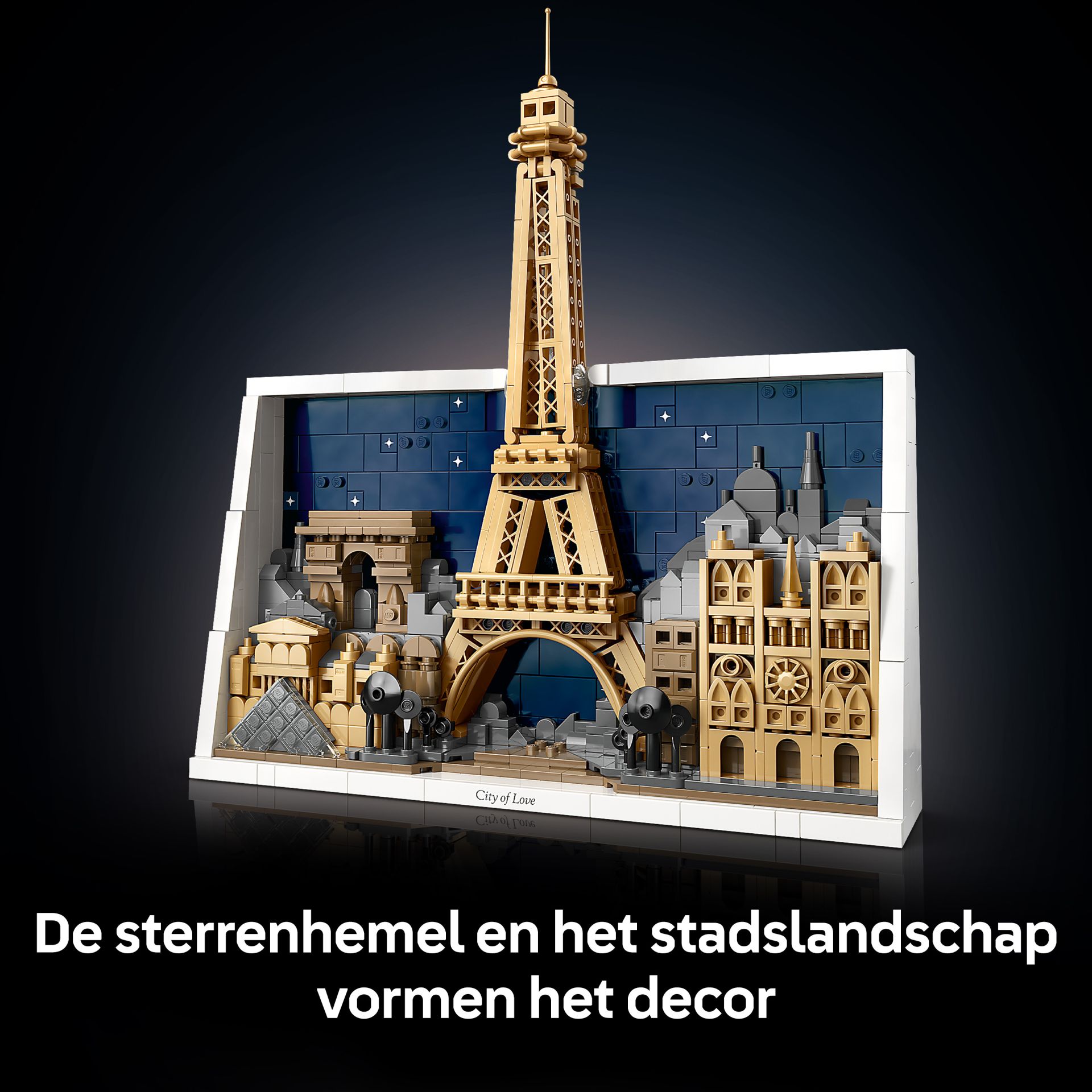 ONTDEK DE HOOGTEPUNTEN VAN PARIJS – deze gedetailleerde LEGO® Parijs – Stad van de Liefde (21064) set bevat 4 architectonische bezienswaardigheden uit Parijs tegen een stadsgezicht en een sterrenhemel die zijn omlijst met witte stenen