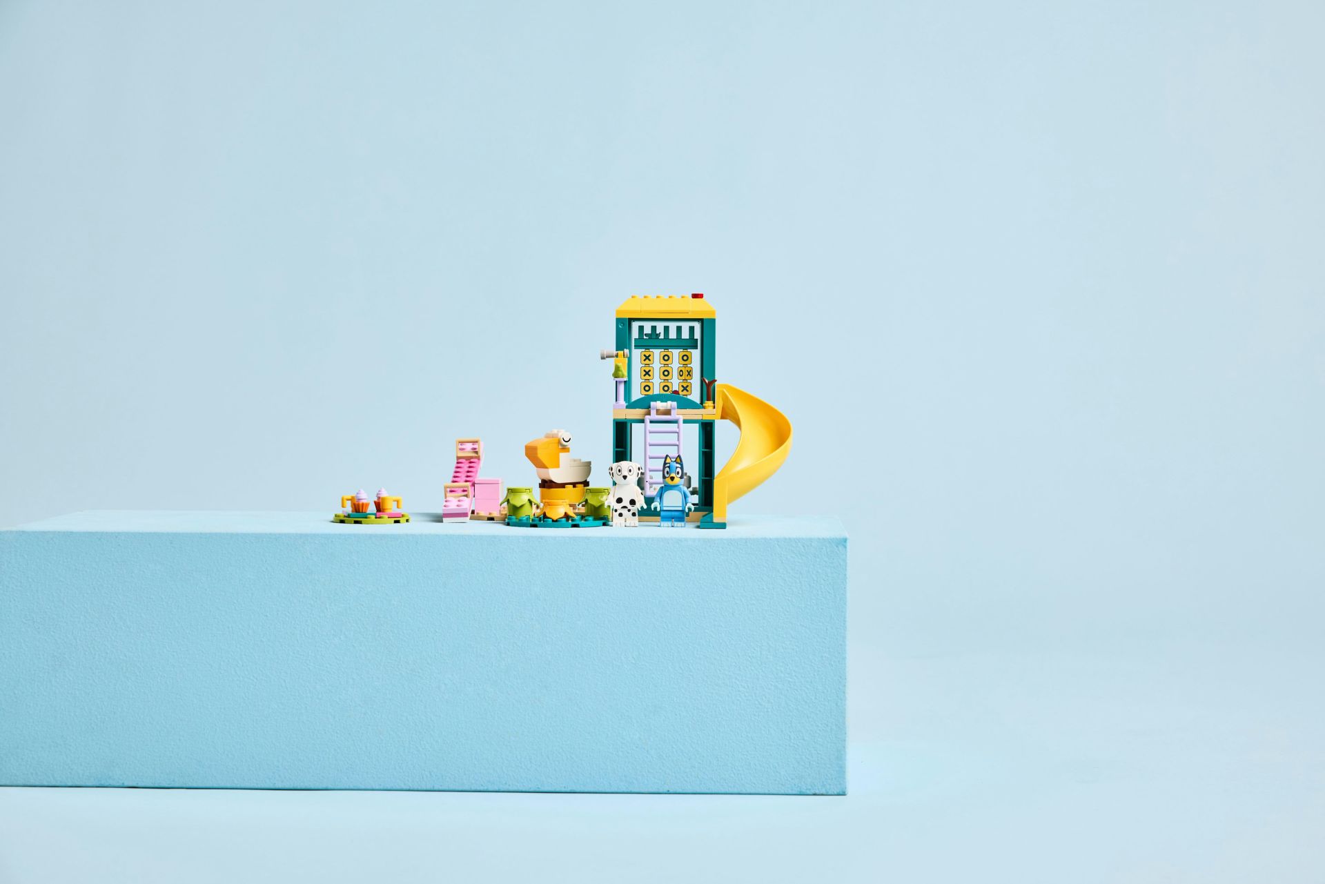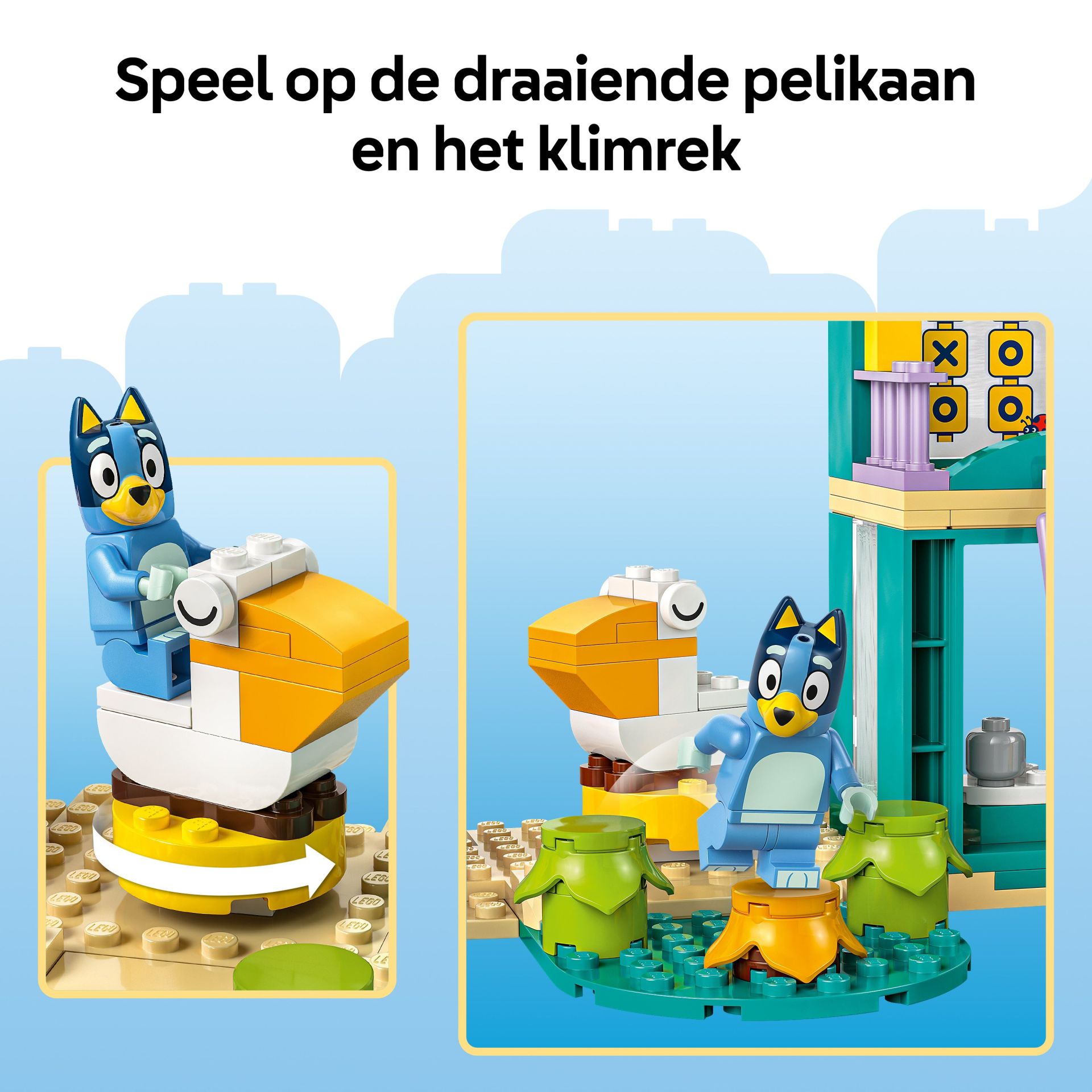 Veel manieren om te spelen – er is een draaiende pelikaan om op te zitten, 3 planten waar de Bluey personages op kunnen springen, een toren met een telescoop en een picknickgedeelte met drankjes en cupcakes