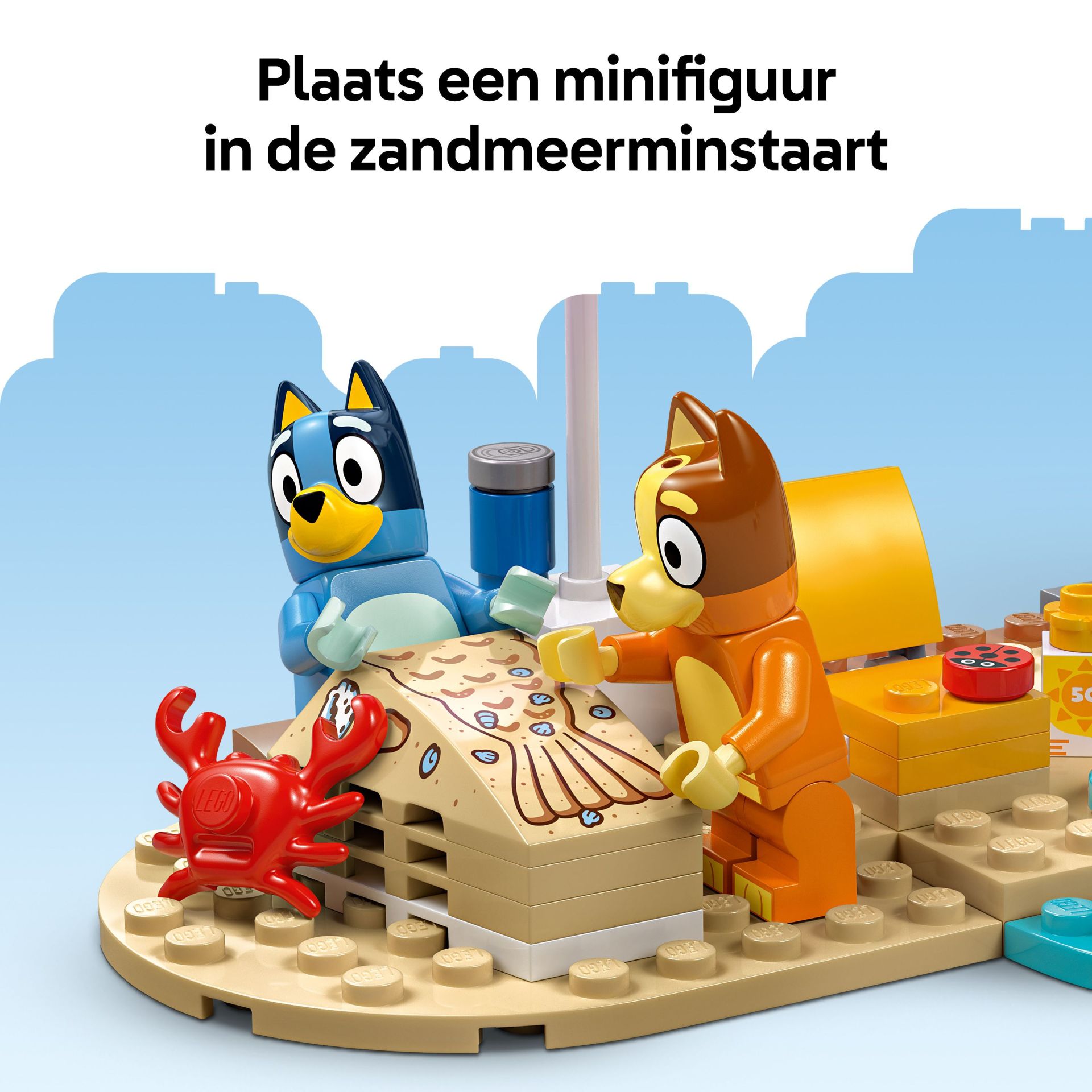 Dit LEGO® speelgoed bevat de bekende auto uit de tv-serie Bluey, met 2 surfplanken bovenop en een kofferbak aan de achterkant om de koelbox in op te bergen. Het dak kan open en er zijn zitplaatsen voor de minifiguren van Bluey, Bingo en Chilli (Bluey's moeder). Een indrukwekkend zandkasteel, een zandmeerminstaart waar een minifiguur in past, een strandstoel, een parasol en een palmboom zorgen voor fantasierijk speelplezier. Accessoires zijn onder andere een krab, een ijsje, een zonnebril en zonnebrandcrème.