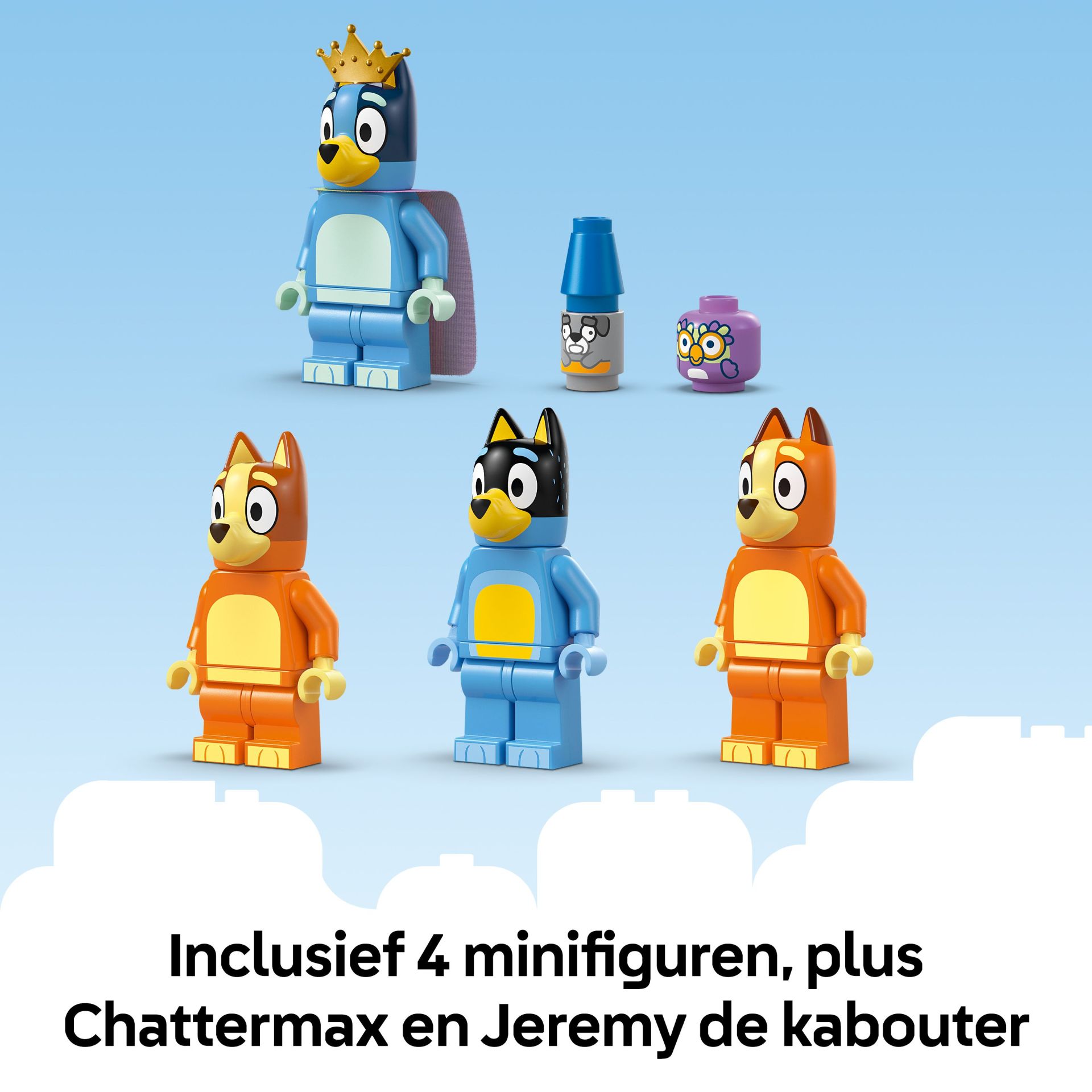 Het modulaire speelhuis bevat 4 minifiguren van Bluey, Bingo, Chilli (Bluey's moeder) en Buster (Bluey's vader) en accessoires, waaronder een regenboogcape, toverstaf en vergrootglas. Alle kamers zijn uitneembaar. In de speelkamer staan een poppenhuis, piano en kraampje met eten. De keuken heeft een koelkast, oven, fornuis, tafel en stoelen. Boven is de slaapkamer van mama en papa en een badkamer. De slaapkamer van Bluey en Bingo op zolder heeft een kleed, een lamp en een figuur van Babbel-uil. Naast de deur staat de troon van de koningin, compleet met theepot, kopje en kikker. In de tuin vind je een grote boom, hotdog, pizza, waterkraan, Gerritje en een ballon.