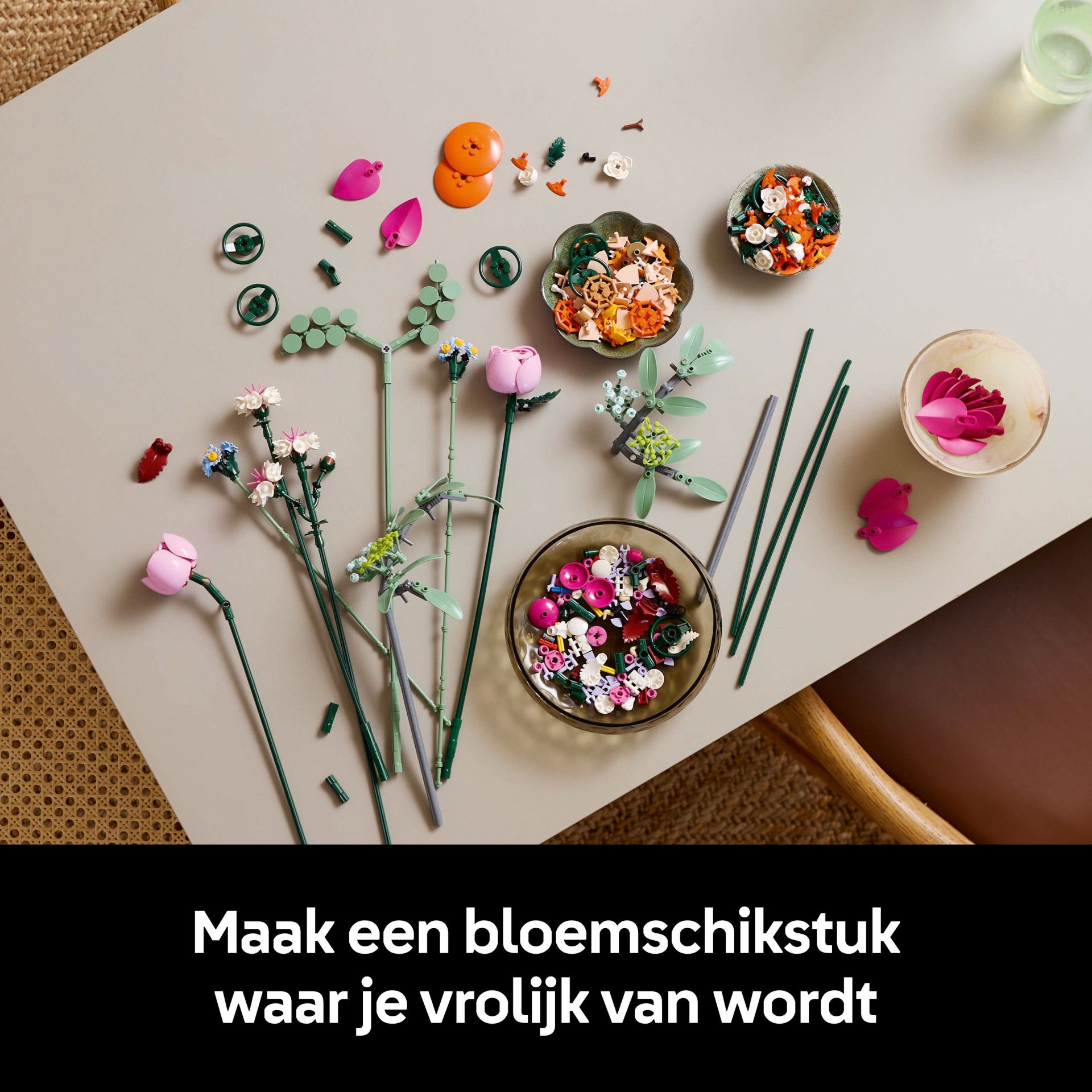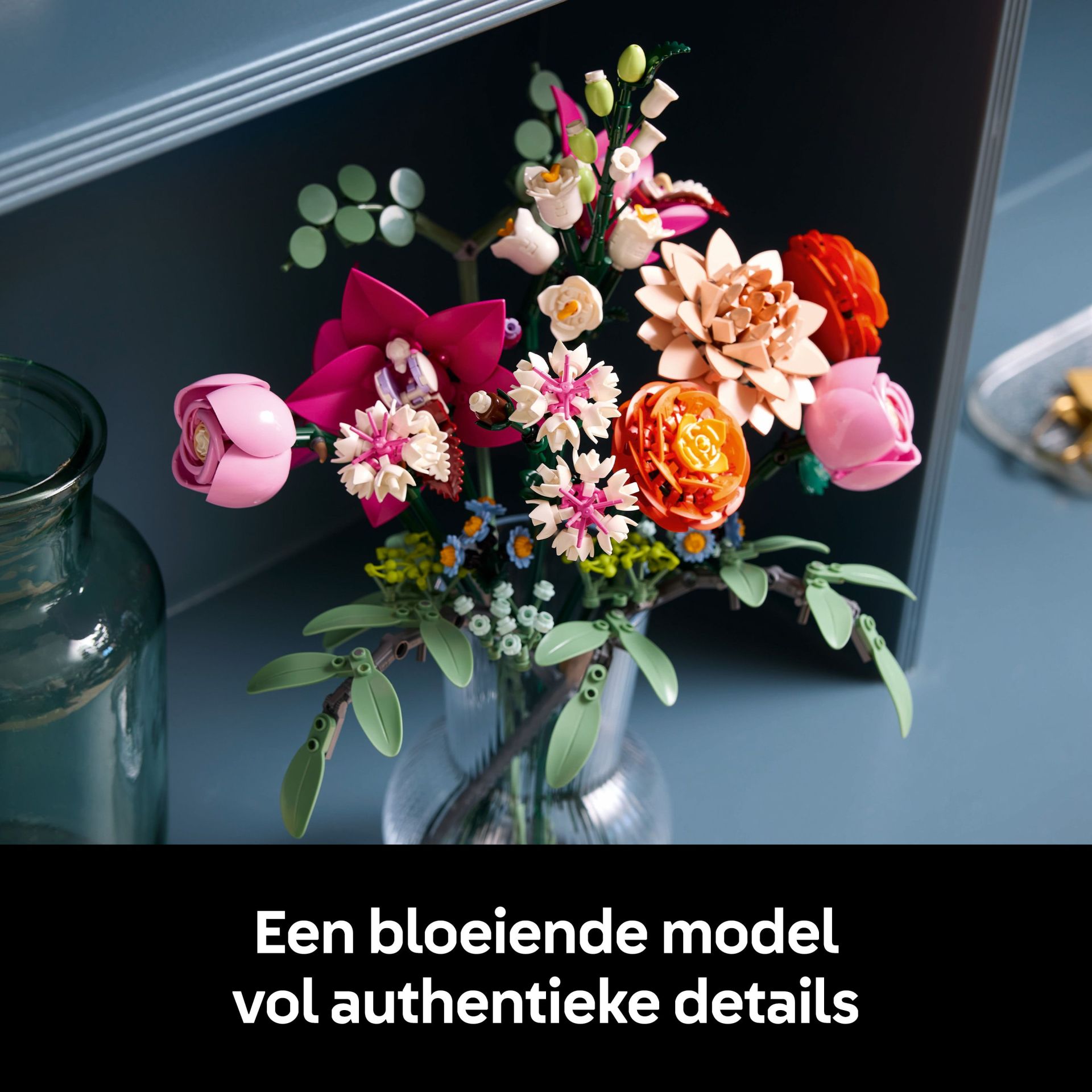 Beginnende bloemisten kunnen zich ontspannen en tot rust komen terwijl ze het boeket bouwen dat bestaat uit 15 LEGO bloemenstelen, waaronder madeliefjes, korenbloemen, eucalyptus, vlierbloesems, rozen, ranonkels, orchideeën, een waterleliedahlia en een campanula. Alle stelen zijn verstelbaar om bouwers aan te moedigen een persoonlijk boeket samen te stellen dat ze kunnen gebruiken als decoratie voor thuis of op kantoor. De bloemen kunnen ook worden gecombineerd met andere LEGO boeketten (apart verkrijgbaar) om een groter, uniek bloemendisplay te creëren.