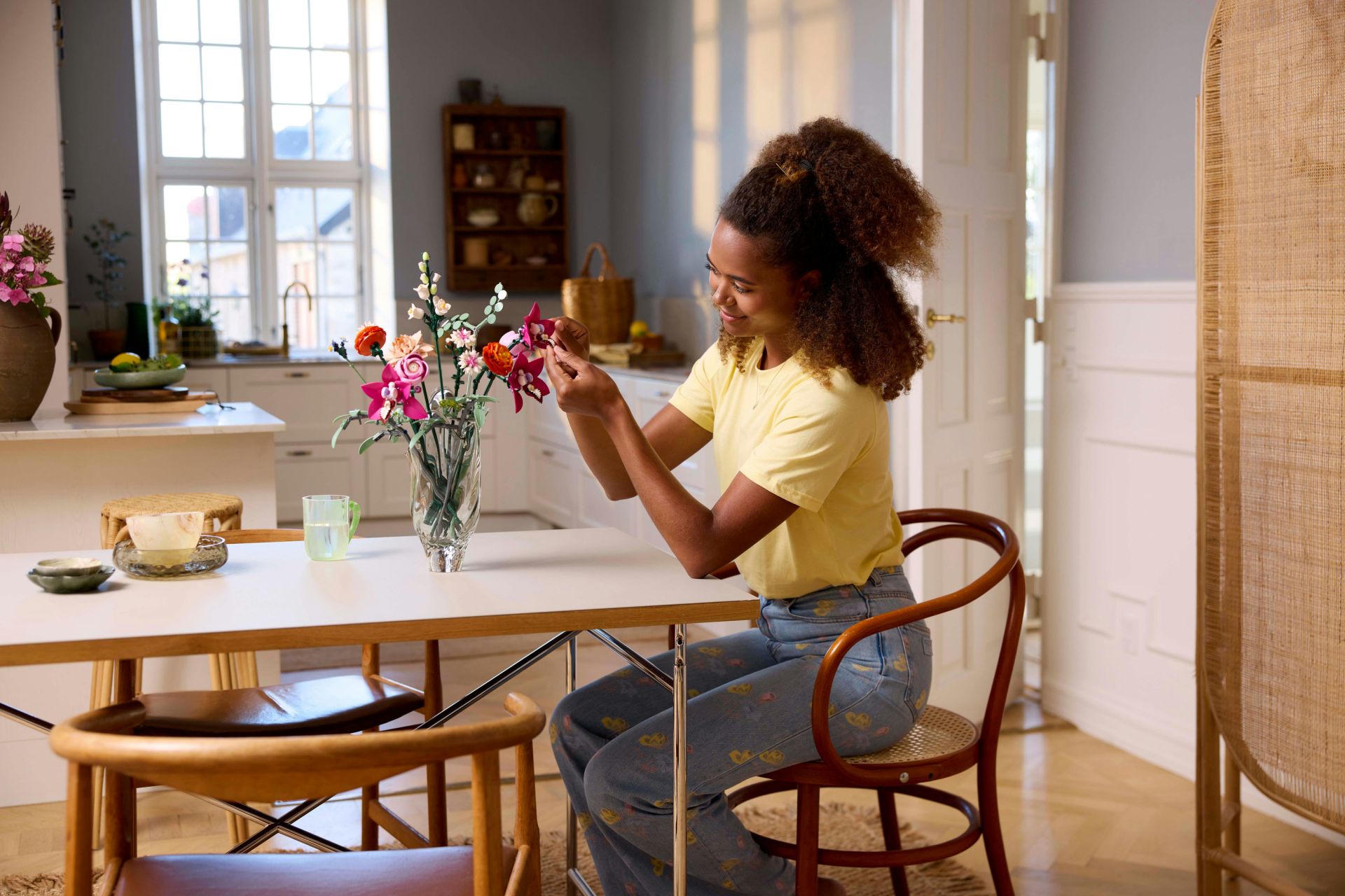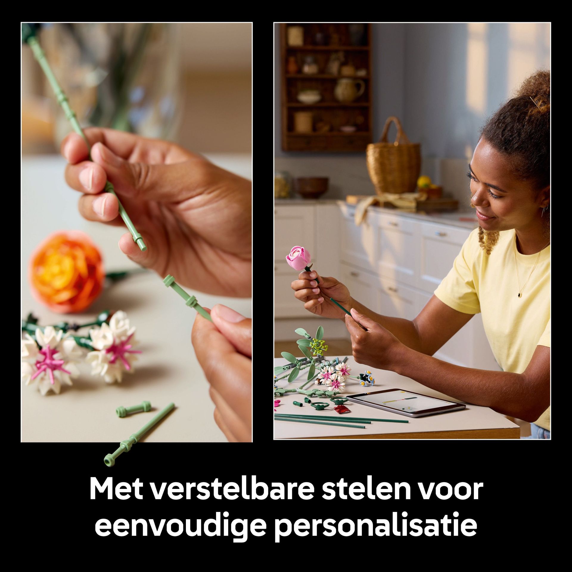Schik het boeket – elke LEGO® bloem heeft een verstelbare steel, zodat bouwers een persoonlijk boeket kunnen maken door hun creatie te schikken en te herschikken