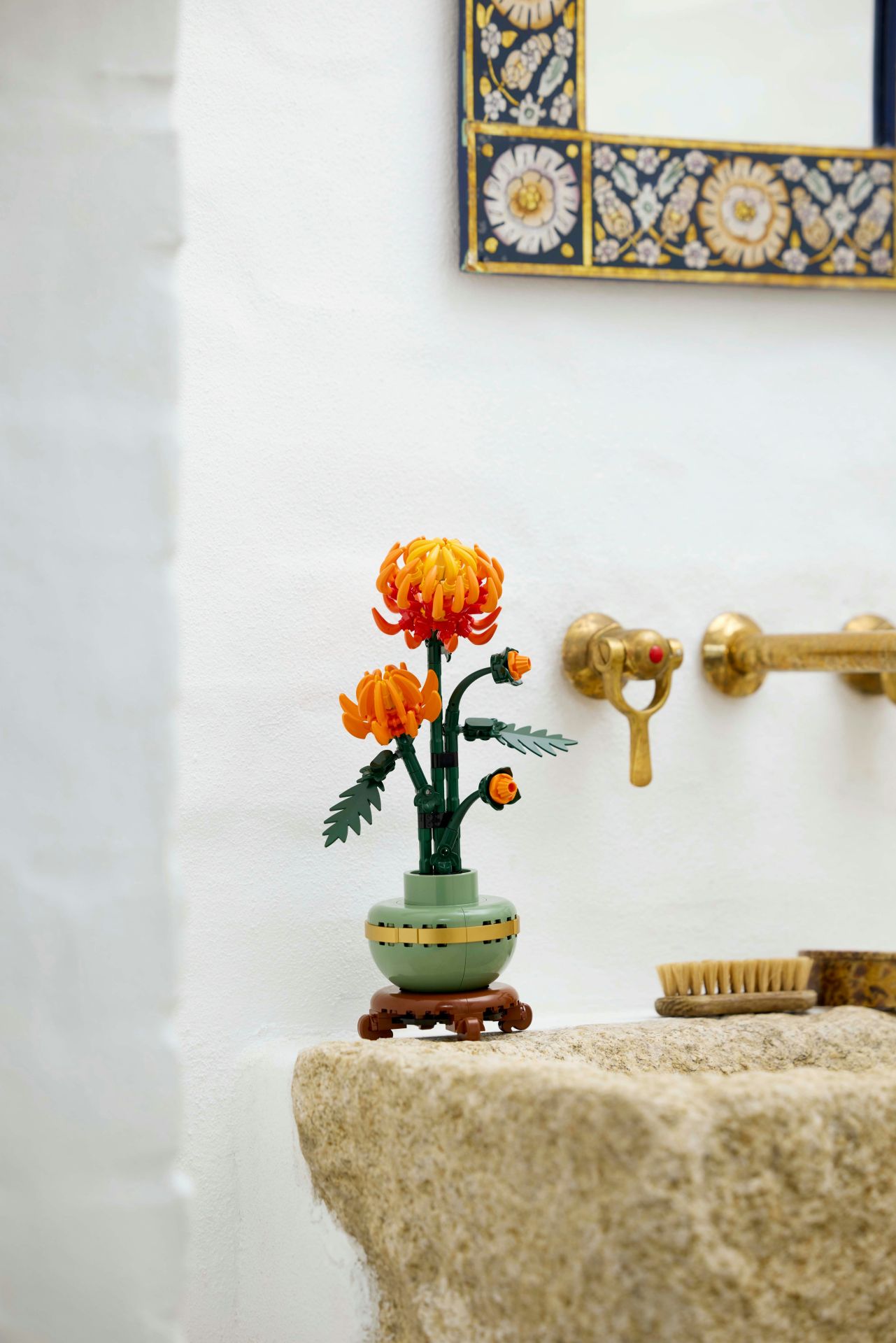 Deze gedetailleerde replica met verstelbare bladeren en bloemblaadjes legt de levendige oranje bloem in de knop, bloeiend en in volle bloei vast in een pastelgroene bloempot, versierd met een gouden sierrand op een sokkel met houteffect. De chrysant is eenvoudig in elkaar te zetten en vormt een elegante blikvanger voor elke kamer. Zet het model neer naast andere sets uit de LEGO Botanische Collectie (apart verkrijgbaar).