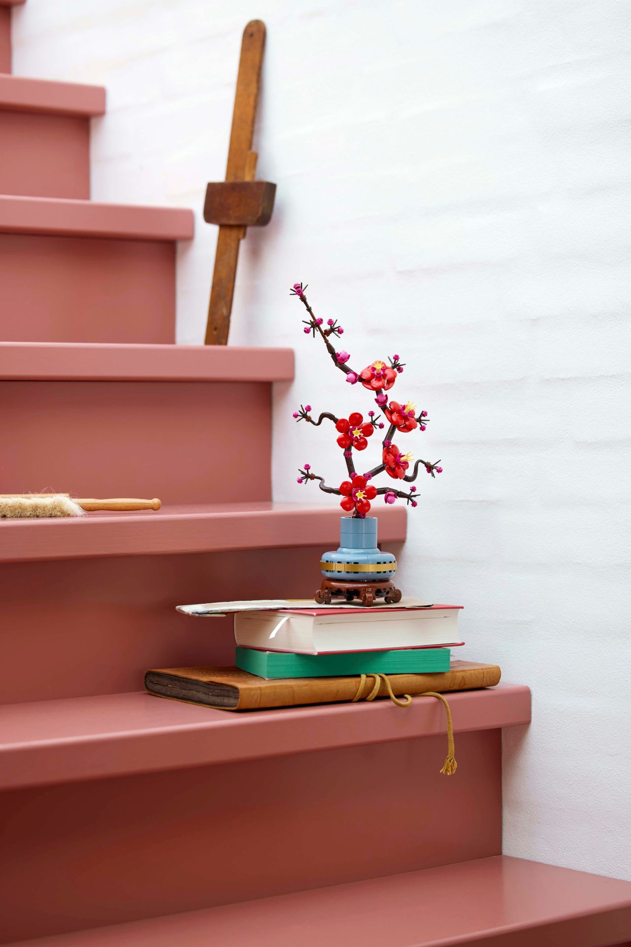 Gedetailleerde LEGO® bloemenset voor beginnende en ervaren bouwers – deze LEGO interpretatie van een Japanse abrikoos heeft een elegante houtachtige stengel en levendige rode en magenta bloemblaadjes