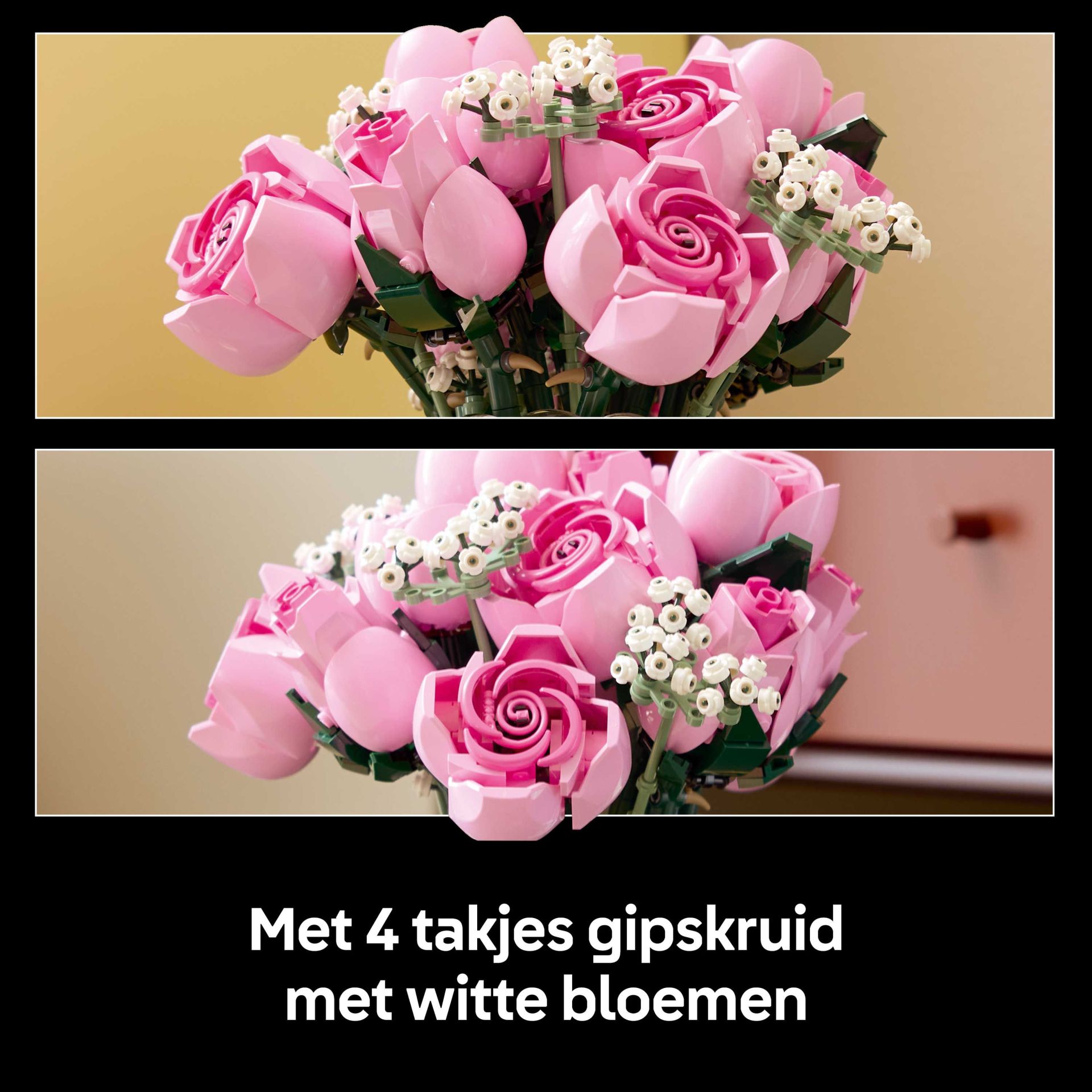 LEGO ROZEN – de set bevat 4 rozen in volle bloei, 4 rozenbloesems en 4 rozenknoppen, plus 4 takjes gipskruid met witte bloemetjes