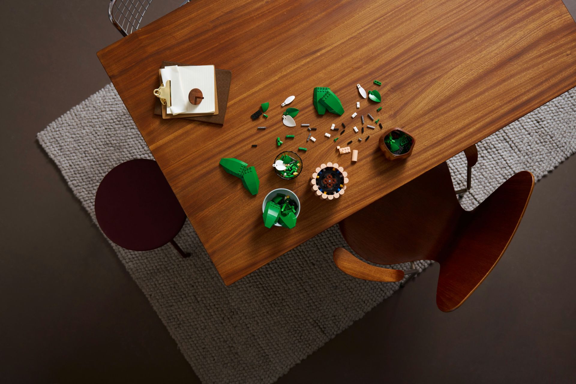 WOONDECORATIE – zodra het bloemstuk af is, kun je de LEGO kunstplant set met de standaard neerzetten als een tijdloos natuuraccent in huis of op kantoor