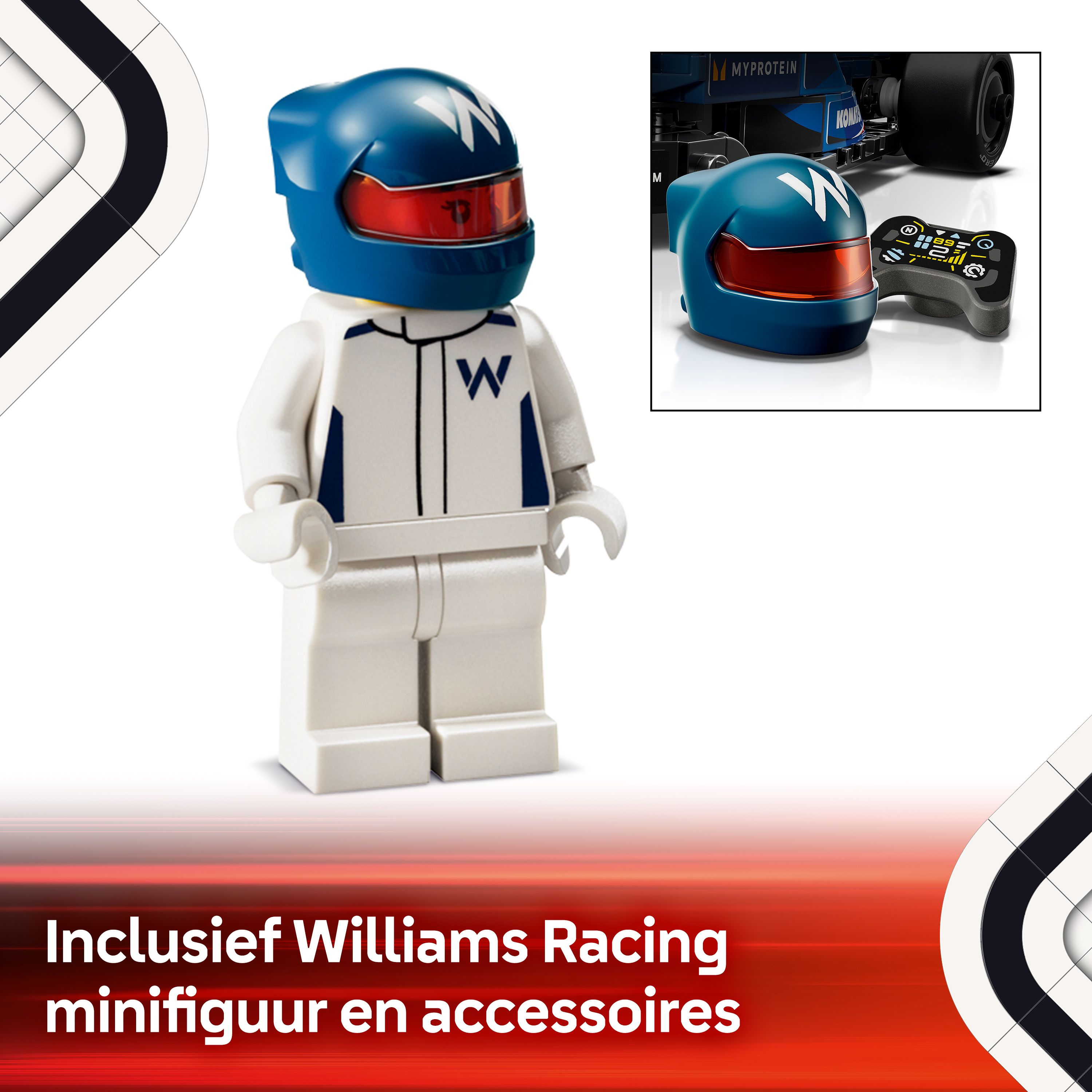 De bouwbare F1 speelgoed auto wordt ook geleverd met een minifiguur van een F1 coureur in een Williams Racing outfit en een helm om in de cockpit te plaatsen en mee te racen. Met LEGO Speed Champions sets kunnen kinderen en racefans modellen bouwen van een aantal van de meest iconische voertuigen ter wereld, waaronder andere Formule 1 auto's (apart verkrijgbaar) uit het kampioenschap van 2024.