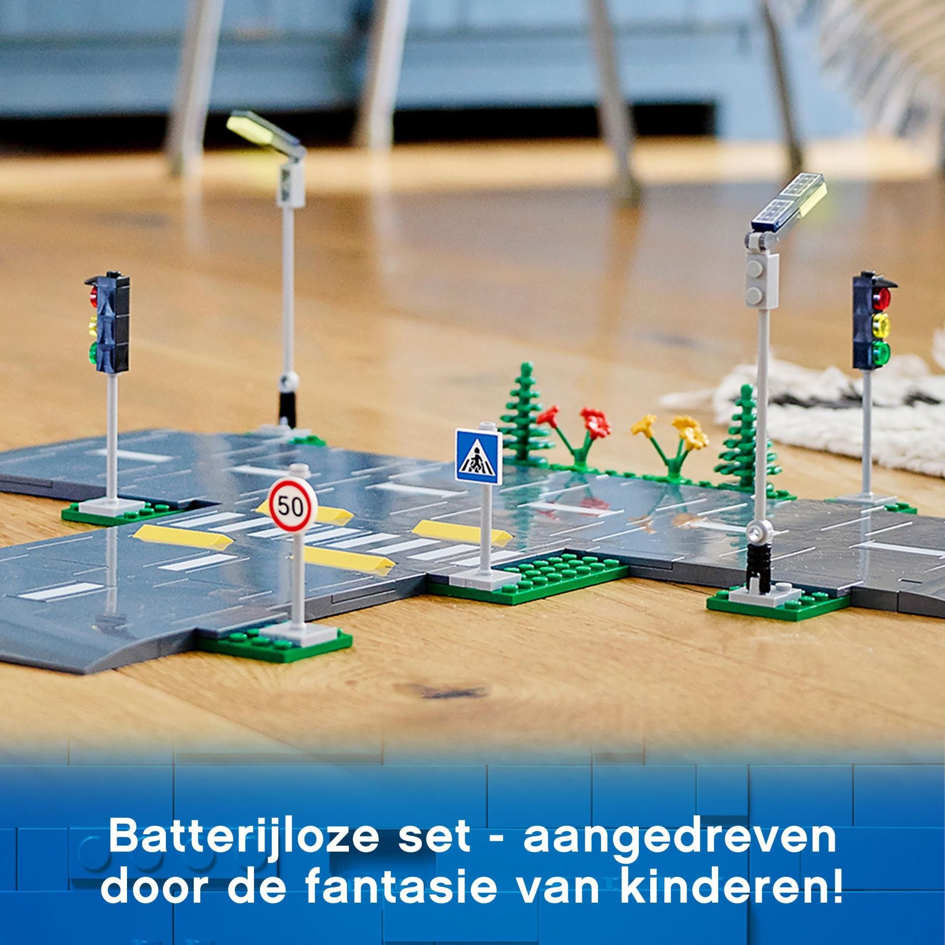 - Wat zit er in de doos? Kinderen krijgen 5 LEGO® City Wegplaten met wegmarkeringen, verkeersdrempels en een zebrapad, plus lantaarnpalen die oplichten in het donker, stoplichten, verkeersborden, bomen en planten.